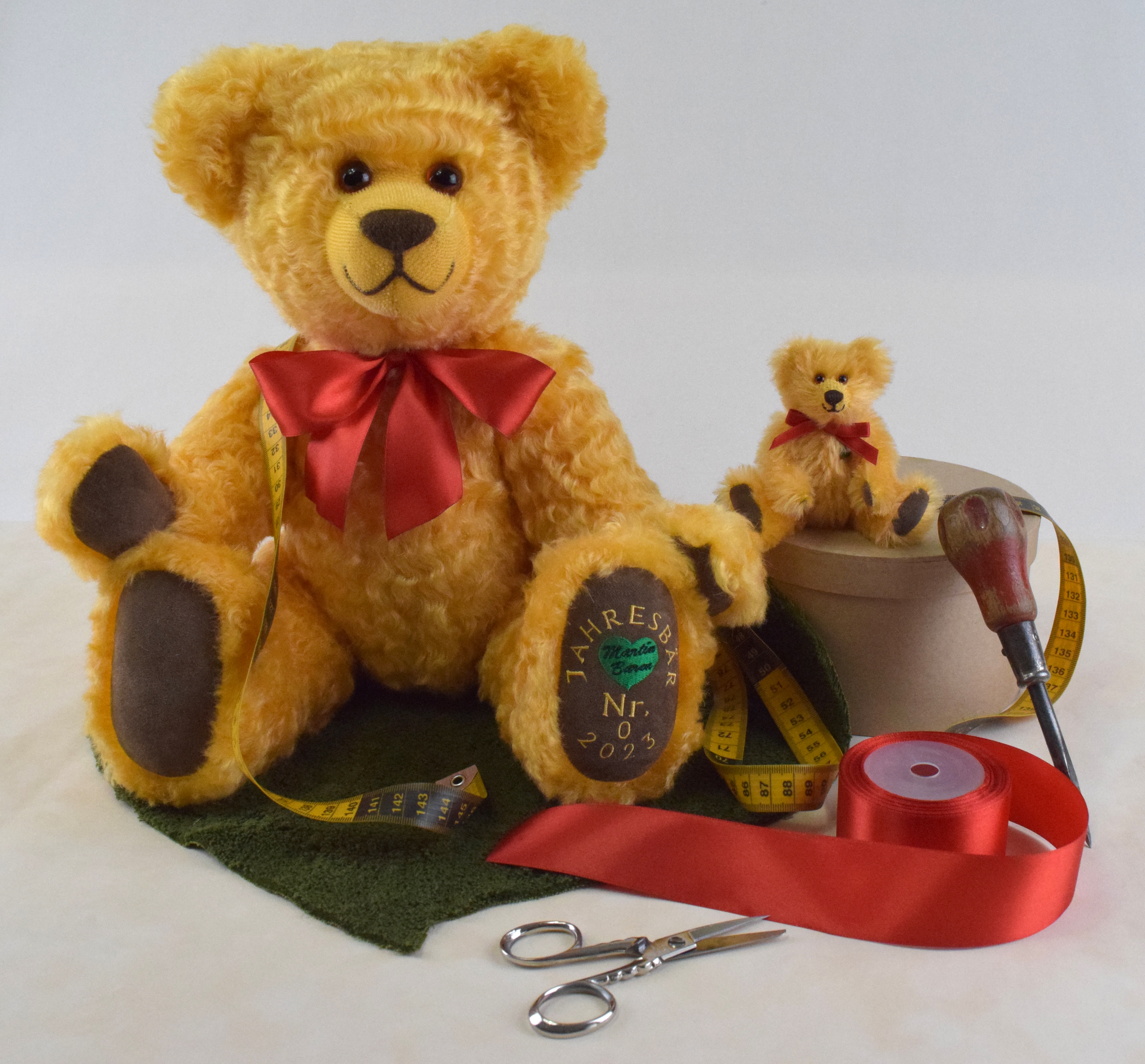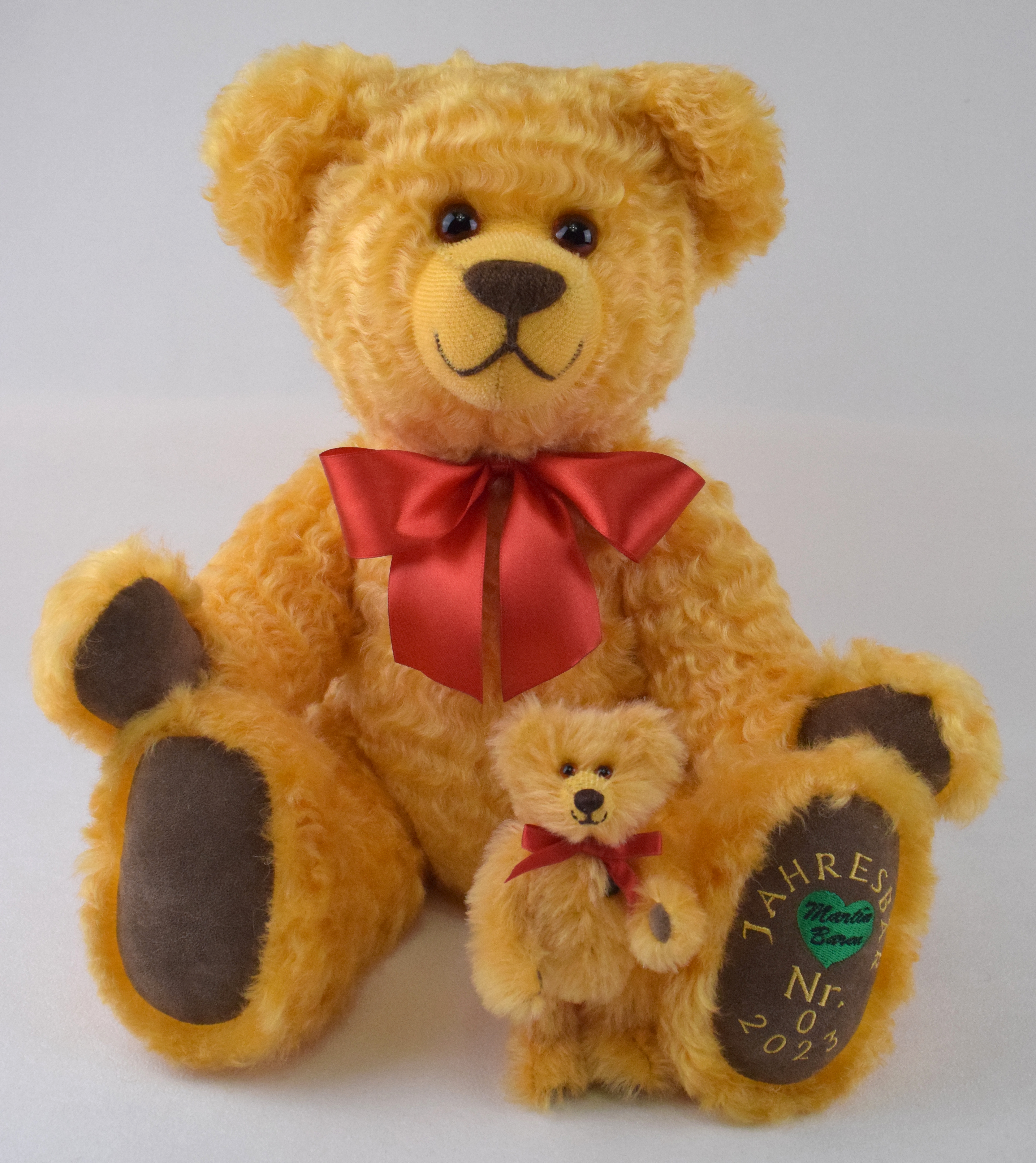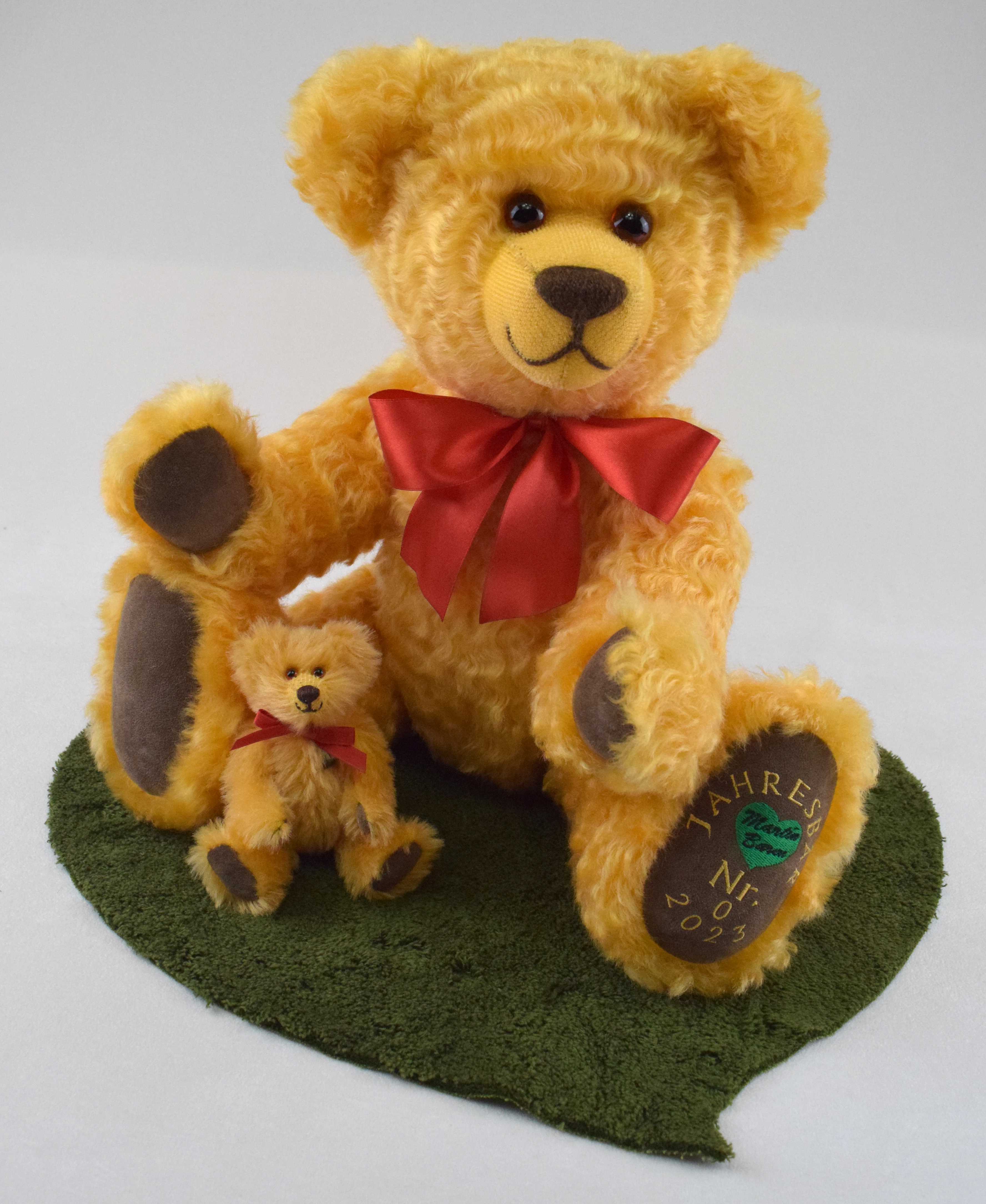 Der freundliche Mini Jahresbär 2023 ist 12cm groß und aus honigfarbenem Mohair hergestellt. Er ist mit Vlies gefüllt, trägt eine rote Schleife und hat eine braune Nasenbestickung. Sohlen und Pfoten sind aus braunem Waschleder. Er sieht seinem großen Vorbild, dem Jahresbär 2023, ähnlich.