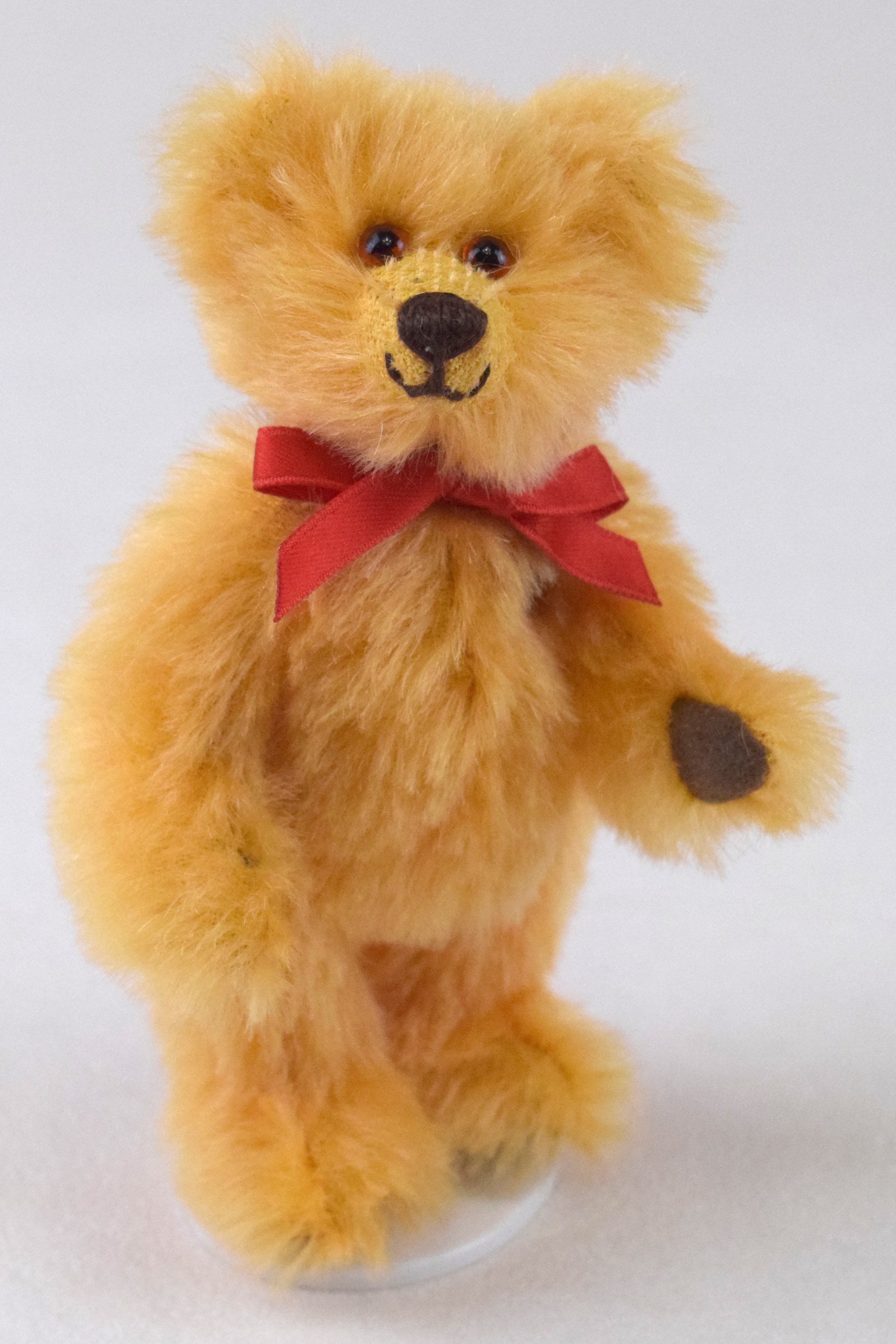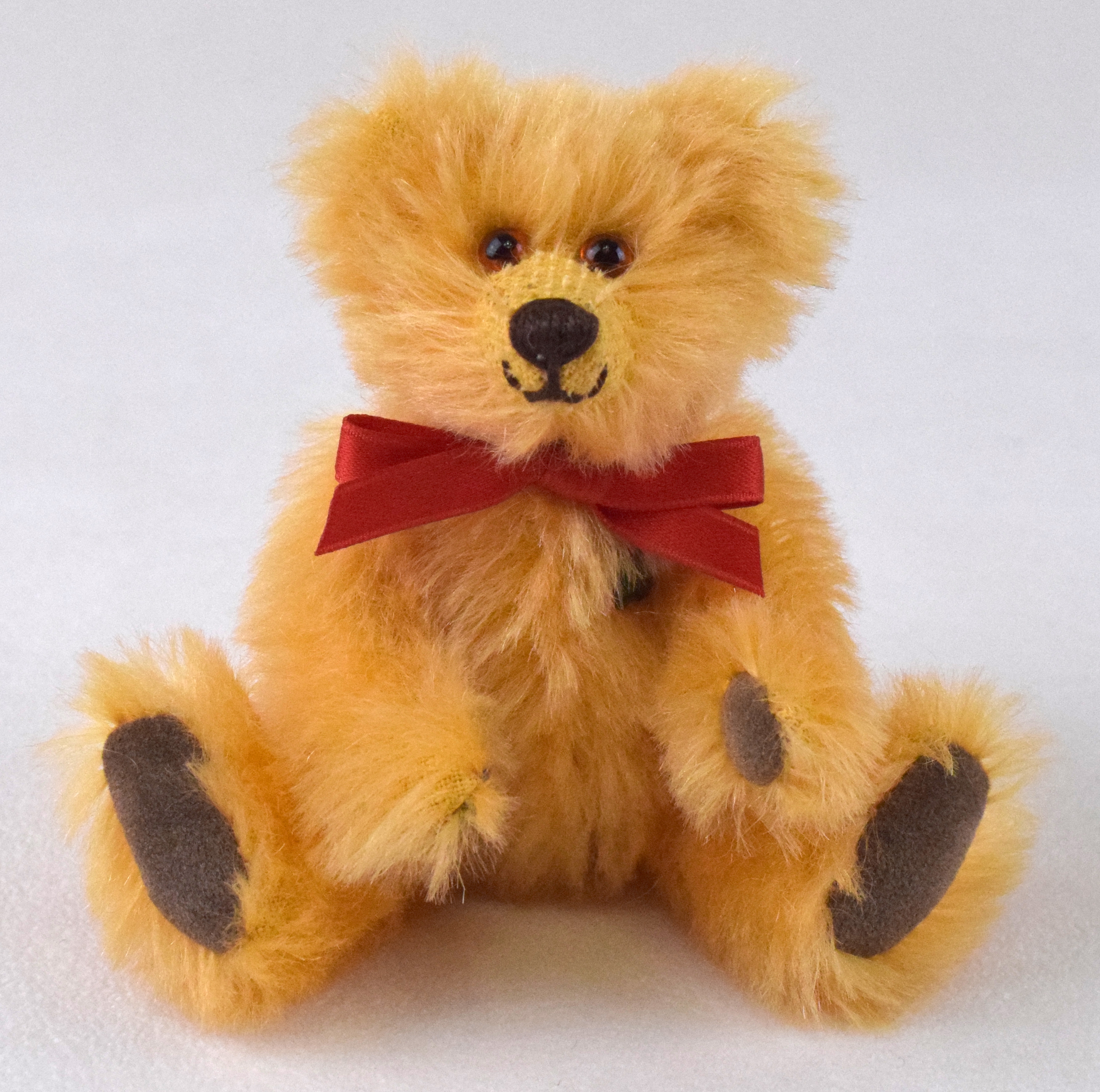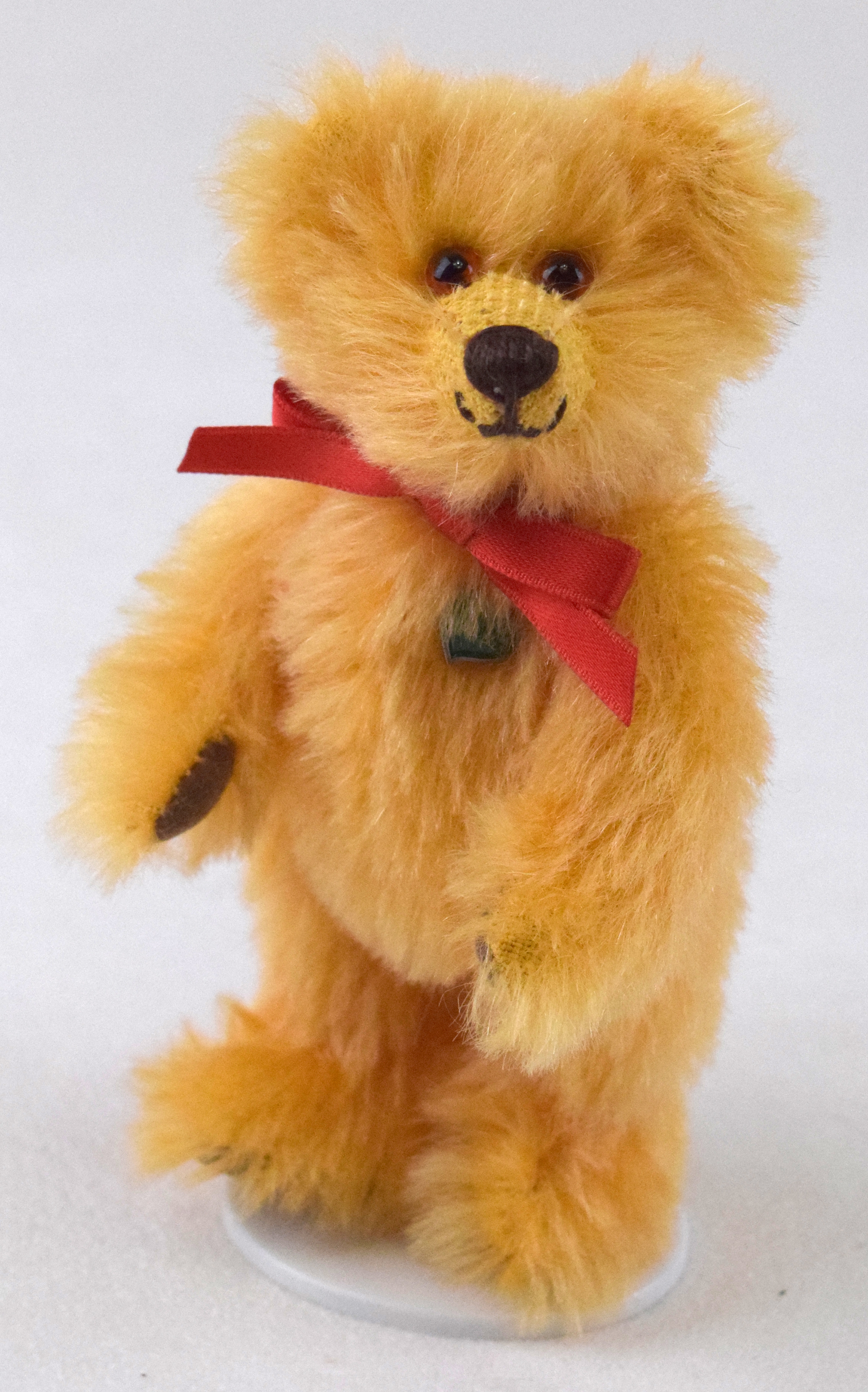 Der freundliche Mini Jahresbär 2023 ist 12cm groß und aus honigfarbenem Mohair hergestellt. Er ist mit Vlies gefüllt, trägt eine rote Schleife und hat eine braune Nasenbestickung. Sohlen und Pfoten sind aus braunem Waschleder. Er sieht seinem großen Vorbild, dem Jahresbär 2023, ähnlich.