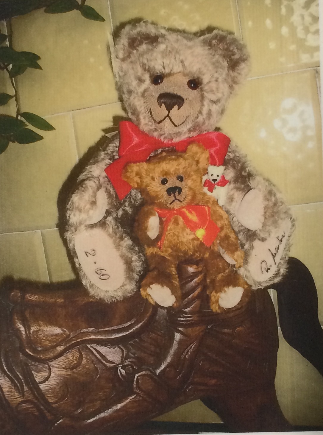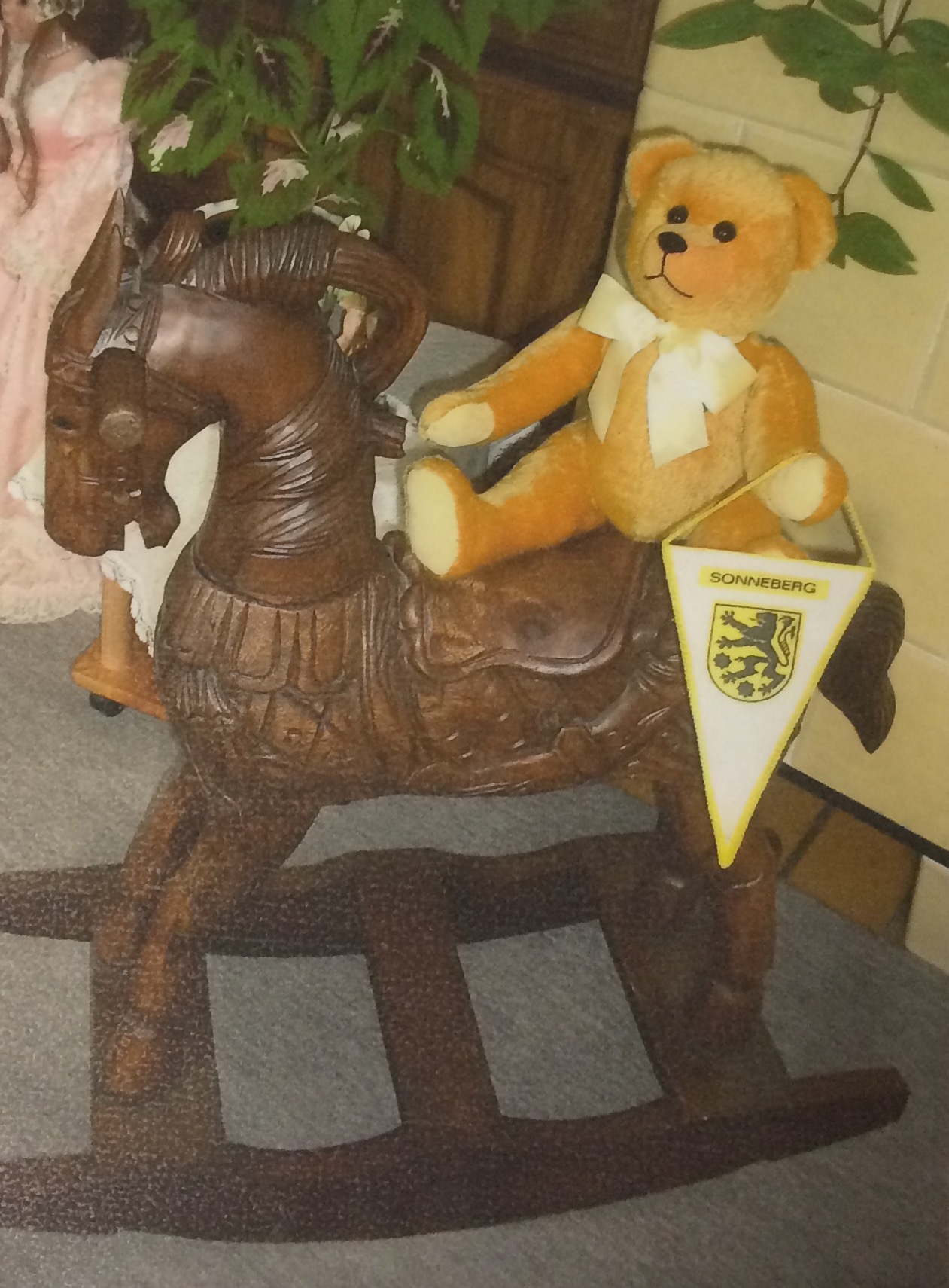 Am Samstag, 02.04., hatte mich mein Mann total überrascht mit der Fahrt nach Sonneberg zu Ihnen. Sie haben uns so herzlich empfangen im Teddybärenhaus mit Herz. Ach war das schön, diese vielen Teddys wiedersehen zu können. War es doch schon so lange mein sehnigster Wunsch. Ich konnte mich nicht satt sehen an diesen lieben Gesellen. So etwas Liebes! Es war einfach toll! Diese Freude hält heute noch an und es wird auch länger so bleiben. Ich liebe Teddybären. Manchmal ertönt ein lautes Lachen durch unser Haus. Da knuddle ich den Großen Gerd. Dieser Teddybär ist ja sehr groß und ich bin nur eine kleine Person. Ich lege ihn auf mein Bett und muss immer wieder lachen. Das sind Glücksmomente für mich und mein Herz lacht mit. Dieser schöne Teddybär wird auf dem niedlichen Schaukelpferdchen sitzen. Das ist so herzig anzusehen. Mein jüngster Sohn hat mir diesen Teddy geschenkt und ich freue mich immer wieder. Mein Mann ist ein liebevoller Mensch. Er mag ja auch die Teddybären. Das Schaukelpferdchen ist wunderschön. Habe Bilder gemacht und Ihnen hier mitgeschickt.