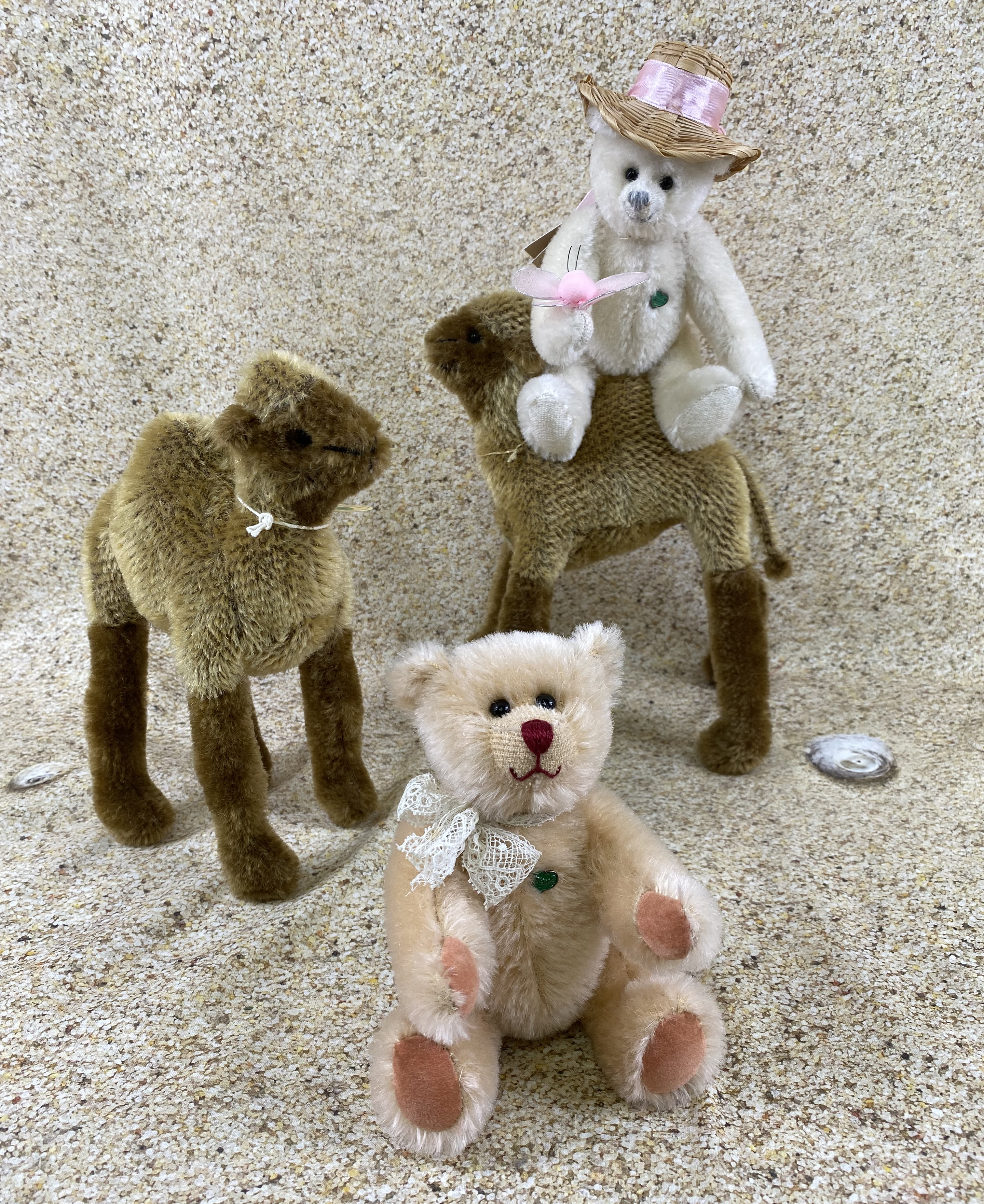 "Ihr braucht keine Angst haben vor den Kamelen, die tun euch nichts, möchten nur gestreichelt werden von euch." Sagte ein junger Mann. "Wenn ihr möchtet, könnt ihr mal darauf reiten." Die Bärchen waren noch etwas ängstlich, wollten es aber gerne ausprobieren. Sie halfen sich gegenseitig aufzusteigen. Alle hatten Spaß dabei, freuten sich und waren stolz auf sich, dass sie so mutig sind. "Wenn unsere Freunde zu Hause das sehen könnten", meinte Sanny. Die jungen Männer machten ein paar Fotos. "Wir müssen jetzt weiter, haben noch viel vor." Sagte Baldur. Die Teddys machten sich wieder auf den Weg.