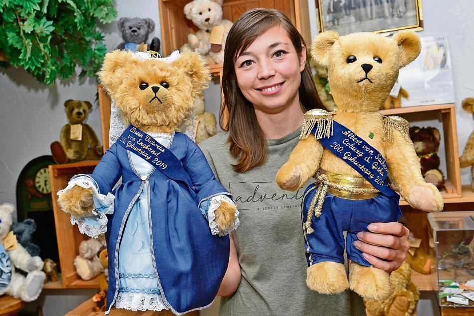 Mit dabei ist auch die Sonneberger Unternehmerin Sina Martin. Seit 2009 ist sie die Chefin von Martin Bären im Herzen der Sonneberger Innenstadt. Bereits im Vorfeld des ersten Treffens hat sich die 29-Jährige Gedanken gemacht, was ihr Haus zum Jubeljahr beitragen könne. Herausgekommen sind Albert und Victoria in Bärenform - ein hübsches, kuschliges Pärchen in königsblau mit golden bestickter Schärpe, Kleid und Schleier aus Spitze. Den Kleidungsstil haben sich die Macher der Teddybär Manufaktur von einem historischen Foto abgeschaut. "Ich dachte, es wäre schön, wenn man in der Produkt-Werkstatt über das Prinzenpaar redet auch wirklich eines dabei zu haben", beschreibt Sina Martin ihre Motivation. "Die gehen auf jeden Fall in Serie", fügt sie an.