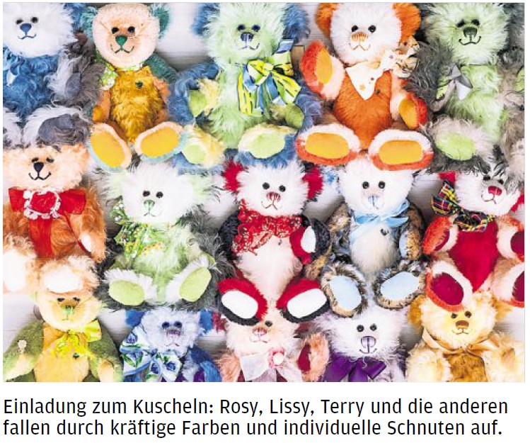 Ein Teddy ist nicht bloß Kuschelfaktor und Talisman, Seelentröster und Kunstgut. Er ist auch Ware. Das Geschäft läuft nicht von selbst. Sina Martin muss sich was einfallen lassen. Sie verschickt regelmäßig 4 000 Briefe an Stammkunden und andere Bärenfreunde. Sammeln kann auch dann zur Sucht werden, wenn Angoraziegen ihr Haar lassen. Es wird in Baumwollstoff eingewebt. So entsteht Mohairplüsch, gefärbt, geschnitten, geknautscht. Fast die Hälfte verkauft die Chefin übers Internet.