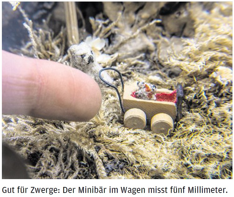 Ihre Oma Trude inszenierte das Volk im Museum wie auf der Bühne. Cowboybären galoppieren durch eine Wildwestlandschaft, vorbei an Planwagen mit Kutscherbären und Indianerbären mit echtem Federschmuck vor dem Wigwam. Die nächste Szene zeigt Teddys beim doppelten Salto in der Zirkuskuppel. Als Schüler lümmeln sie in den Bänken und tun interessiert. Reizende Strickpullis übrigens. In einer Vitrine fährt ein winziger Bär einen noch winzigeren Bären im Kinderwagen spazieren. Sohn oder Tochter? Gendergerechtigkeit ist trotz Lupe nicht zu erkennen.