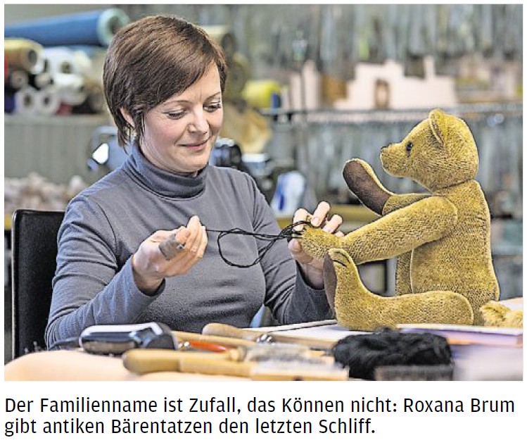 Roxana Brum hält einen Teddy auf dem Schoß und schließt mit schnellen Stichen die Rückennaht. Die Krallen markiert sie mit schwarzer Wolle. Ein paar kräftige Bürstenstriche, und fertig. Der Bär ist ein älteres Modell und hört deshalb auf den Namen Brumm-Antik. Die Augen versprechen ewige Treue. Dafür sorgen Glasbläser aus Lauscha. Der passende Ton kommt aus dem nahen Effelder. „Karl-Tierstimmen“ ist die einzige Firma europaweit, die Bären zu Wort kommen lässt. Auch Kühe, Möwen und Mäuse, Hauptsache, da ist genug Platz. Bären brummen ab Körpergröße 35. Und nein, liebe Bewohner hoch technisierter Kinderzimmer, da ist kein Chip implantiert, da wird nichts ferngesteuert.
