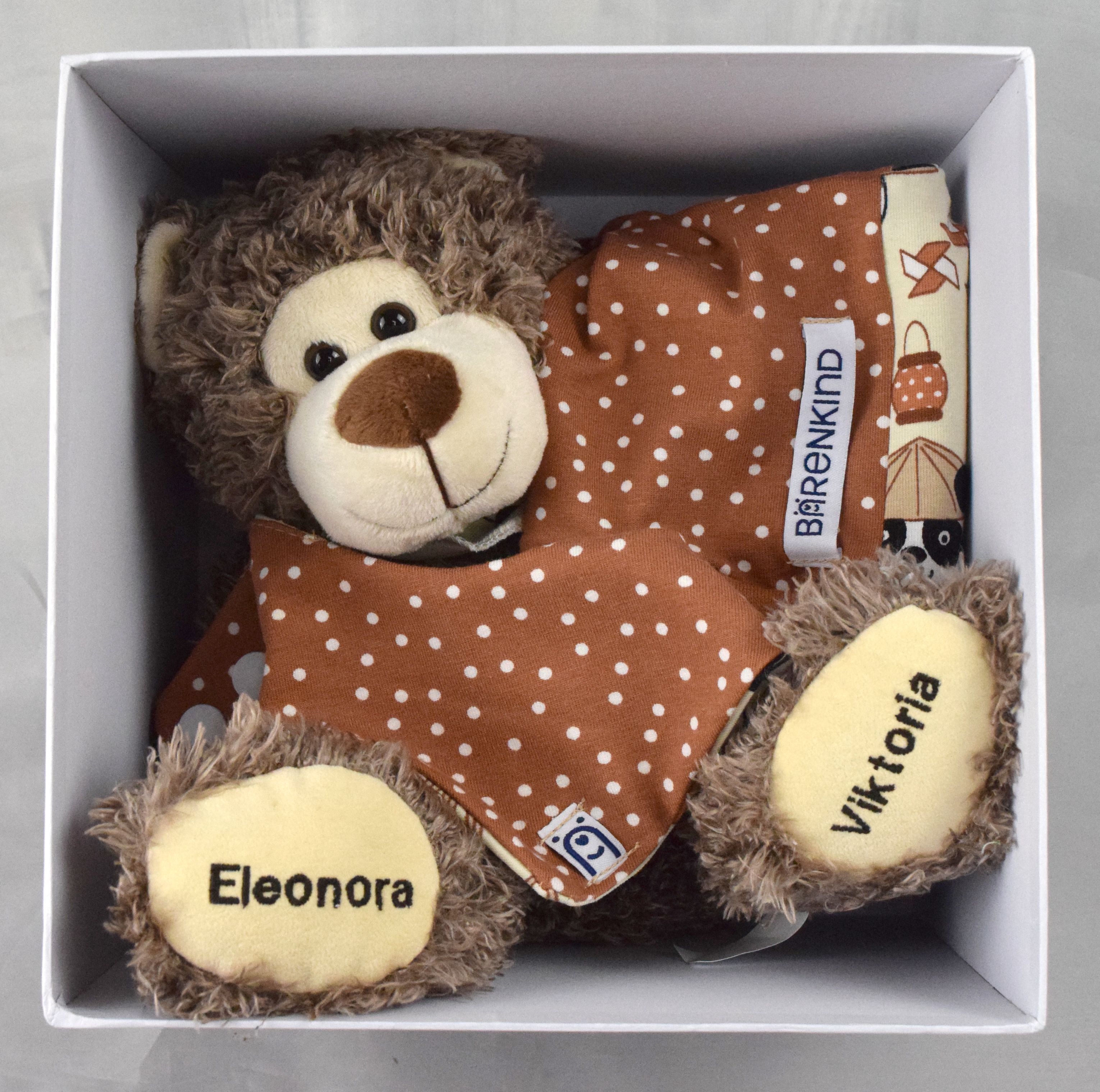 Für uns gehören beide Bereiche zusammen. Wir denken, dass man beide Produktsortimente auch gut miteinander verbinden kann. So freut sich sicherlich jeder über einen bestickten Bären zur Geburt mit Namen und Geburtsdatum. Das Bärchen trägt das gleiche Halstuch, wie es auch das Baby geschenkt bekommt.