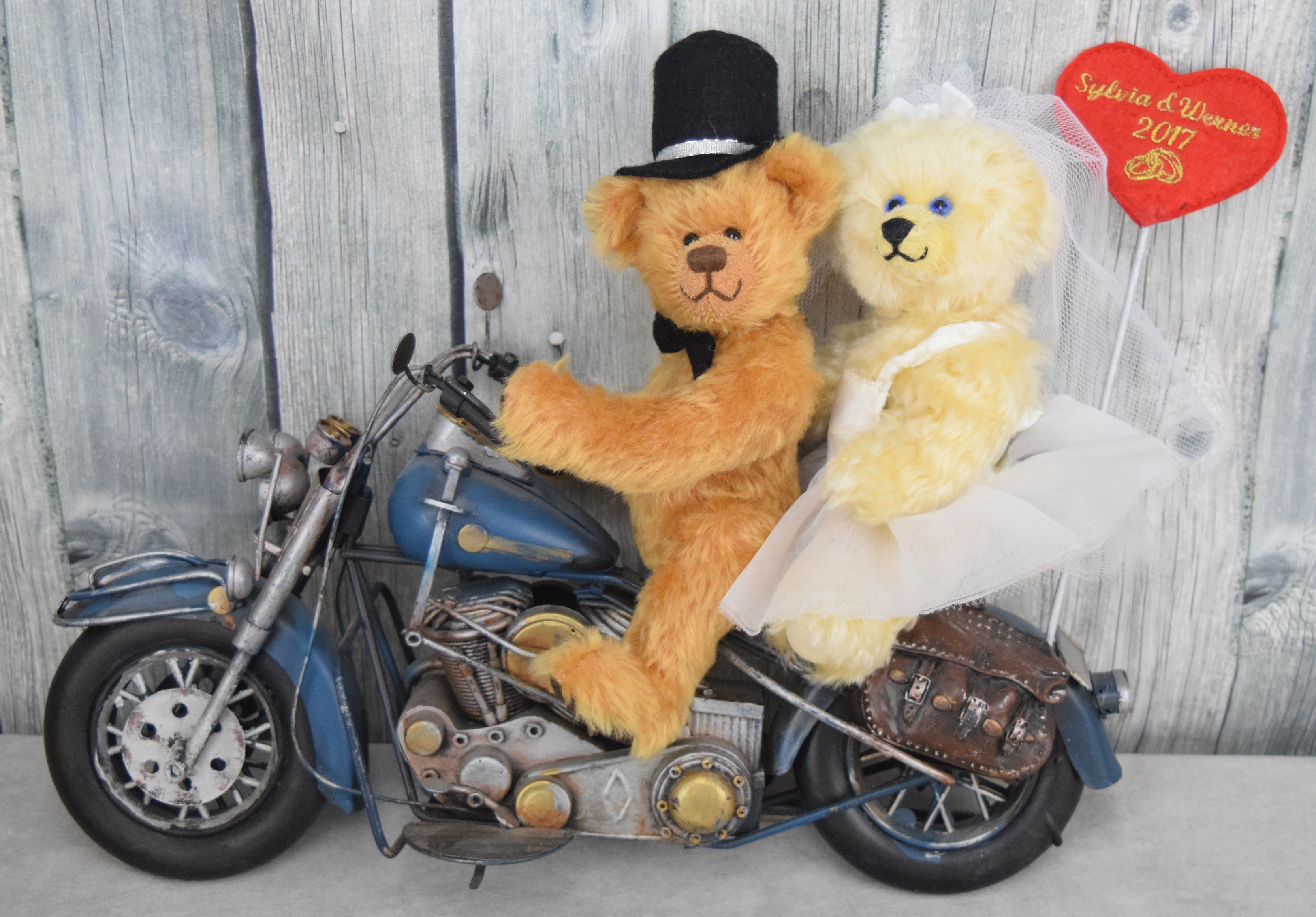 Glück gehabt - unser letztes Miniatur-Motorrad sollte zu einem ganz besonderen Hochzeitsgeschenk werden. Die Idee kam von einer treuen Kundin und regelmäßigen Ladenbesucherin, der das gute Stück ins Auge viel. "Wenn darauf noch ein Teddybrautpaar sitzen würde - das wär doch mal was." Nun müssen noch die glücklichen Teddys in geeigneter Größe gemacht werden und dazu die passende Bekleidung. Die Teddybraut mit ihren schönen blauen Augen bekam einen Schleier und ein weißes Kleid, der Teddybräutigam eine Fliege und Zylinder. Die beiden machen wirklich eine gute Figur auf dem Motorrad und haben Spaß dabei. Als krönender Abschluss wurde noch ein besticktes Herz angebraucht mit dem Namen des Hochzeitspaares. Dieses Geschenk war seine Arbeit wert und wird den frisch Verheirateten bestimmt das ganze Eheleben zur Seite stehen.