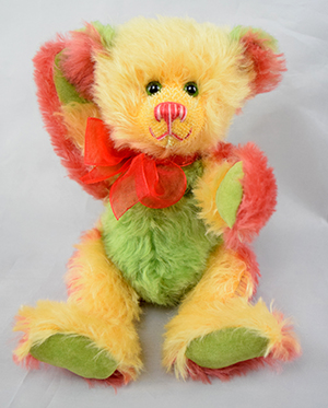 Der farbige Bär ist 22cm groß und durch sein flauschiges Mohairfell sowie der weichen Füllung wunderbar kuschelig. Der kleine Teddybär, der sehr gut in eine Hand passt, strahlt in den hübschen Farben grün, rosa und honiggelb. Als modisches Accessoire trägt das Kuschelbärchen eine rote Schleife.