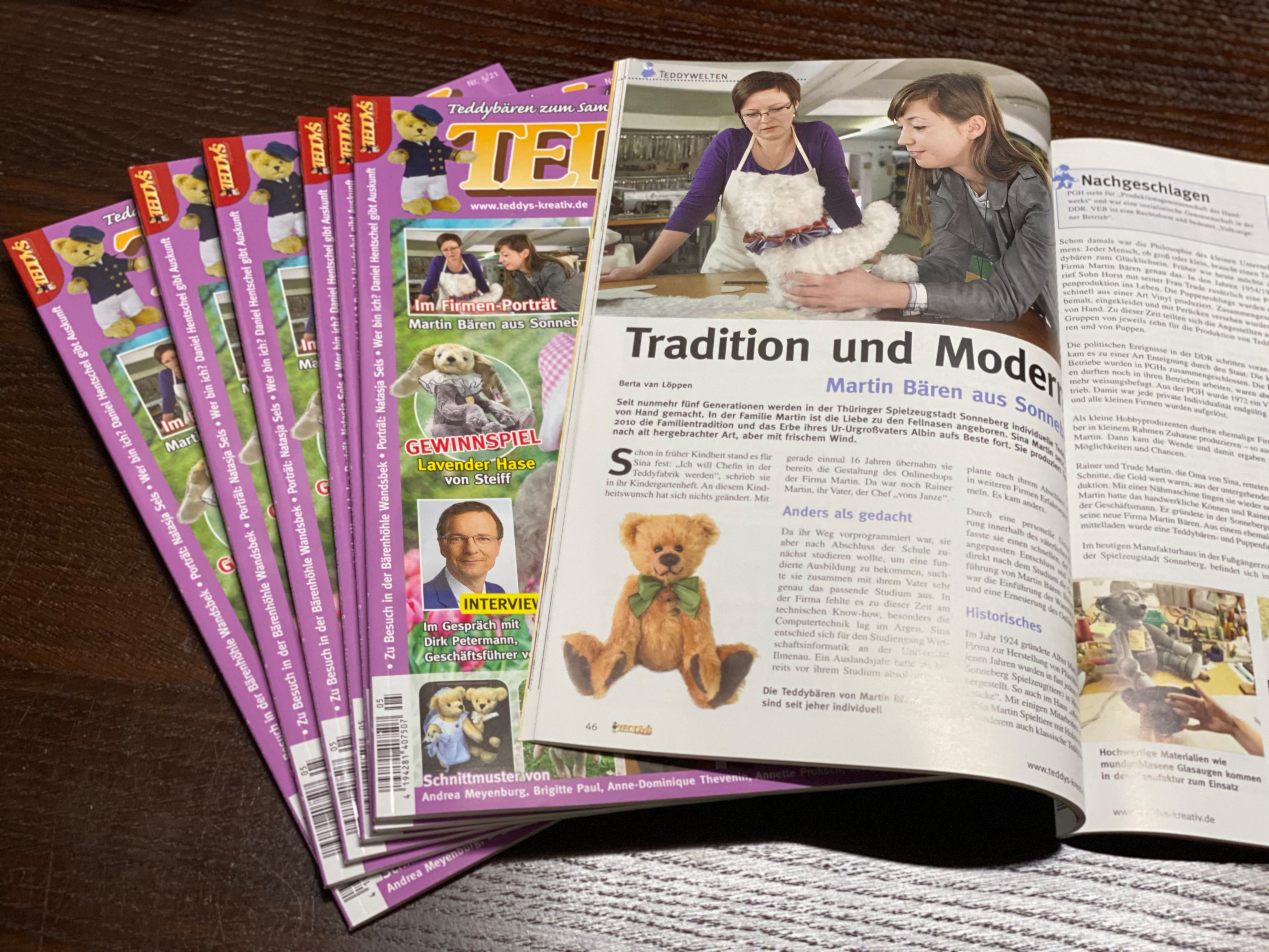 Die Zeitschrift Teddys Kreativ ist die Fachzeitschrift für alle Teddyliebhaber. In der aktuellen Ausgabe gibt es auf 2 Doppelseiten ein schönes Firmen-Porträt über die Martin Bären.