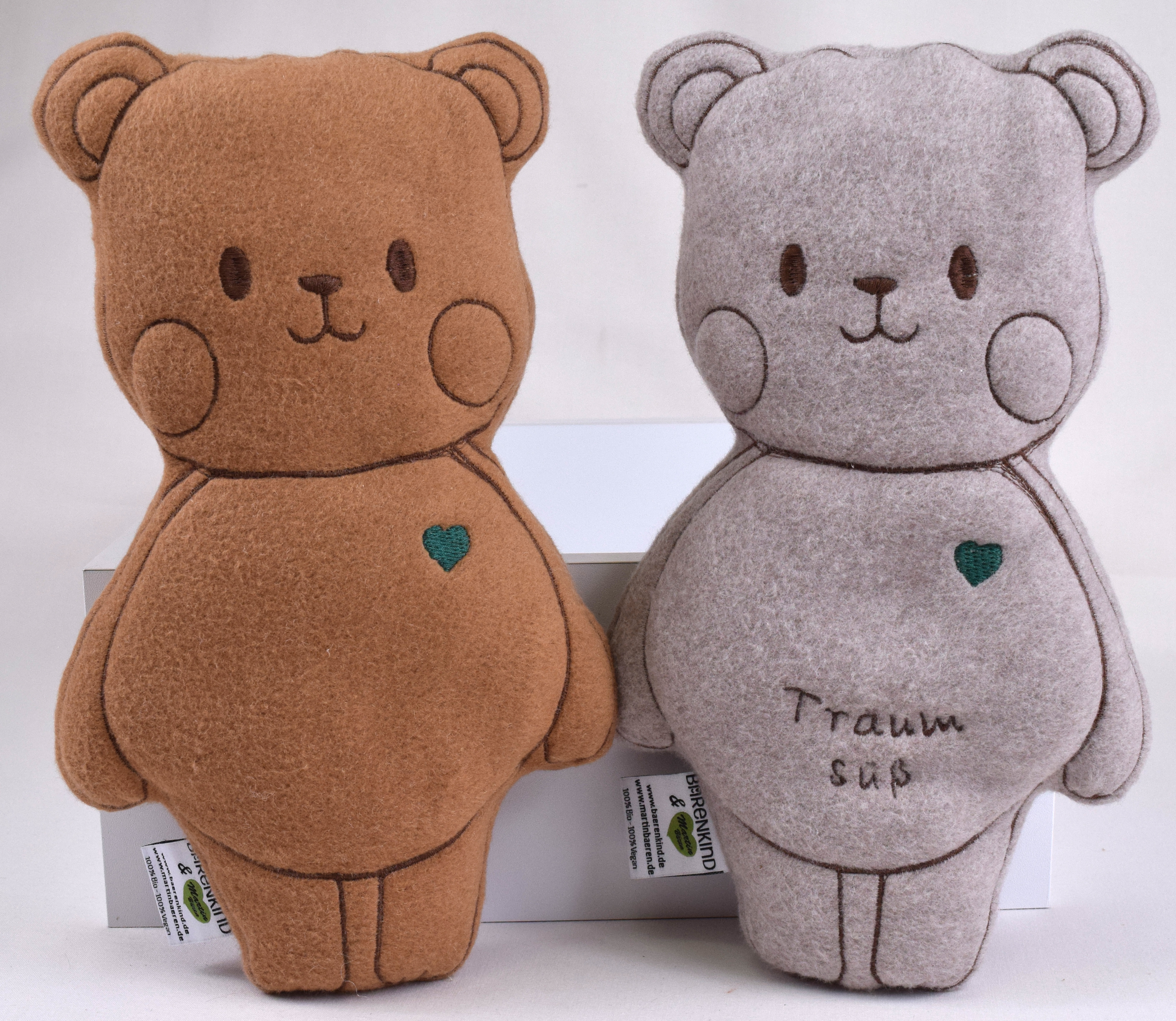 Der Außenstoff ist superweiches 100% Bio-Baumwoll-Fleece, auf dem die Kontur und das Gesicht gestickt sind. Optional kann auch noch der Name oder ein Spruch wie "Träum süß" gestickt werden um den Teddy eine persönliche Note zu verleihen. Gefüllt ist der Kuschelbär mit Maiswatte, die bis 60° waschbar und auch trocknergeeigent ist. Somit ist der Kuschelbär eine sichere, nachhaltige und besonders natürliche Möglichkeit, auch kleinen Kindern das süße Gefühl des Kuschelns zu geben.