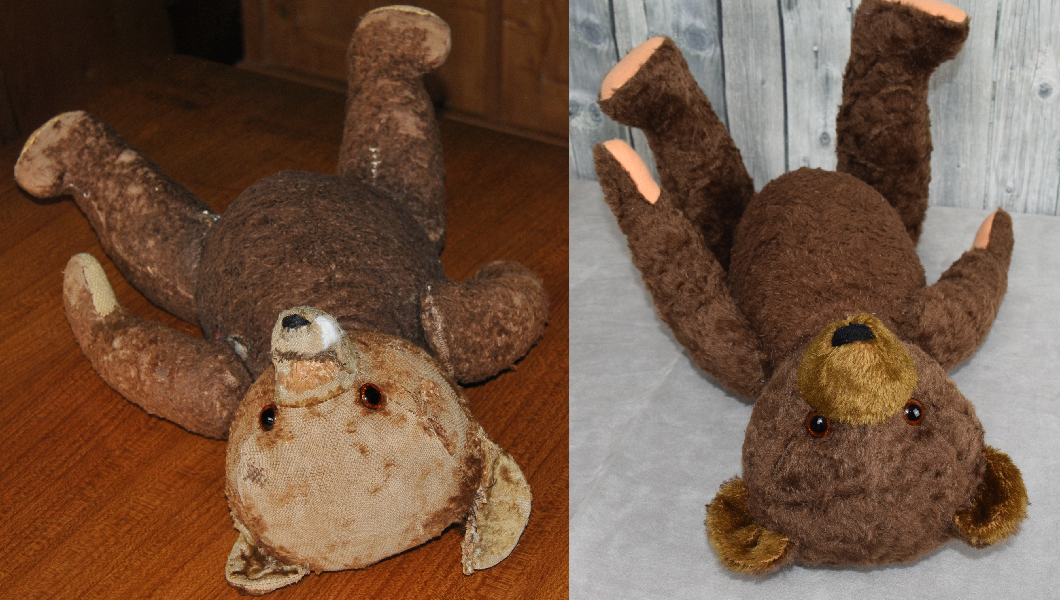 Also machten wir uns an das schwierige Werk, nahmen den Schnitt und fanden sogar ein Stück Mohair dass dem Original täuschend ähnlich war. Der Körper und die Augen blieben erhalten, Kopf, Arme und Beine wurden komplett neu hergestellt. Das Ergebnis kann sich wirklich sehen lassen.