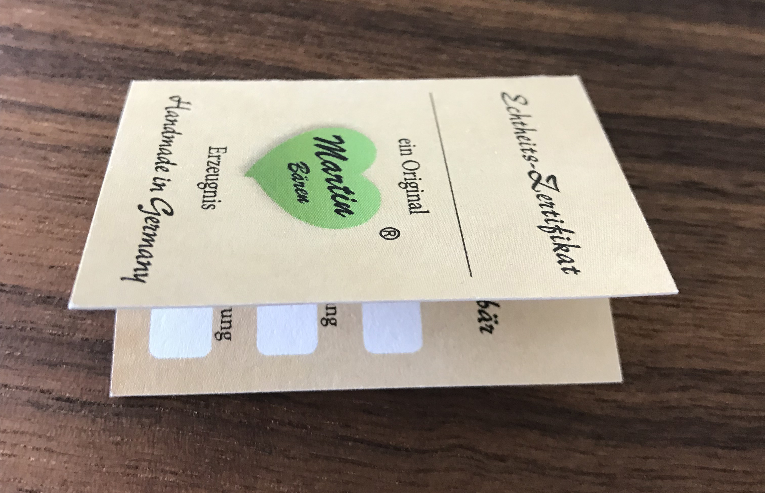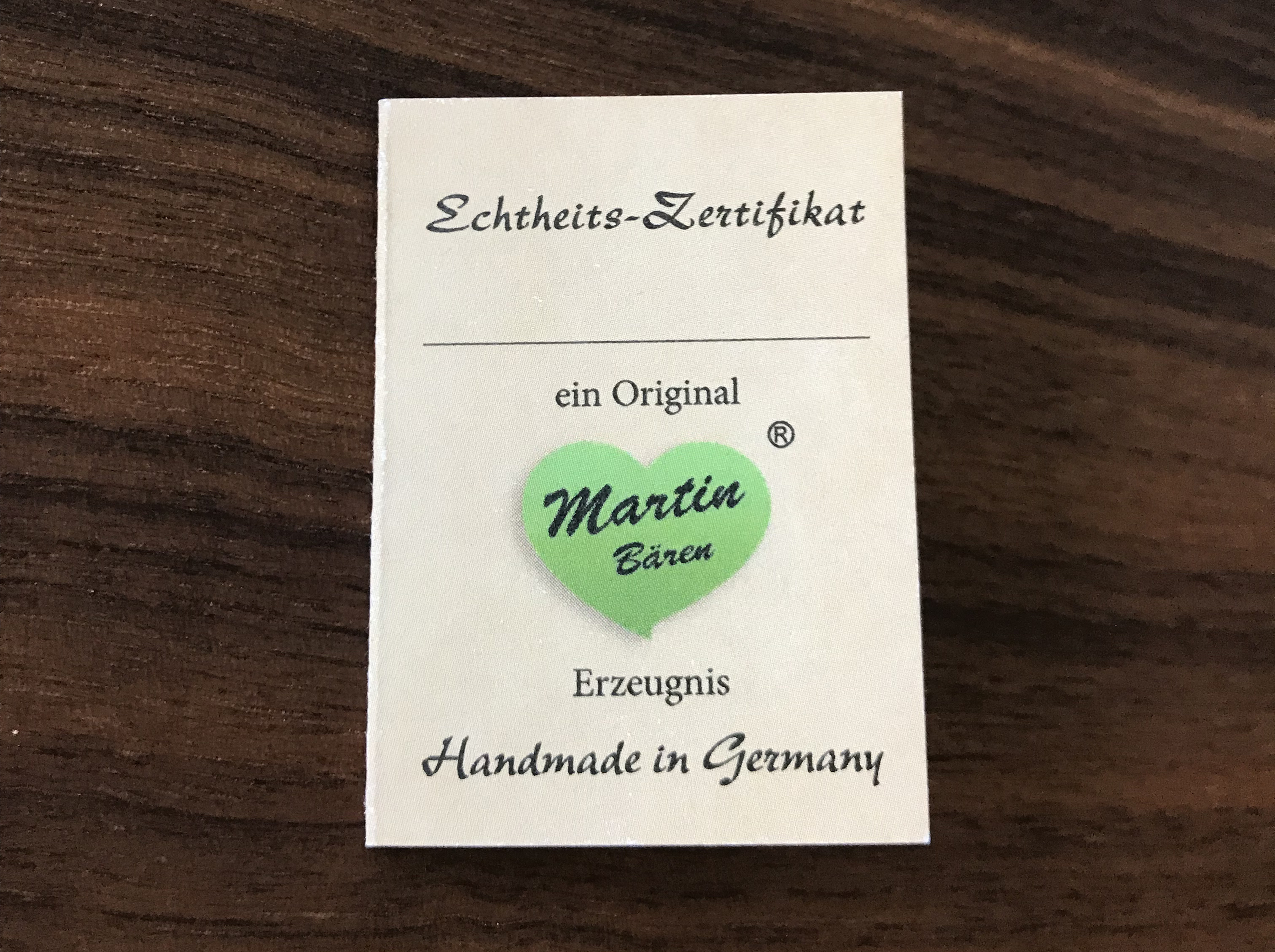 Diese Fragen möchten wir nun gerne beantworten. Jeder limitierte Sammlerbär aus dem Hause Martin Bären trägt ein handgeschriebenes Zertifikat. In diesem Echtheits-Zertifikat stehen alle wichtigen Informationen über den Teddybären um ihn eindeutig zu identifizieren und als Zeichen seiner Qualität sowie als Herkunftsbescheinigung.