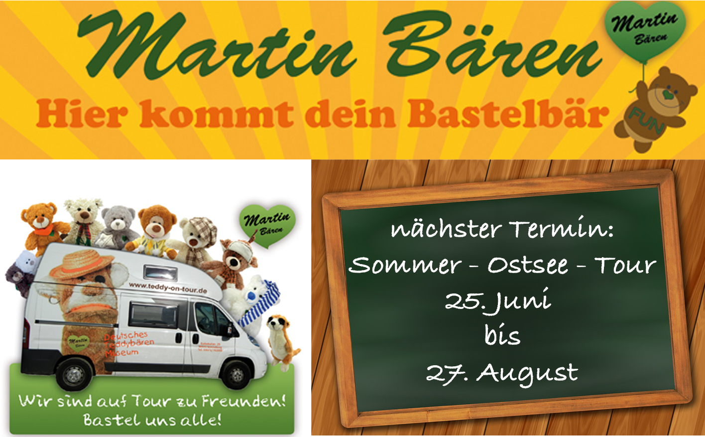 Vom 25. Juni bis 27. August 2017 wir auf Rügen und an der Ostseeküste mit den kuschligen Freunden unterwegs. Verpassen Sie nicht den Stop beim Teddymobil von der Traditionsmanufaktur Martin Bären!