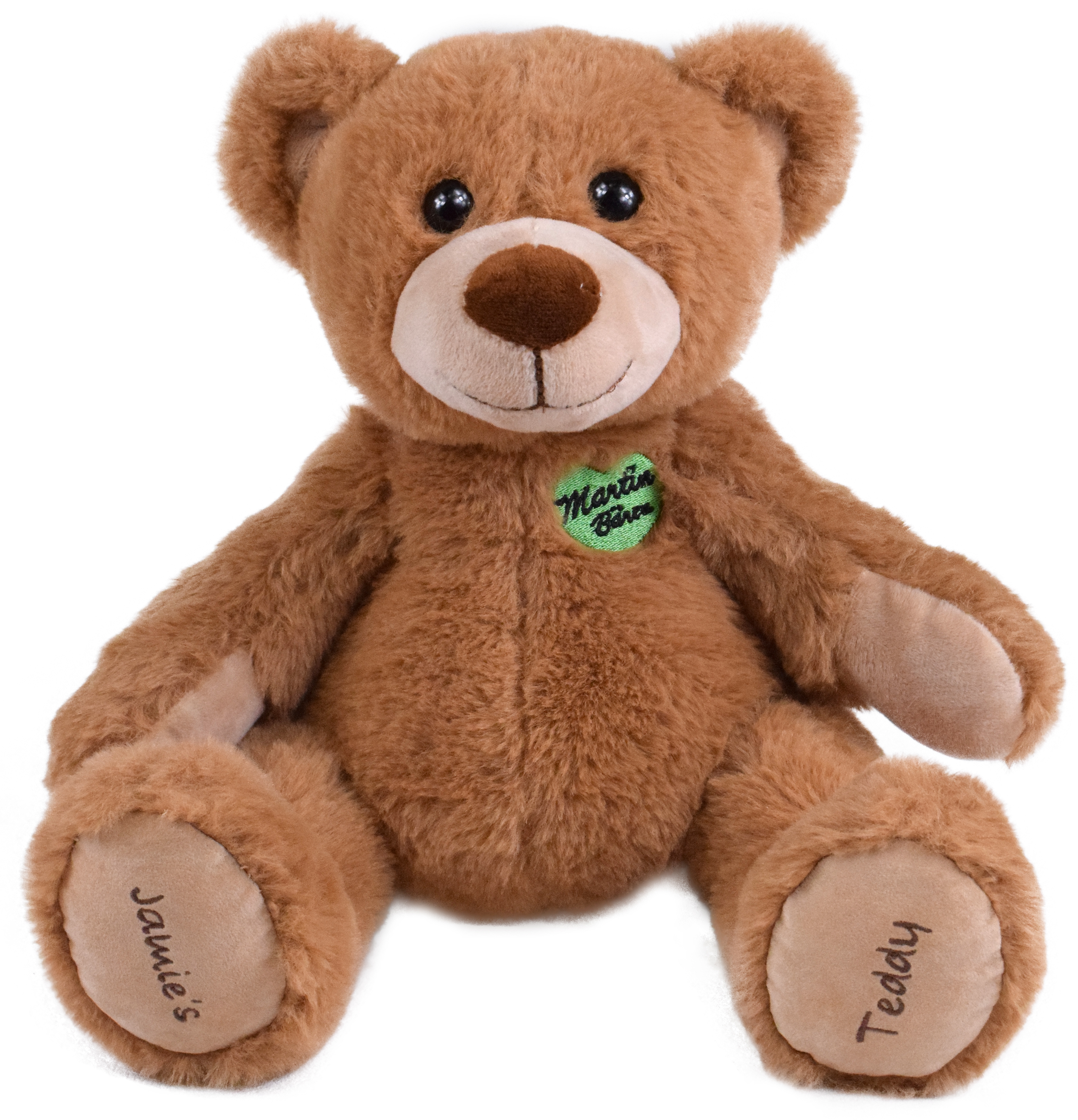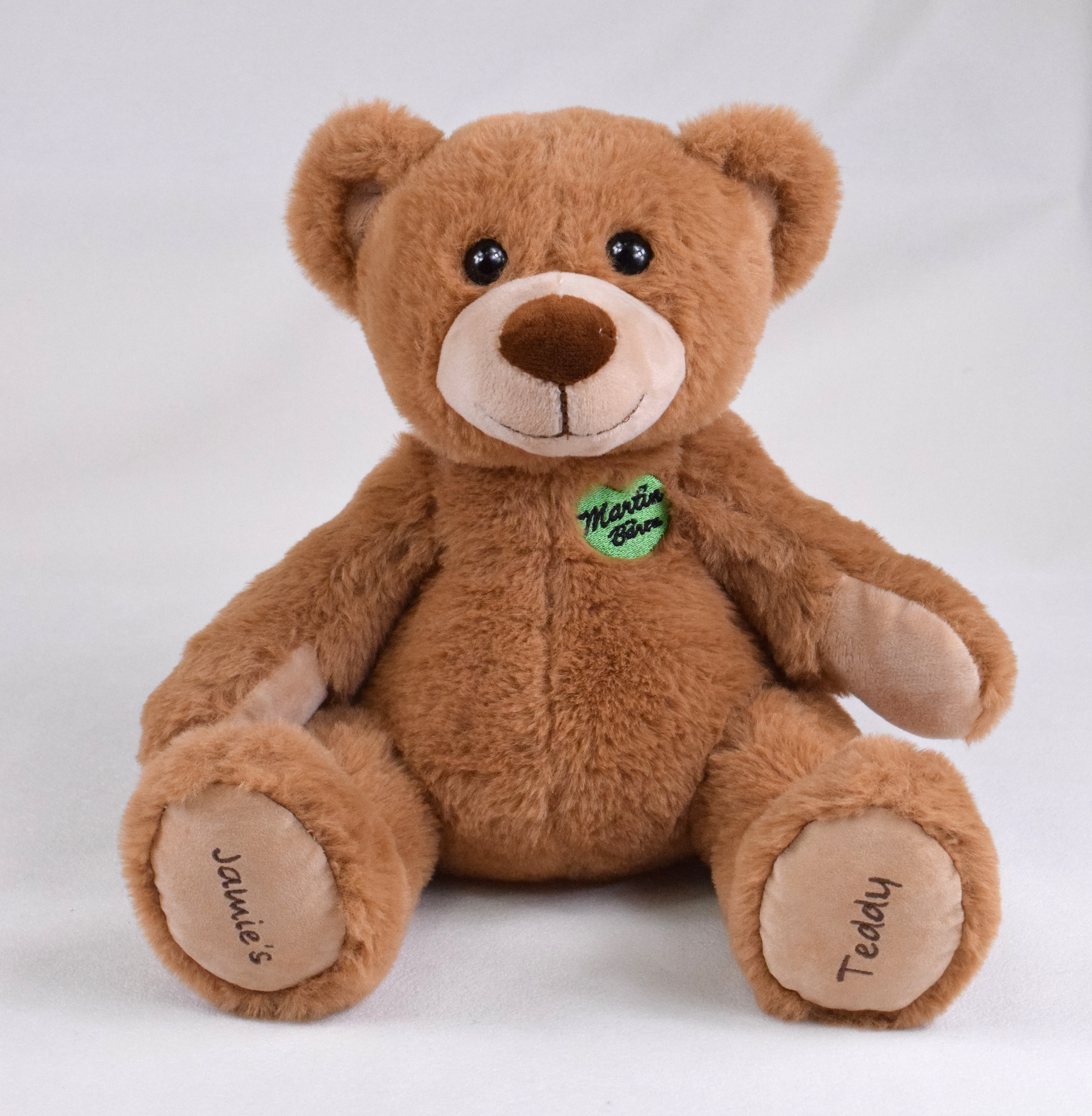 Unser brauner, 35cm großer Kuschelteddy ist kindgerecht, waschbar und mit der individuellen Bestickung ein persönliches und einmaliges Geschenk - zur Geburt oder auch für andere schöne Lebensereignisse wie Taufe oder Geburtstag. Er hat ein freundliches Lächeln, ein gesticktes Martinherz auf der linken Brust und trägt einen beige-braun-karrierten Schal.