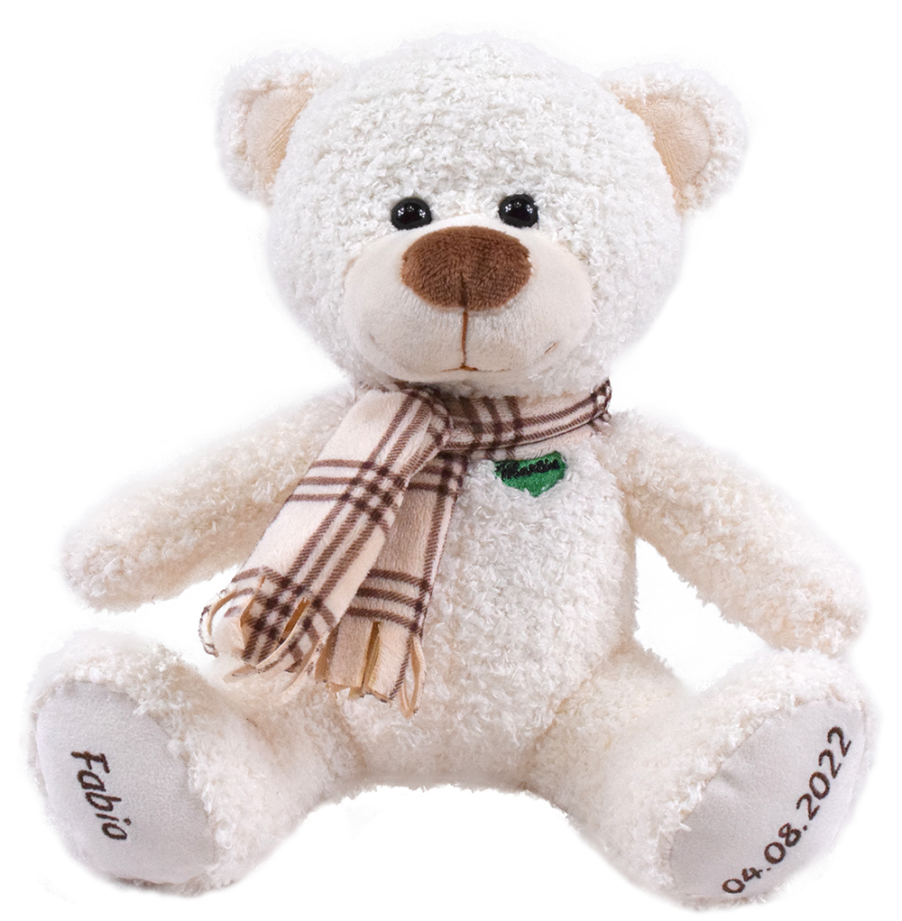 Unser weißer, 25cm großer Kuschelteddy ist kindgerecht, waschbar und mit der individuellen Beschickung ein persönliches und einmaliges Geschenk - zur Geburt oder auch für andere schöne Lebensereignisse wie Taufe oder Geburtstag. Er hat ein freundliches Lächeln, ein gesticktes Martinherz auf der linken Brust und trägt einen beige-braun-karrierten Schal.
