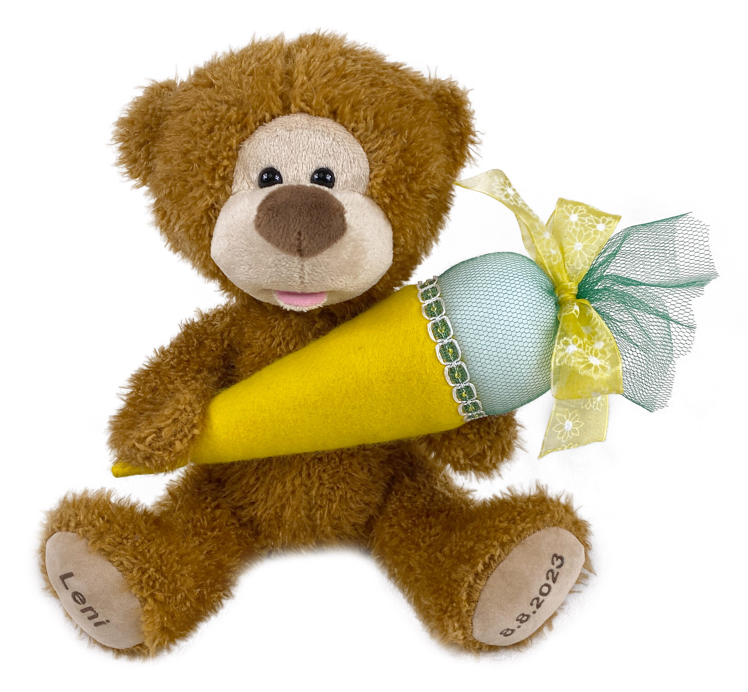 Die Sohlen des Teddybären können individuell bestickt werden, z.B. mit Namen des Kindes und das Datum der Schuleinführung. Somit wird er zum einmaligen Erinnerungsstück.