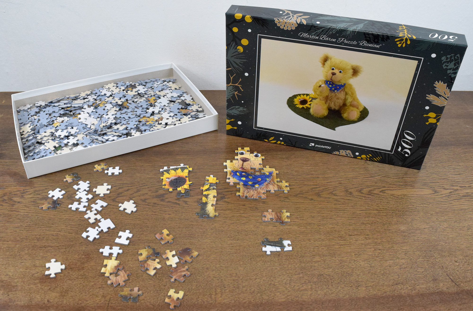Das erste Puzzle von Martin Bären ist da. Es zeigt unseren Bienian wie er seine Biene anstaunt. Besonders toll für das Puzzle ist der Farbverlauf im Hintergrund.