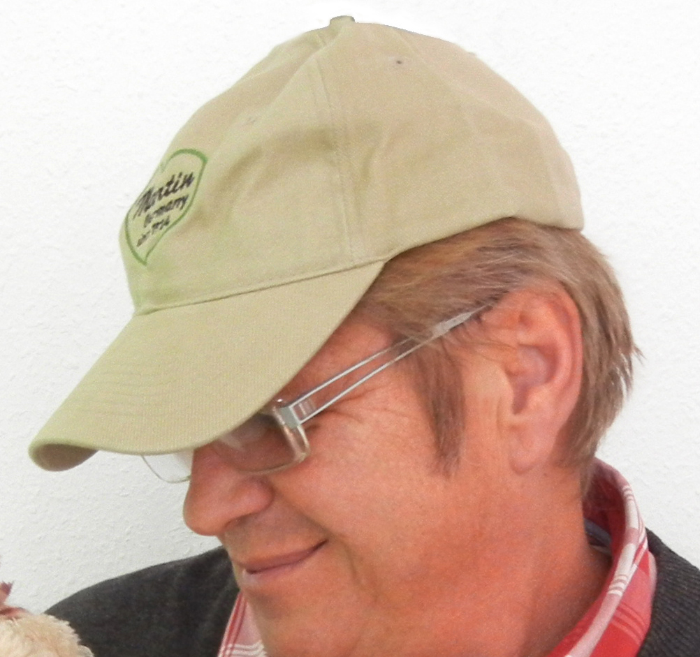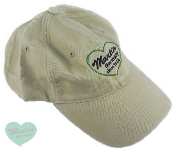 Rainer Martins liebste Kopfbedeckung - schönes beiges Basecap für Damen und Herren mit dem Martin-Logo bestickt.