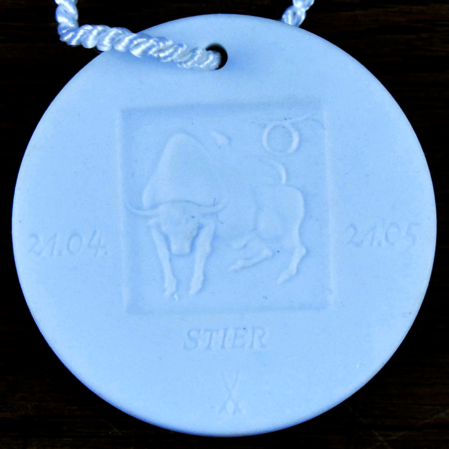 Original Meissner Porzellan Medaille Sternzeichen Stier (21. April - 20. Mai) für Ihre Bären zum Tragen. Der Anhänger ist weiß und ca. 4 cm groß.