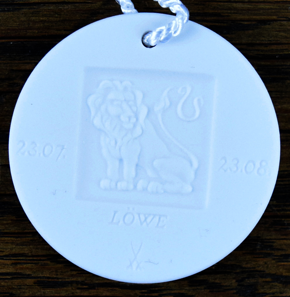 Original Meissner Porzellan Medaille Sternzeichen Löwe (23. Juli - 23. August) für Ihre Bären zum Tragen. Der Anhänger ist weiß und ca. 4 cm groß.