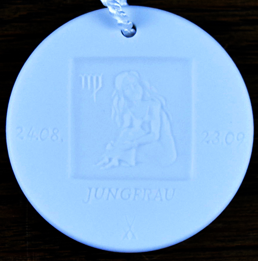 Original Meissner Porzellan Medaille Sternzeichen Jungfrau (24. August -23. September) für Ihre Bären zum Tragen. Der Anhänger ist weiß und ca. 4 cm groß.