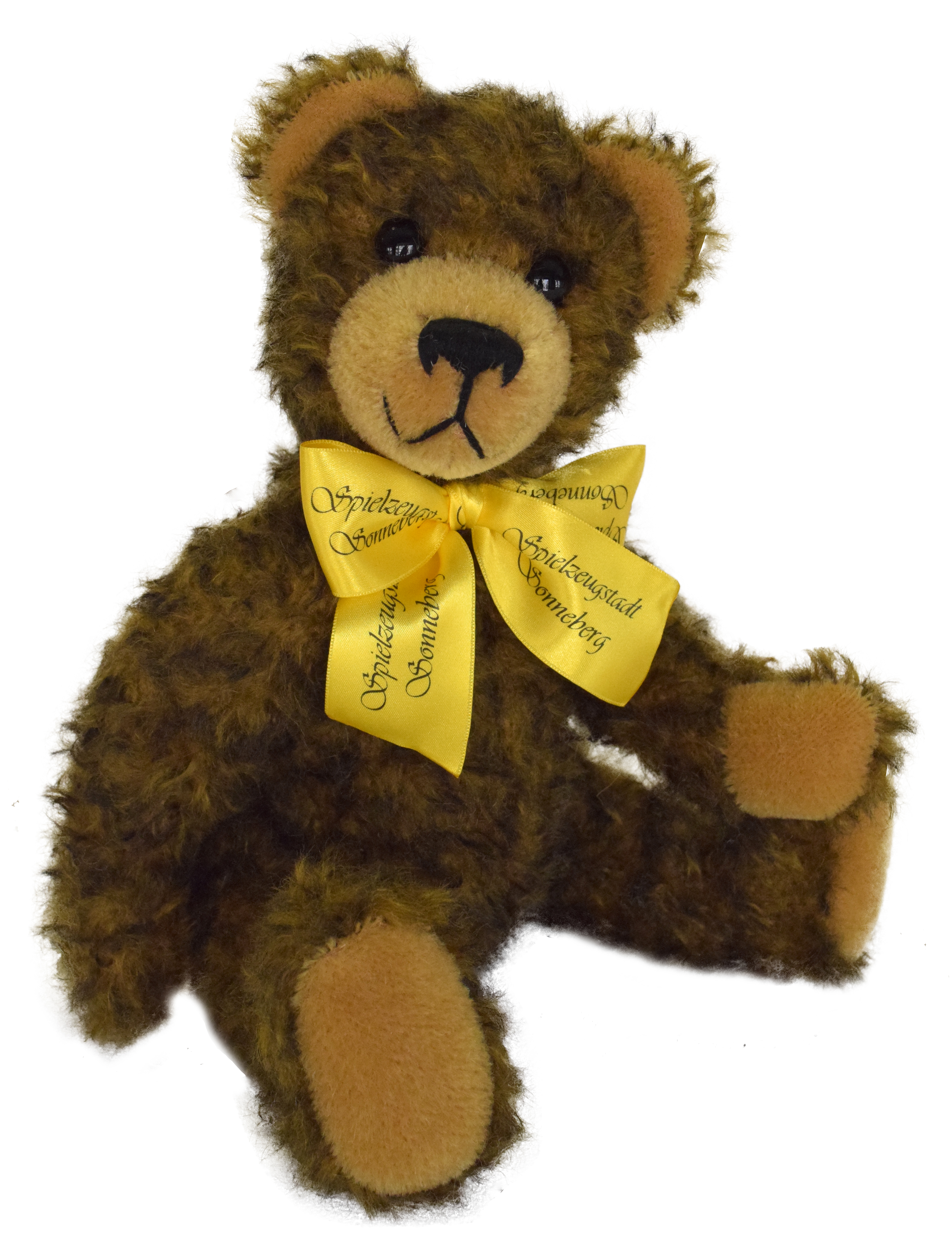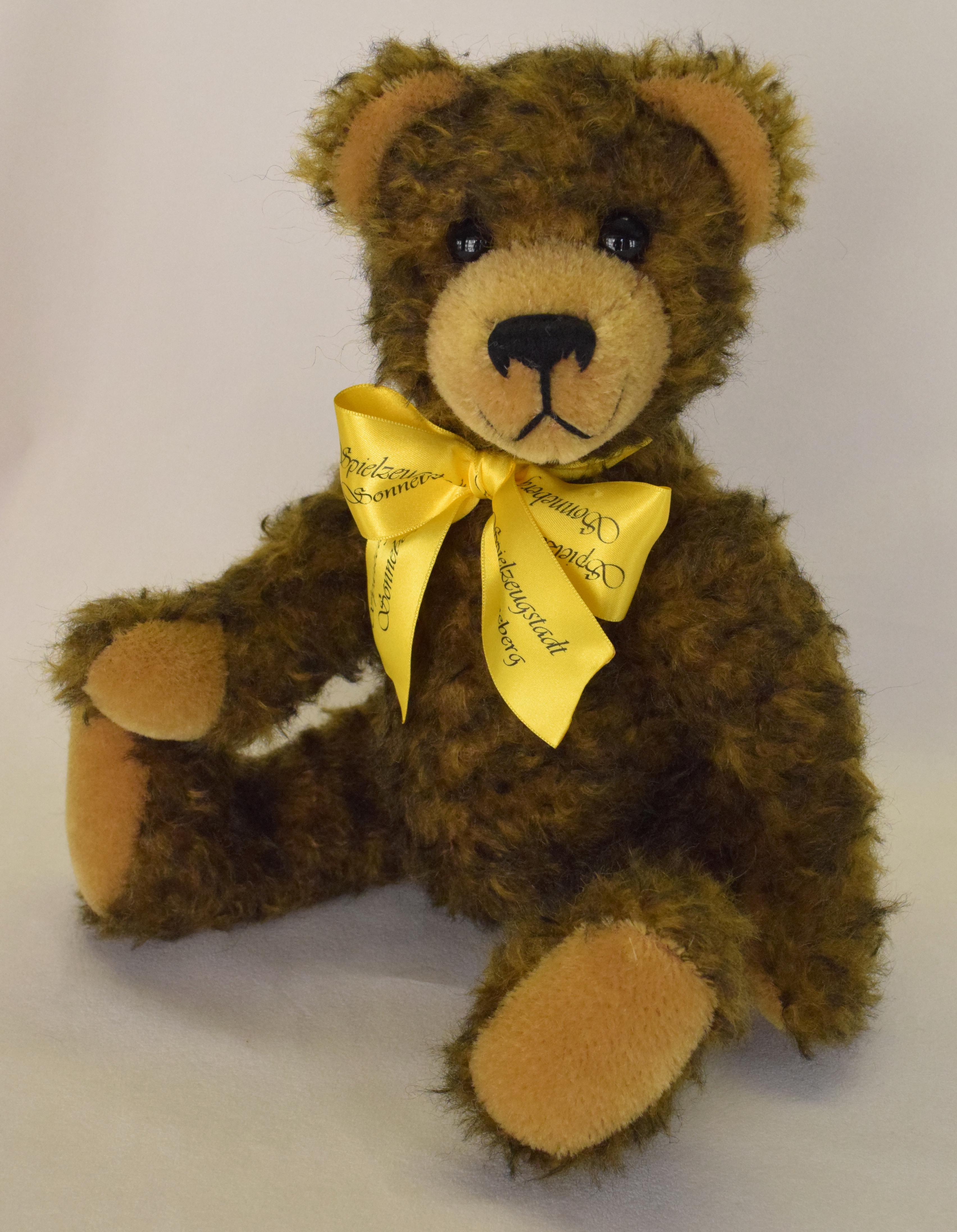 Sein braunes Mohairfell ist gelockt. Der Teddy ist mit Vlies gefüllt. Der Bär misst 36 cm. Seine rasierte Schnauze ist in schwarz bestickt. Eine liebe Brummstimme darf natürlich nicht fehlen. Die Pfoten und Sohlen sind farblich zum Fell des Bären abgestimmt.