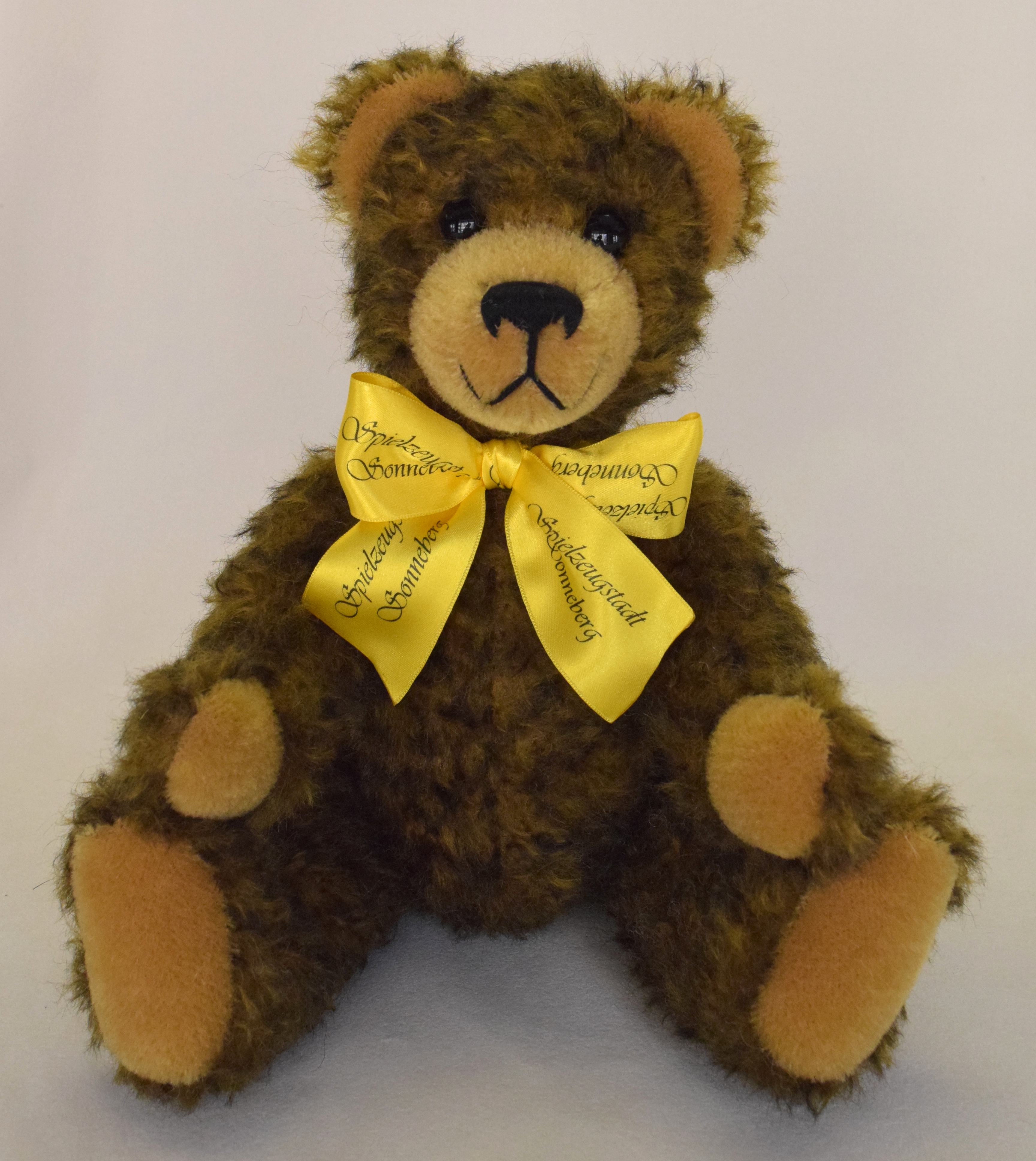 Der Sonneberger Bär trägt voller Stolz seine Schleife mit der Aufschrift "Spielzeugstadt Sonneberg".