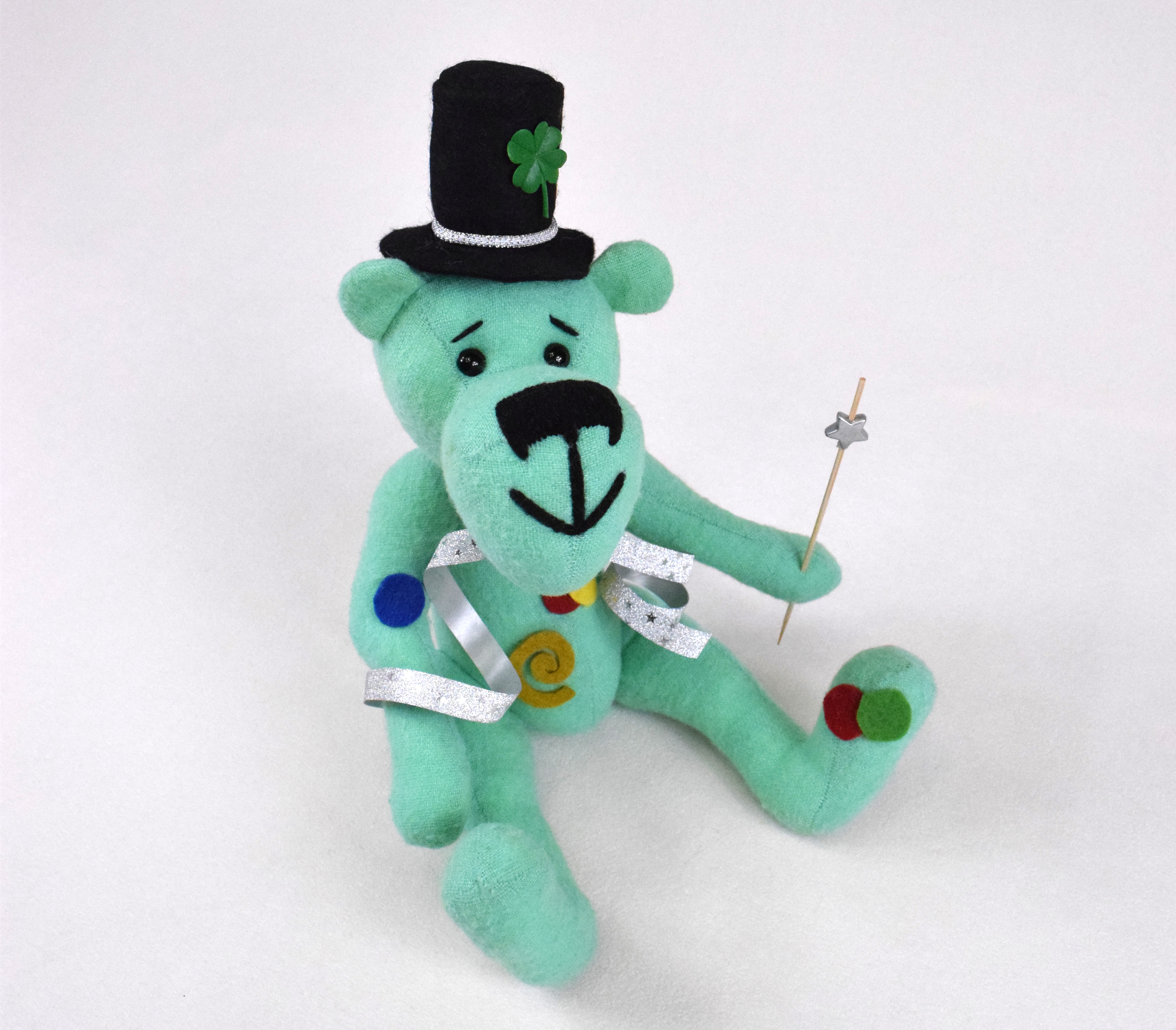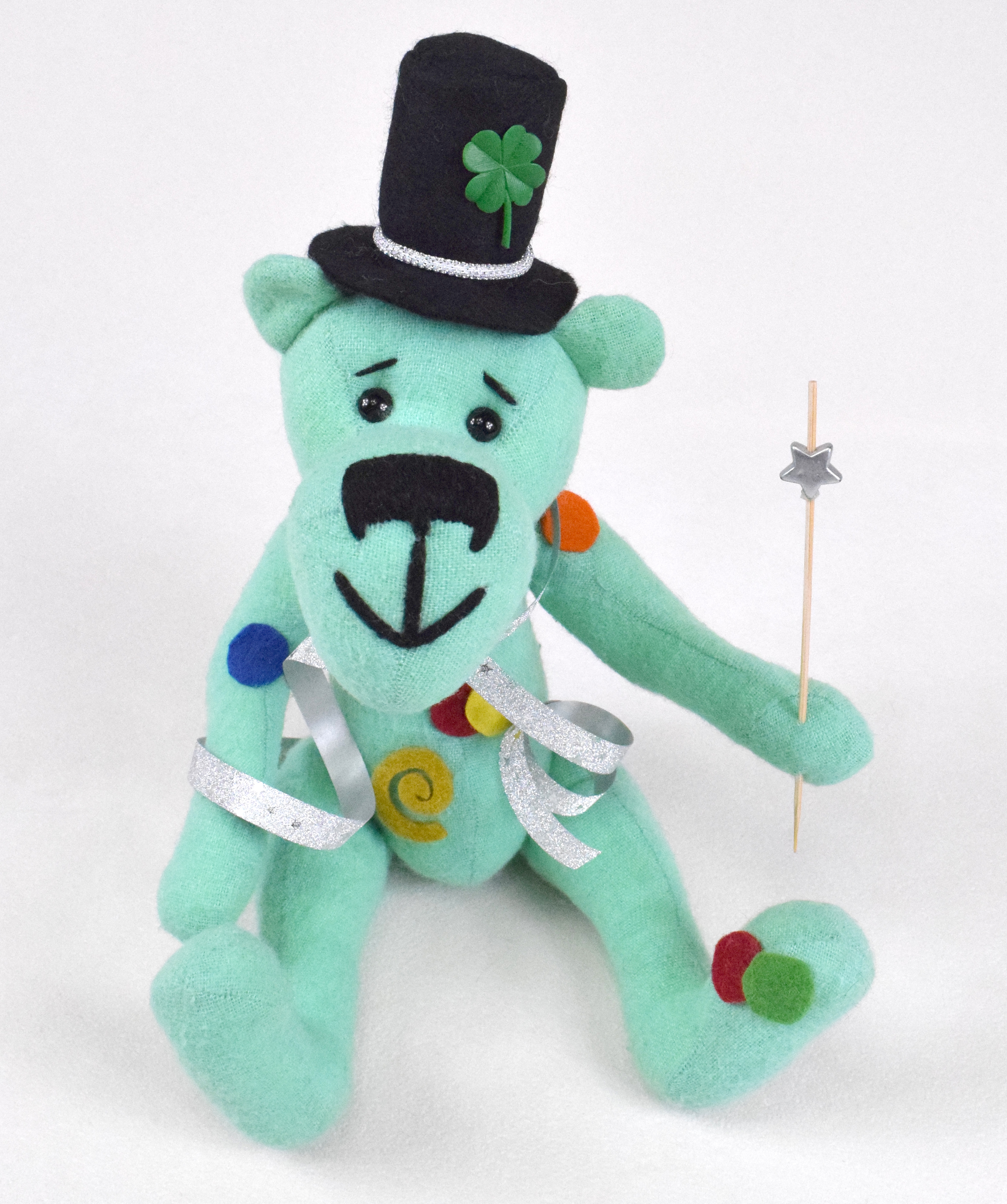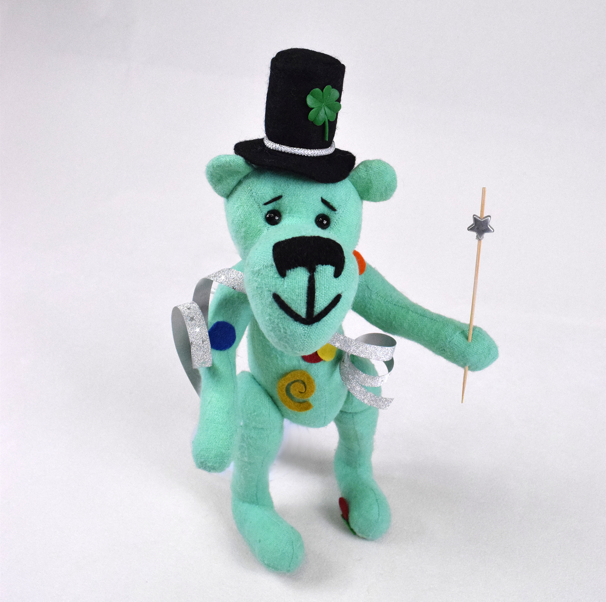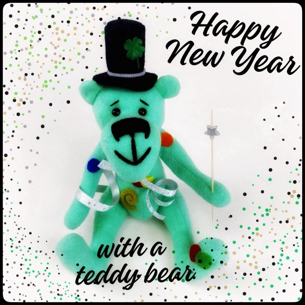 Jetzt wird gefeiert! Auf einen neues Jahr mit Spaß, Glück, Freude und viel zu Lachen. Unser Silvesterglück ist ganz ausgefallen und wenn man ihn so anschaut, sieht man dass Spaß und eine schöne Silvesterparty an oberster Stelle steht. Der Teddybär mit der markanten Schnauze ist aus grünen Baumwollstoff gefertigt. Er trägt einen Zylinder mit Glückskleeblatt, viel Konfetti am Körper und silberglänzende Luftschlangen um den Hals. An der Pfote hält er einen Häppchenspieß mit Stern.