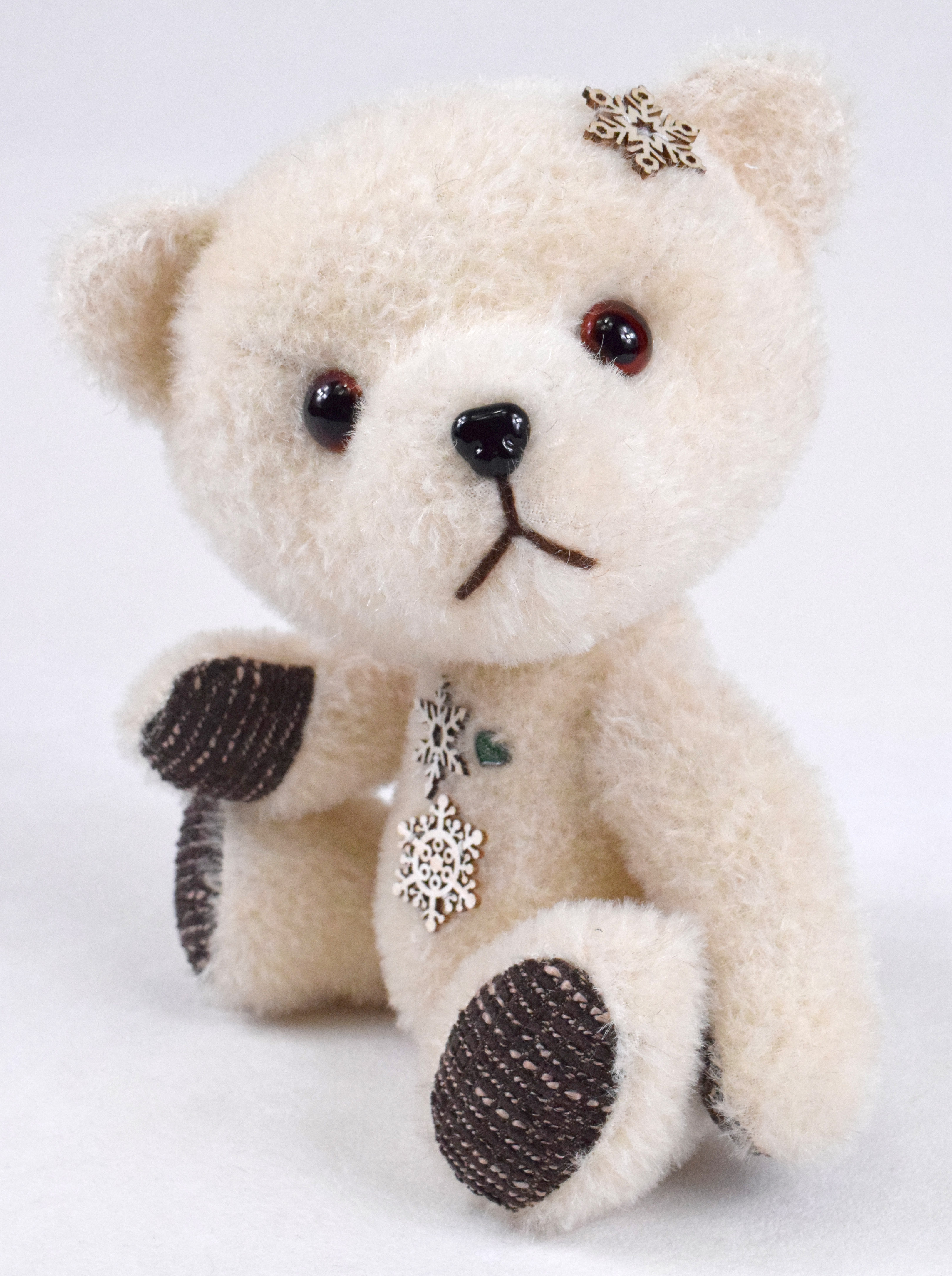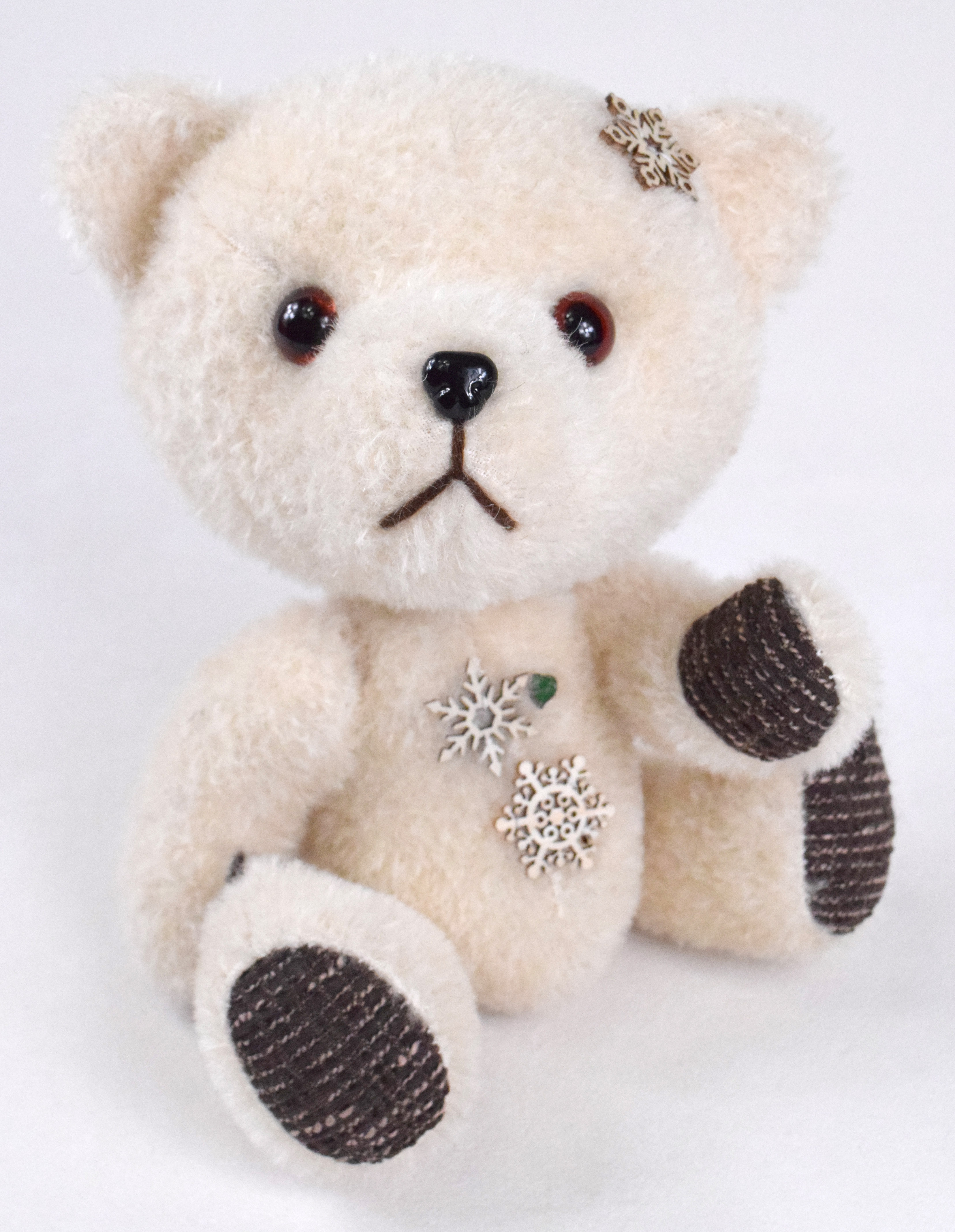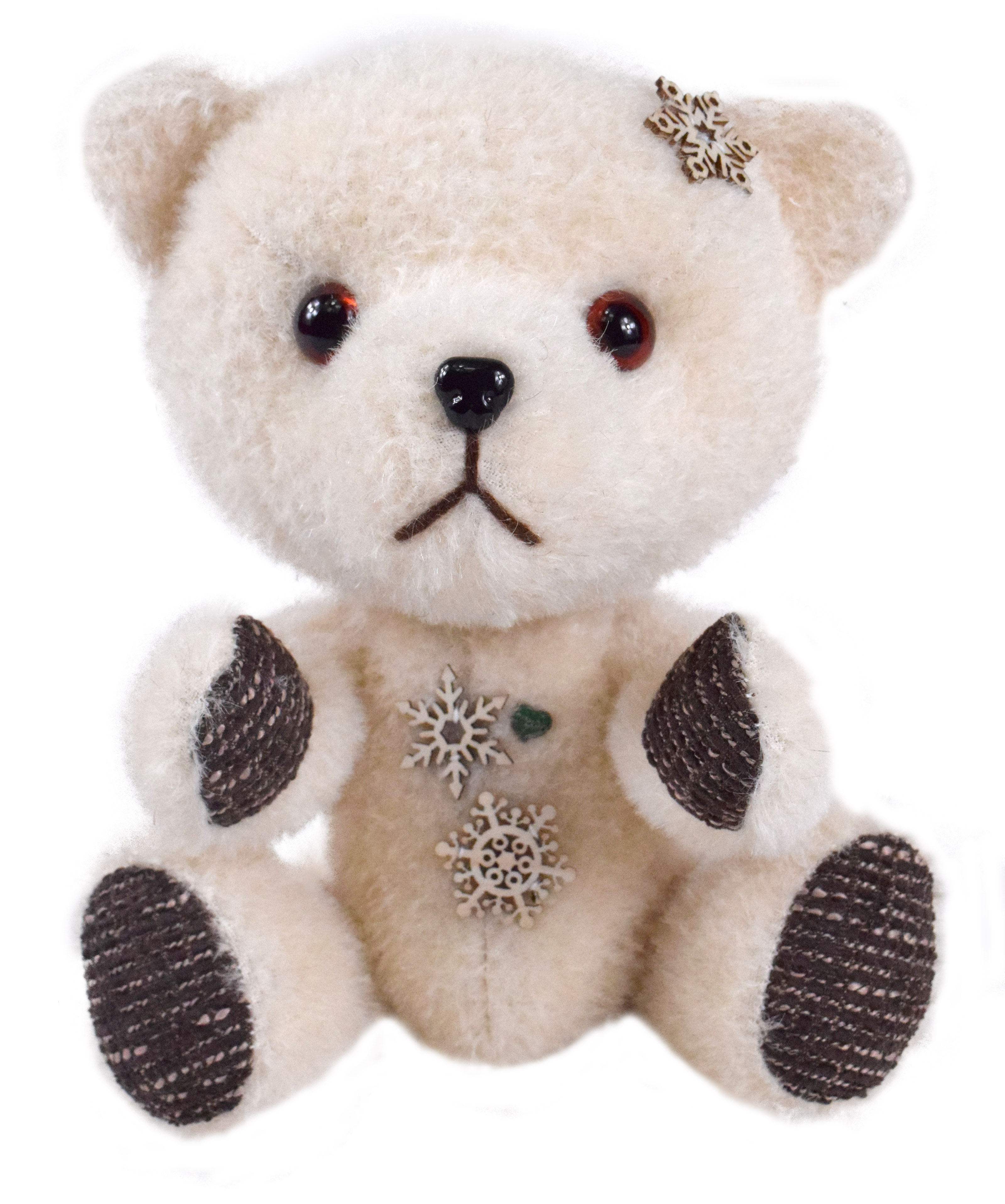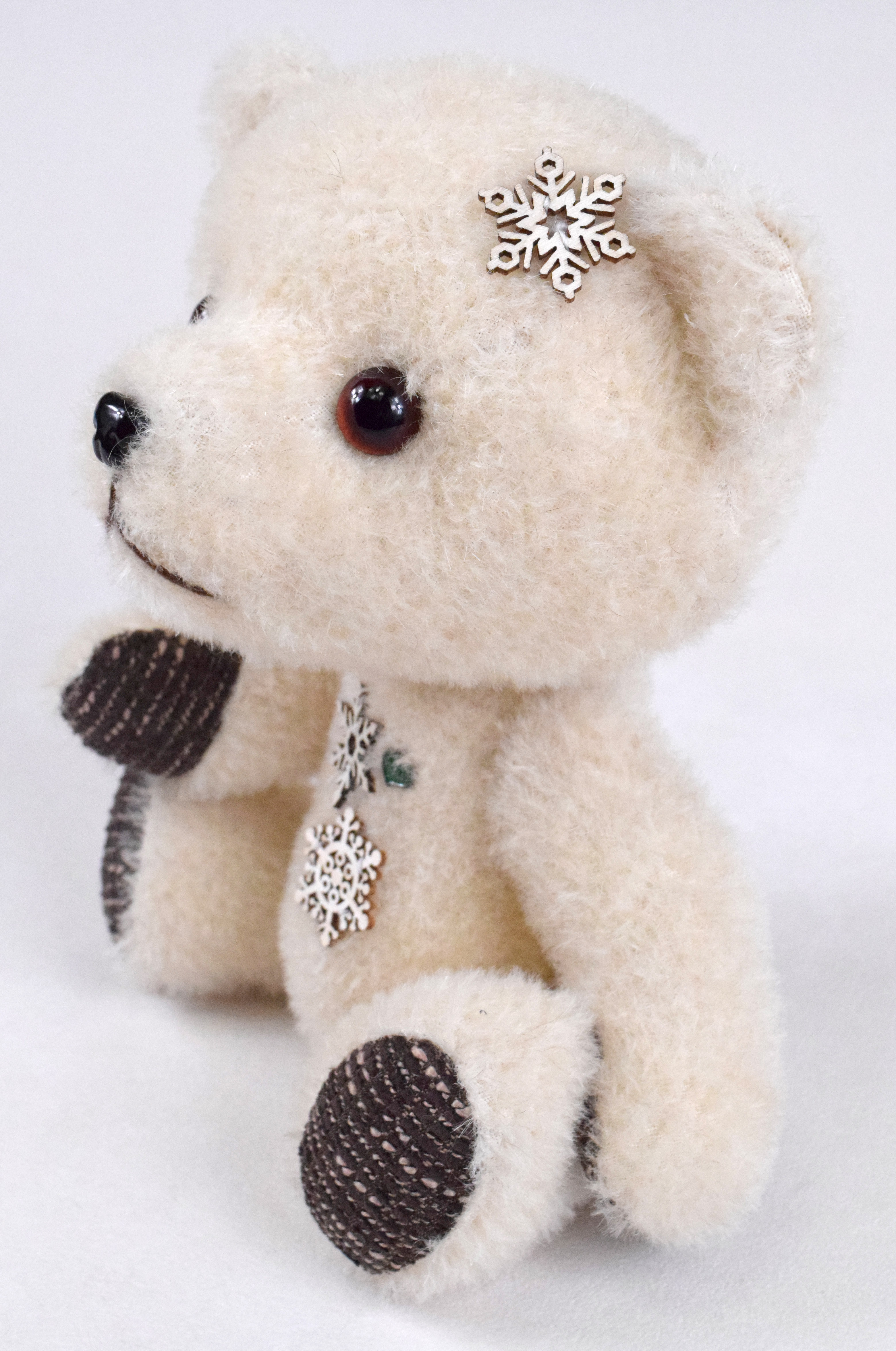 Dieser Teddybär trägt die sein Fell, so weiß, wie frisch gefallener Schnee. Er hat einen süßen großer Kopf und ist mit Schneeflocken aus Holz geschmückt. DezemBÄR ist 30cm groß und liebt es geknuddelt zu werden.