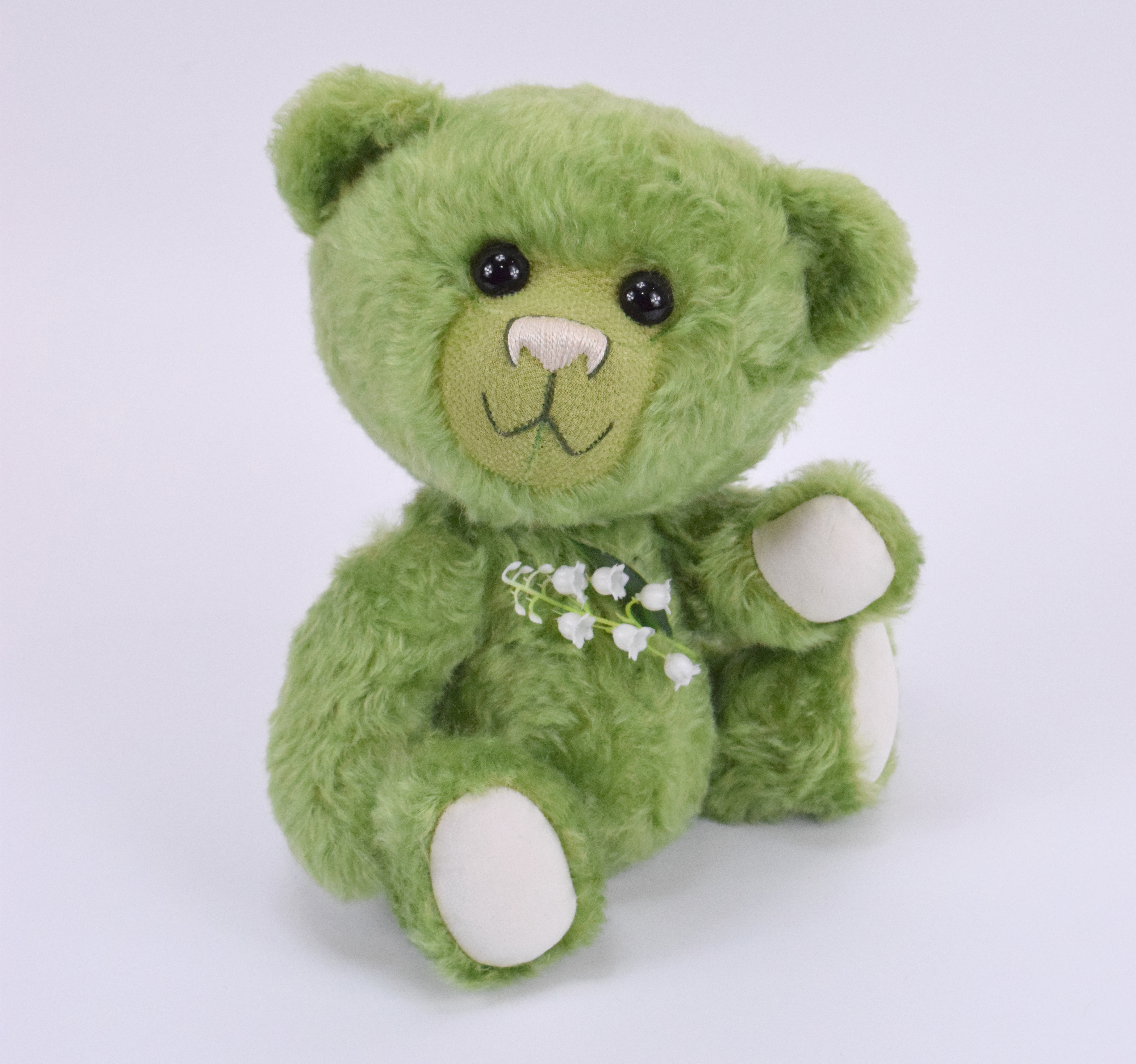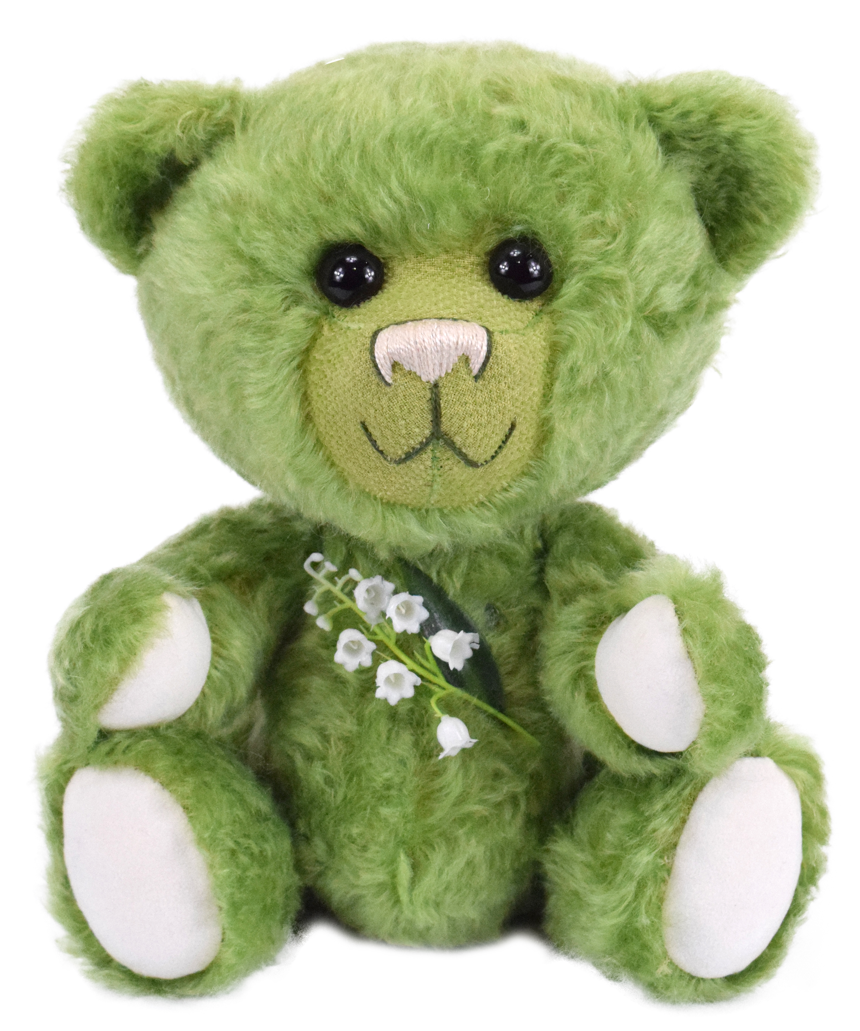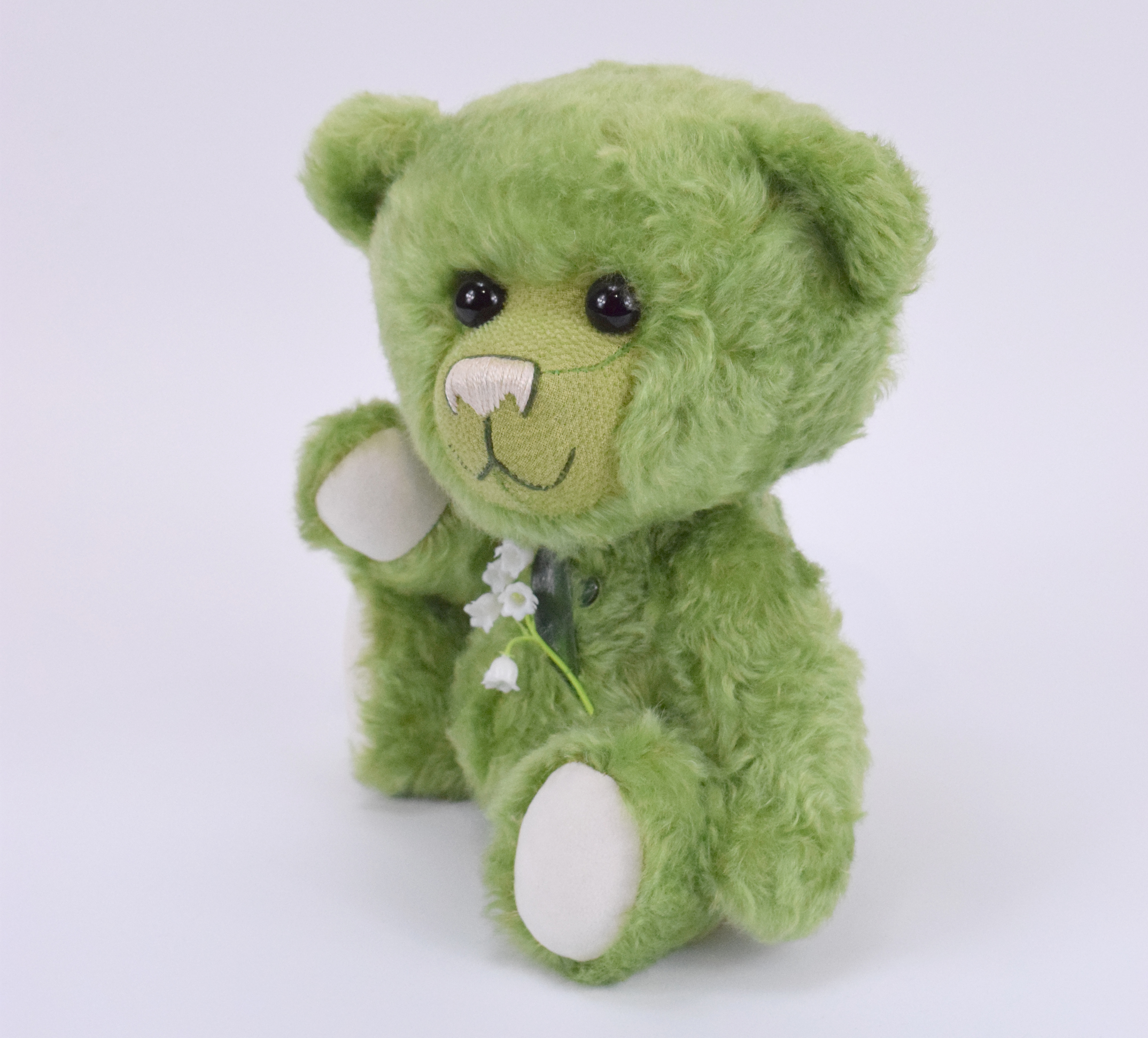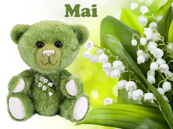 Grün - wie frisches Gras und mit Maiglöckchen auf der Brust - so sieht unser Teddybär Mai aus. Sohlen und Pfoten sowie das weiß gestickte Schnäuzchen spiegeln die Farbe der Mai-Glocken Blütenblätter wieder.Teddybär Mai lächelt selbstbewusst, denn er freut sich auf blühende Natur und schönes Wetter.