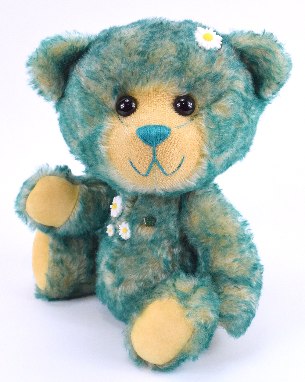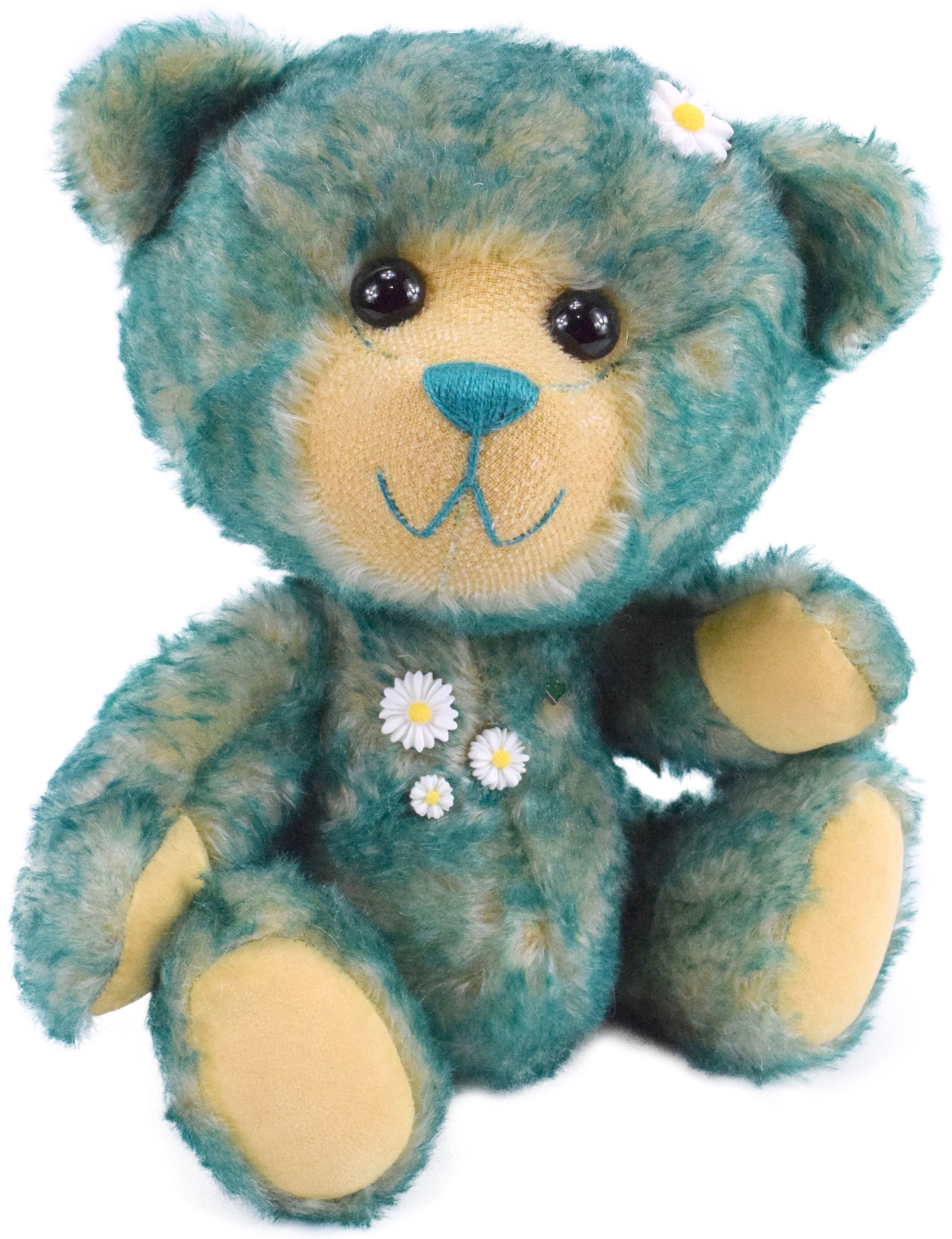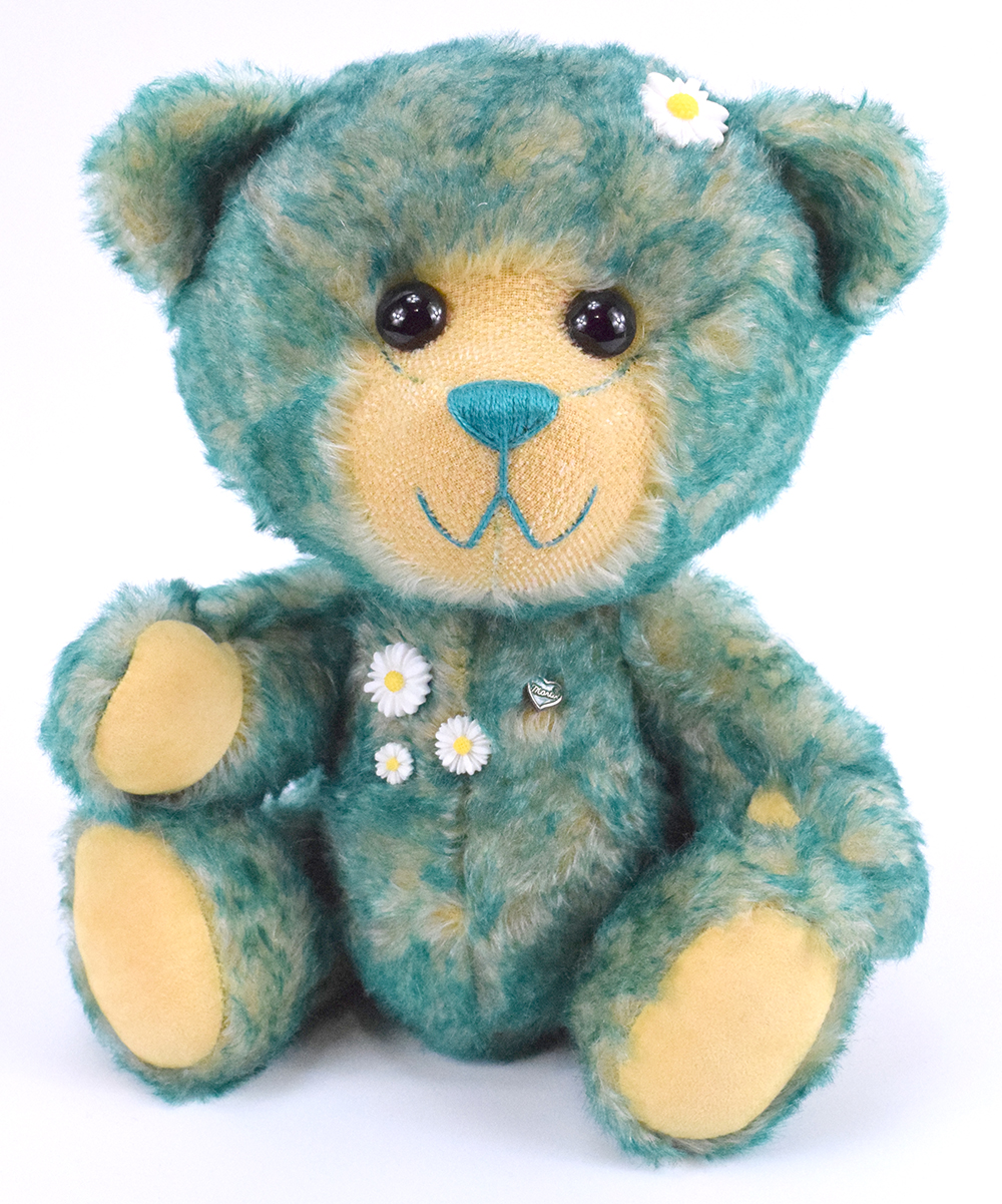 Juni ist ein 30cm großer, freundlicher Teddybär. Das blonde Fell mit den grünen Spitzen erinnert sofort an eine frische grüne Wiese mit kleinen Gänseblümchen. Und Teddybär Juni sitzt gerne in der Wiese und zählt Gänseblümchen. Das liebe Gesicht mit den schwarzen großen Knopfaugen ist rasiert wobei der Farbkontrast des Untergrunds toll zur Geltung kommt. Farblich passen dazu Sohlen und Pfoten genau.