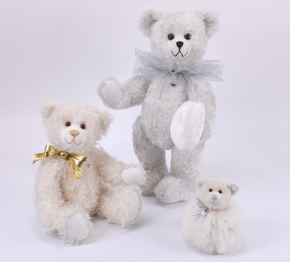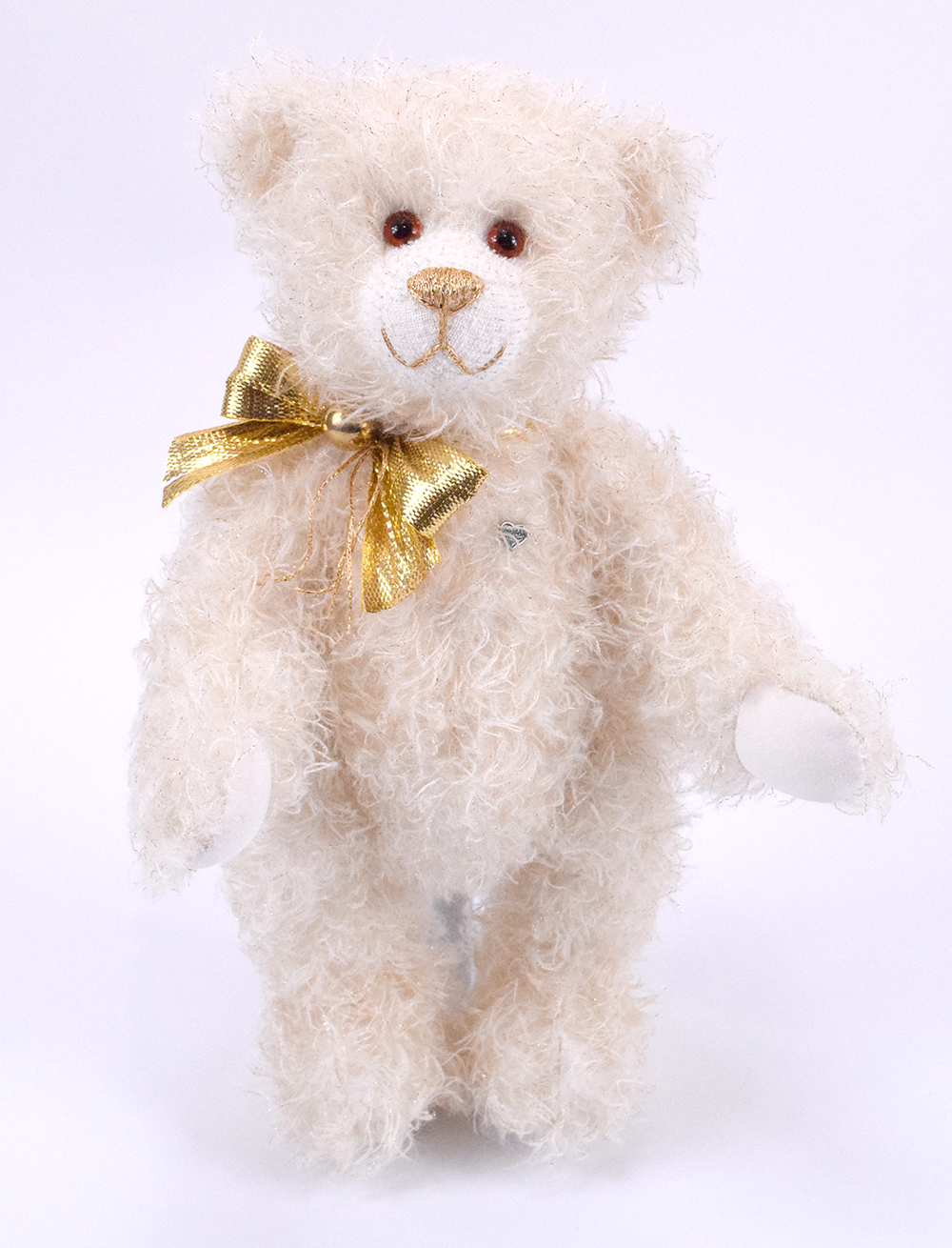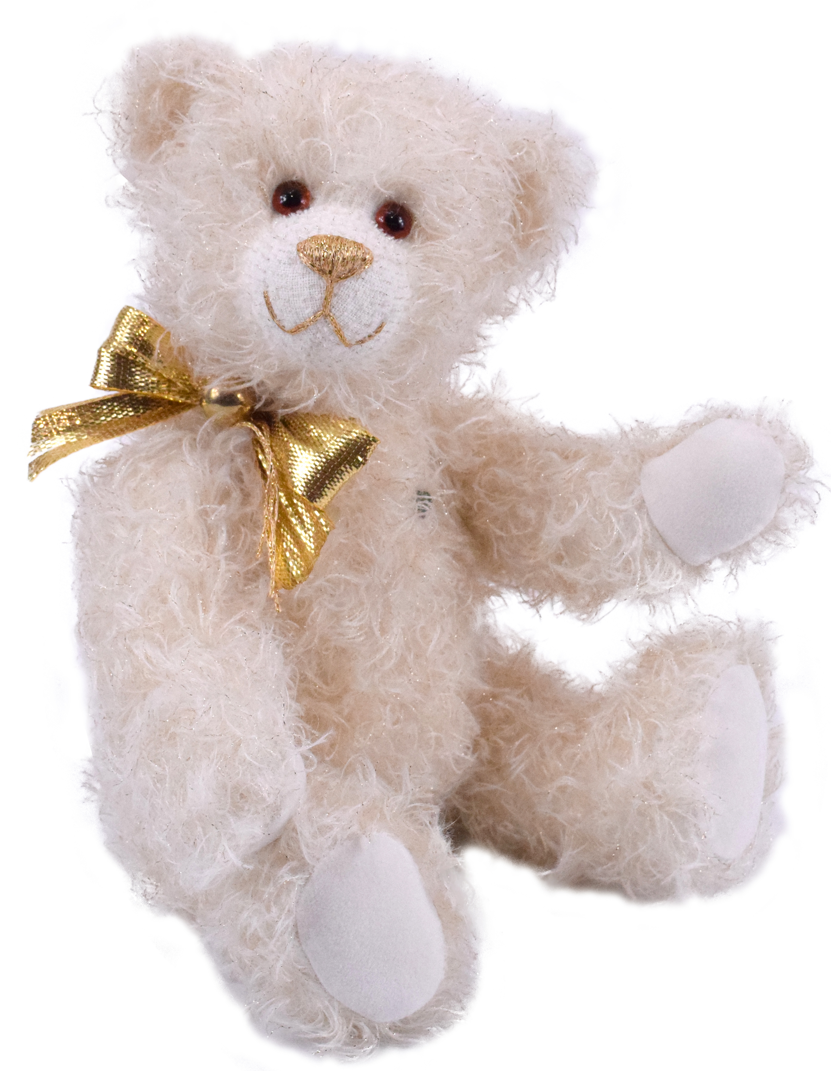 Goldmarie ist ein goldig-strahlendes Teddybärchen mit 31cm Größe. Das weiße Mohair unserer Goldmarie schimmert golden, passend zur goldfarbenen Nasenbestickung und der goldenen Schleife. Sie hat liebe braune Augen und kommt mit ganz viel Freude zu Ihnen.