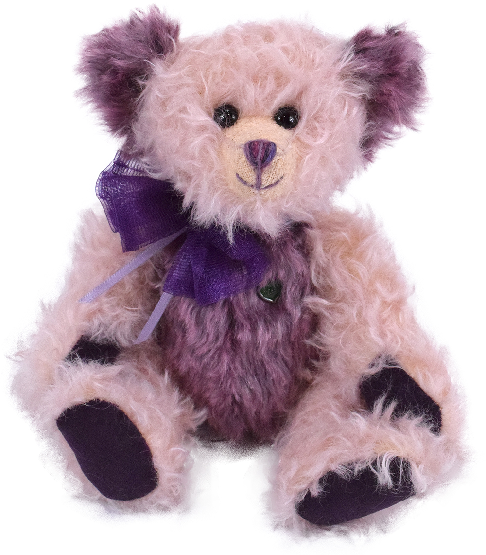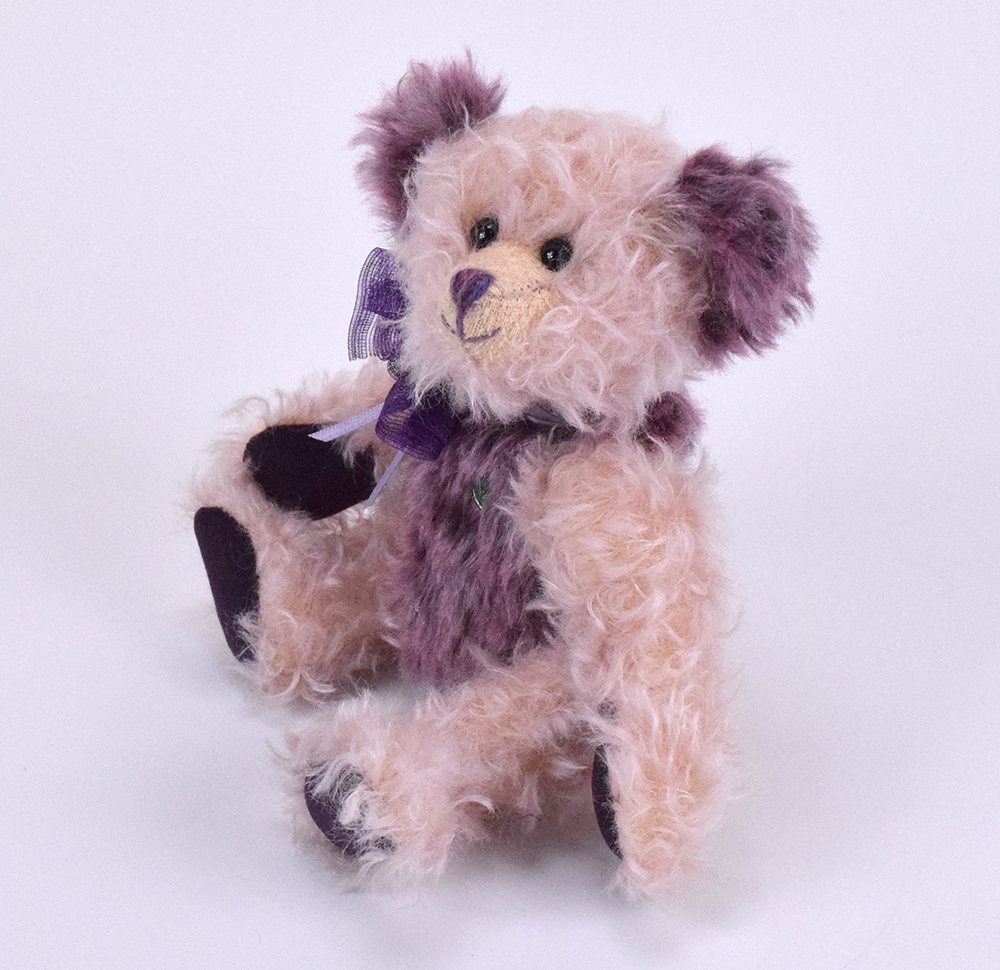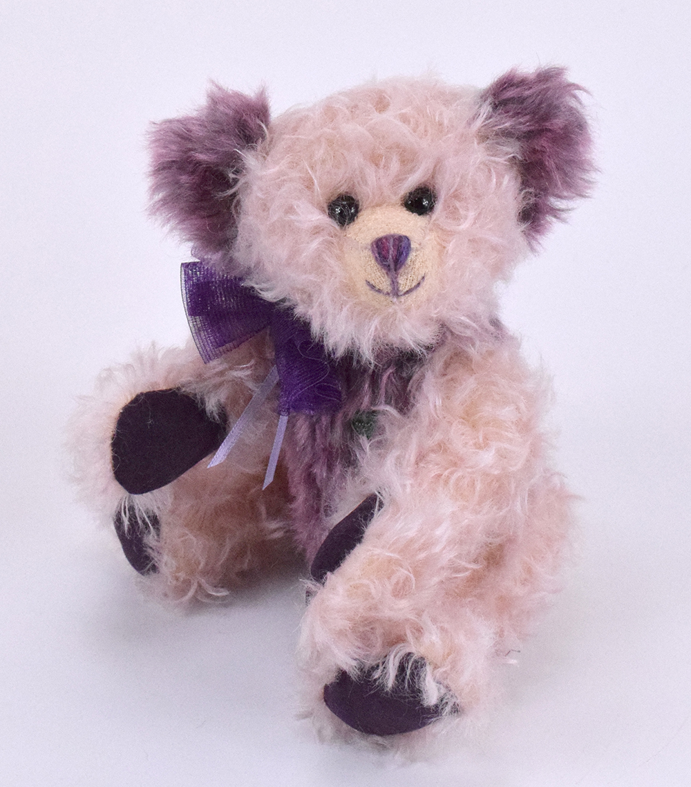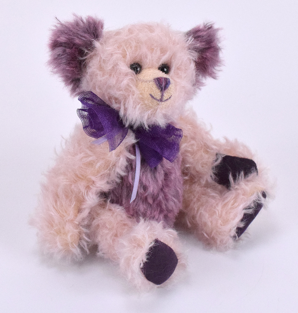 Das bezaubernde 22 cm große Teddybär-Mädchen aus rosa und fliederfarbenem Mohairfell verzaubert mit ihrem süßen Stupsnäschen und ihrem freundlichen Lächeln.