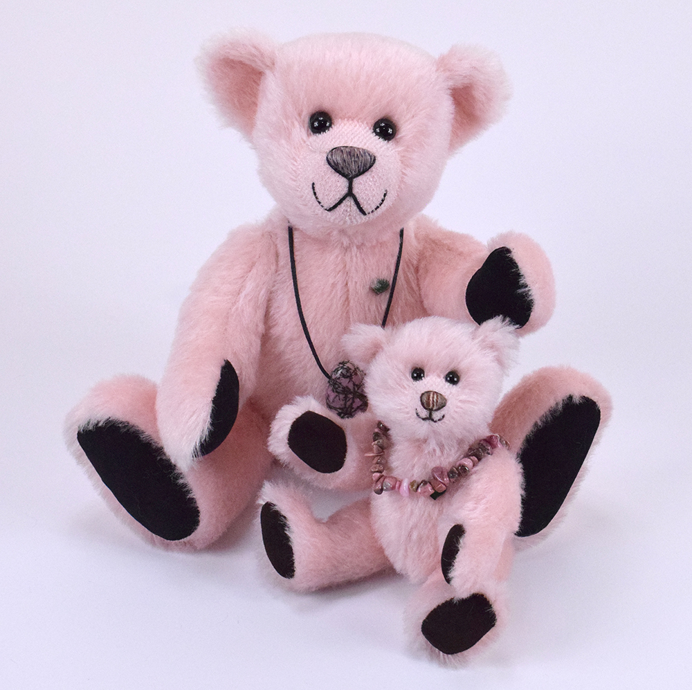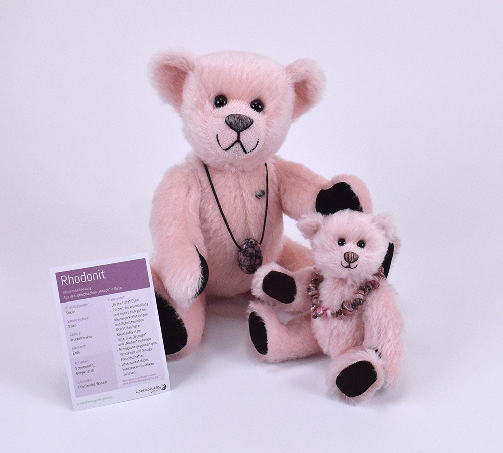 Dieser besondere 18 cm große Mohairteddy ist mit weichem Vlies gefüllt und trägt einen echten, rosafarbenen Rhodonit-Anhänger – ein Unikat aus 100 % Edelstein. Die abnehmbare Armband ist ein schönes Schmuckstück, das auch separat getragen werden kann. Da jeder Stein in seiner Form variiert, ist jedes Exemplar einzigartig.