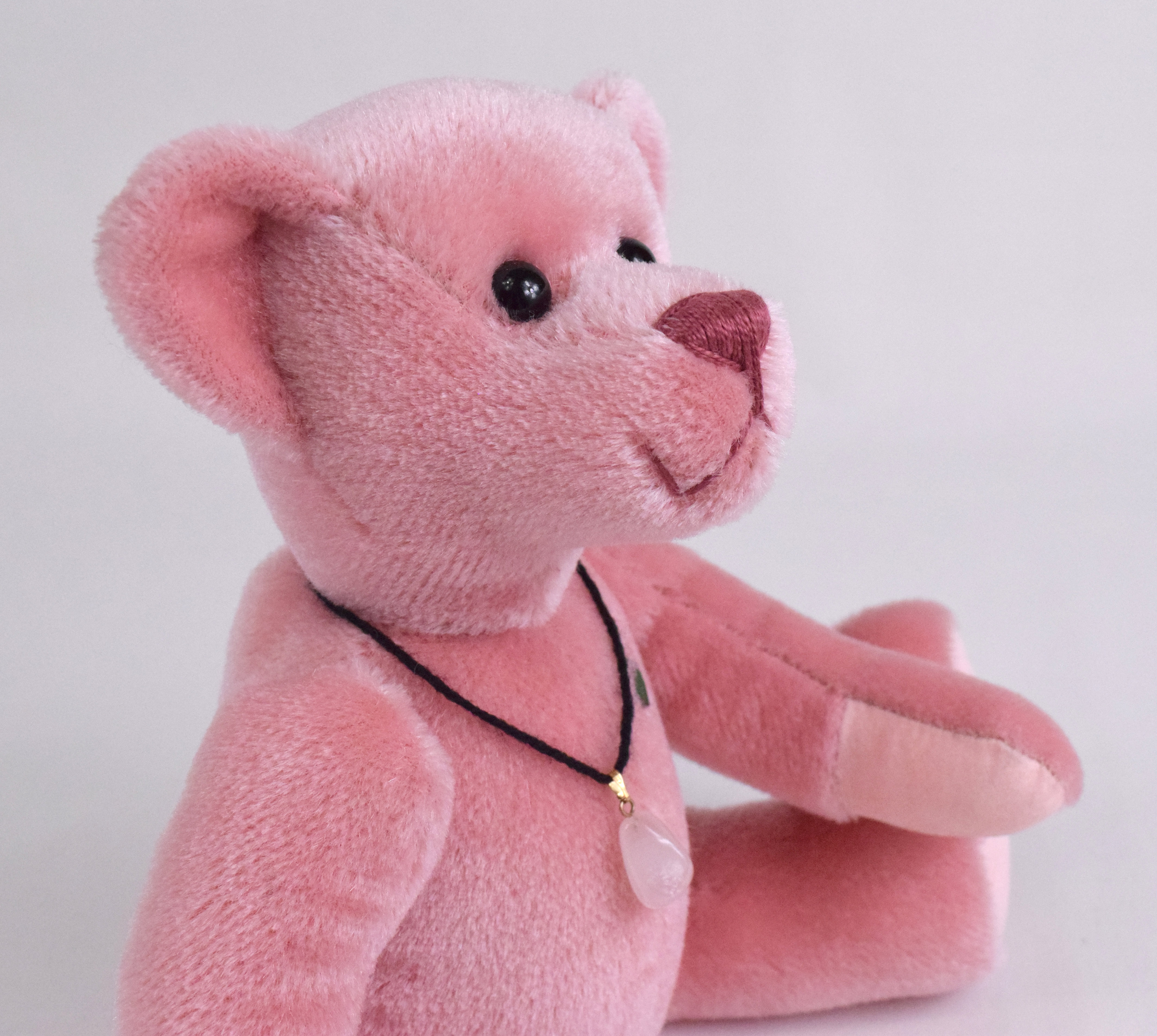 Der Glücksbringer Rosenquarz ist eine 28cm großer, vliesgefüllter Mohairteddy mit echtem Rosenquarz als Glücksstein Anhänger. Die Kette mit dem Stein ist abnehmbar und kann selbst als Schmuck getragen werden. Der Stein kann von der Form auf dem Foto abweichen.
