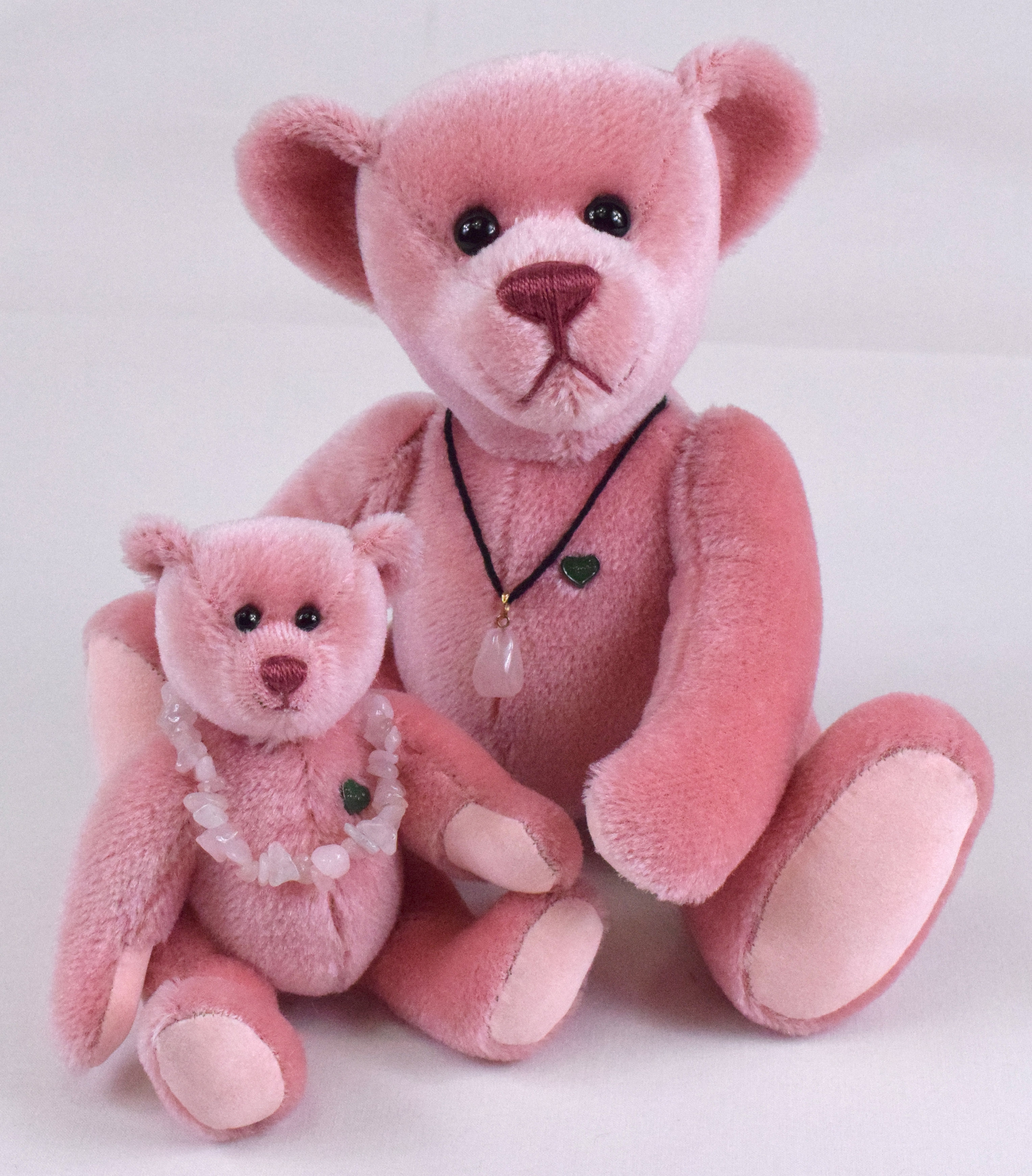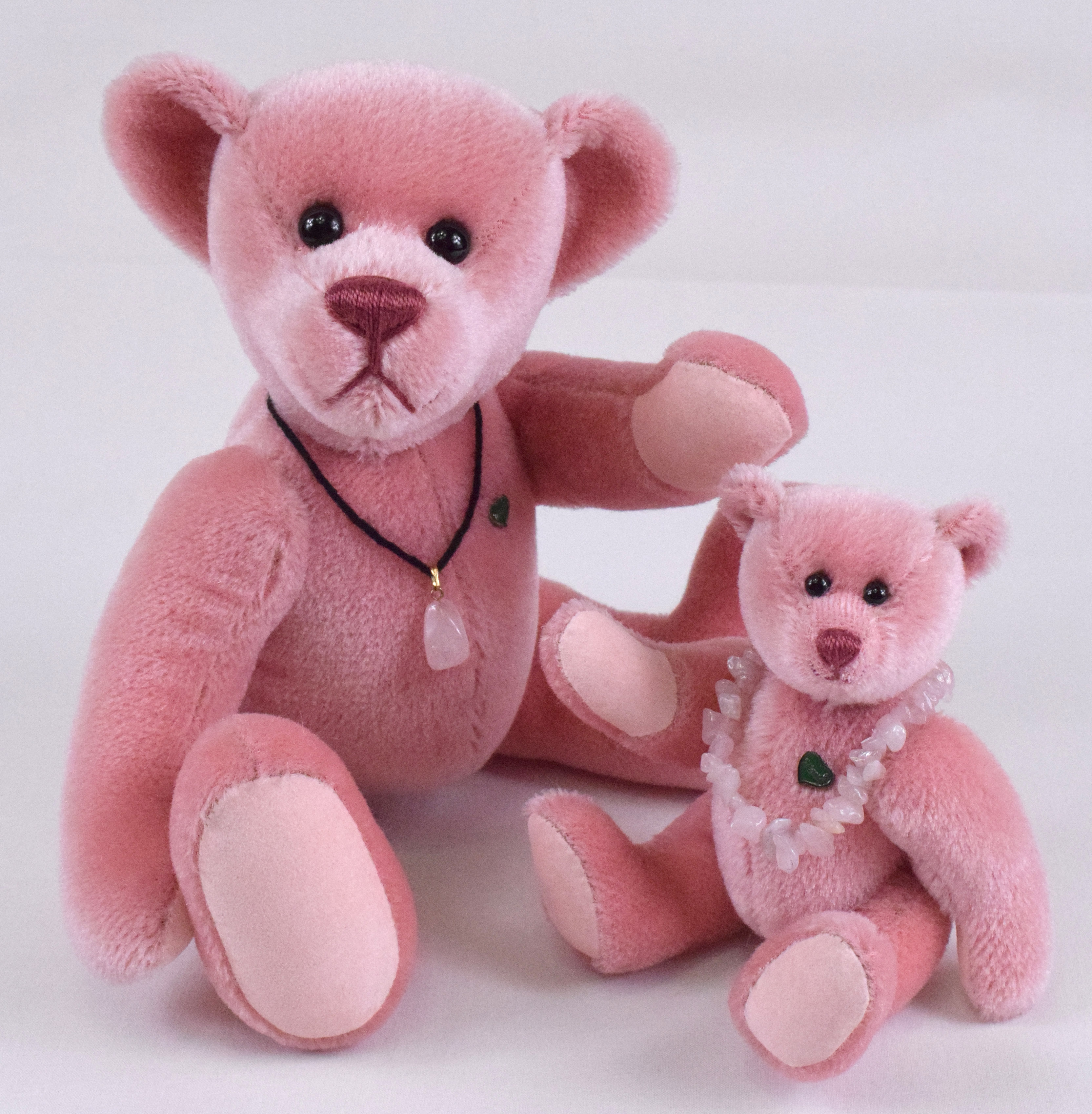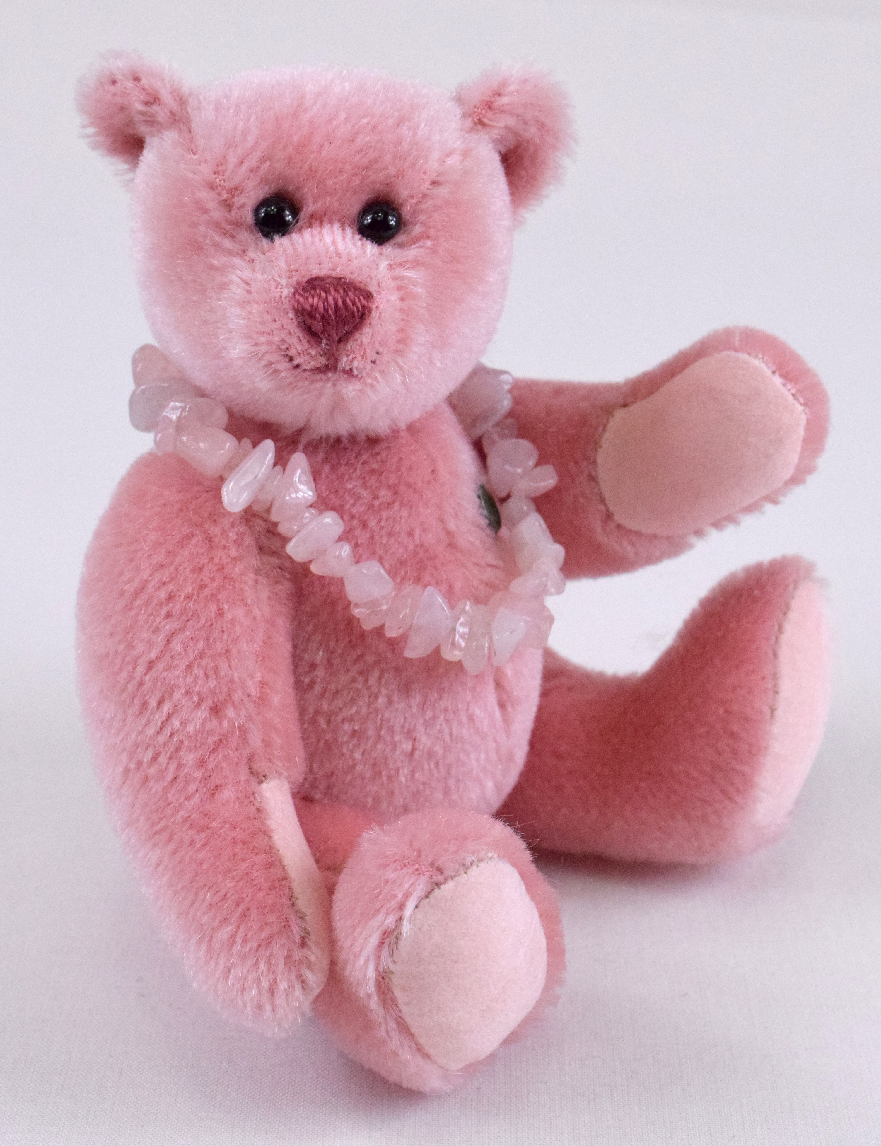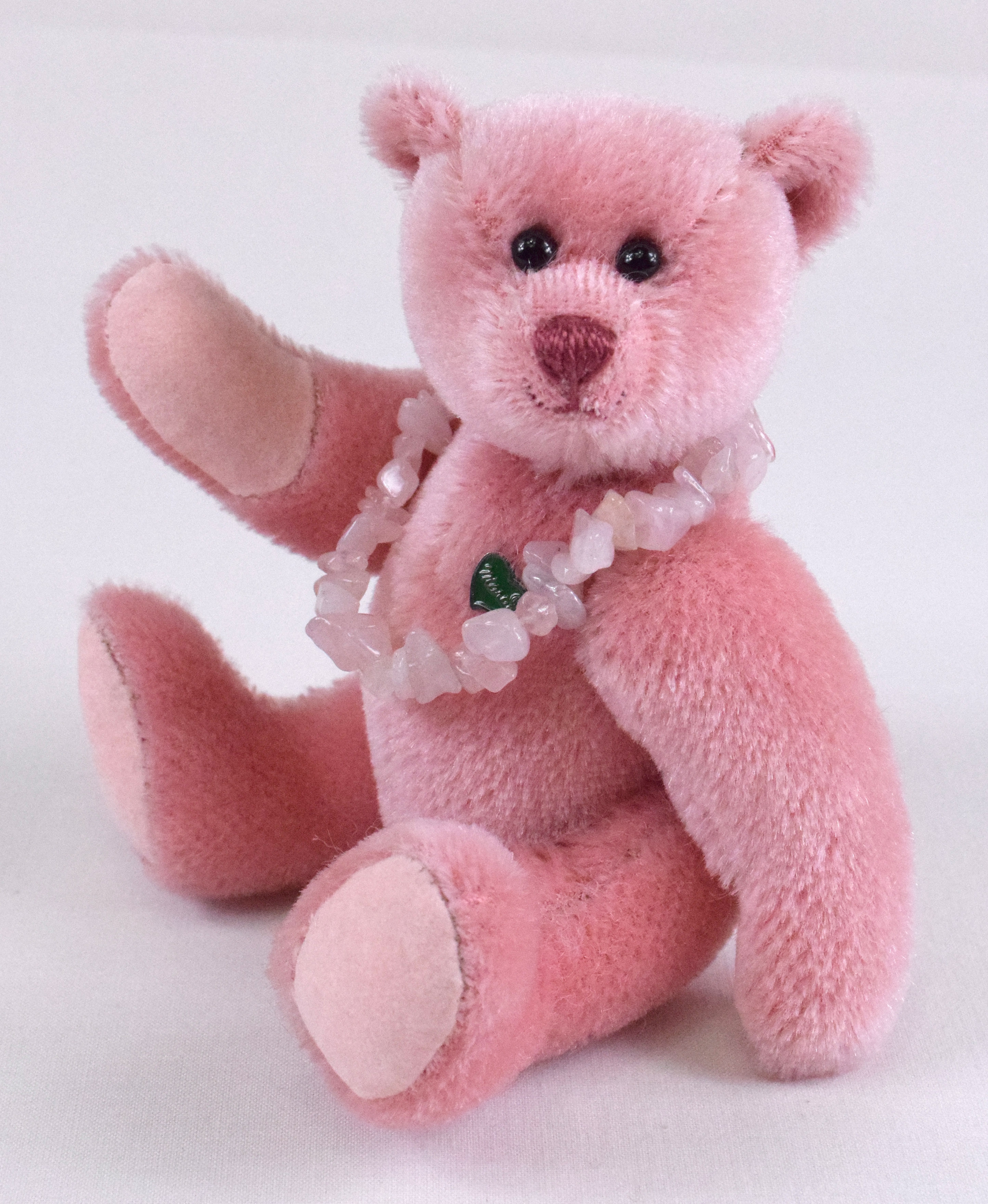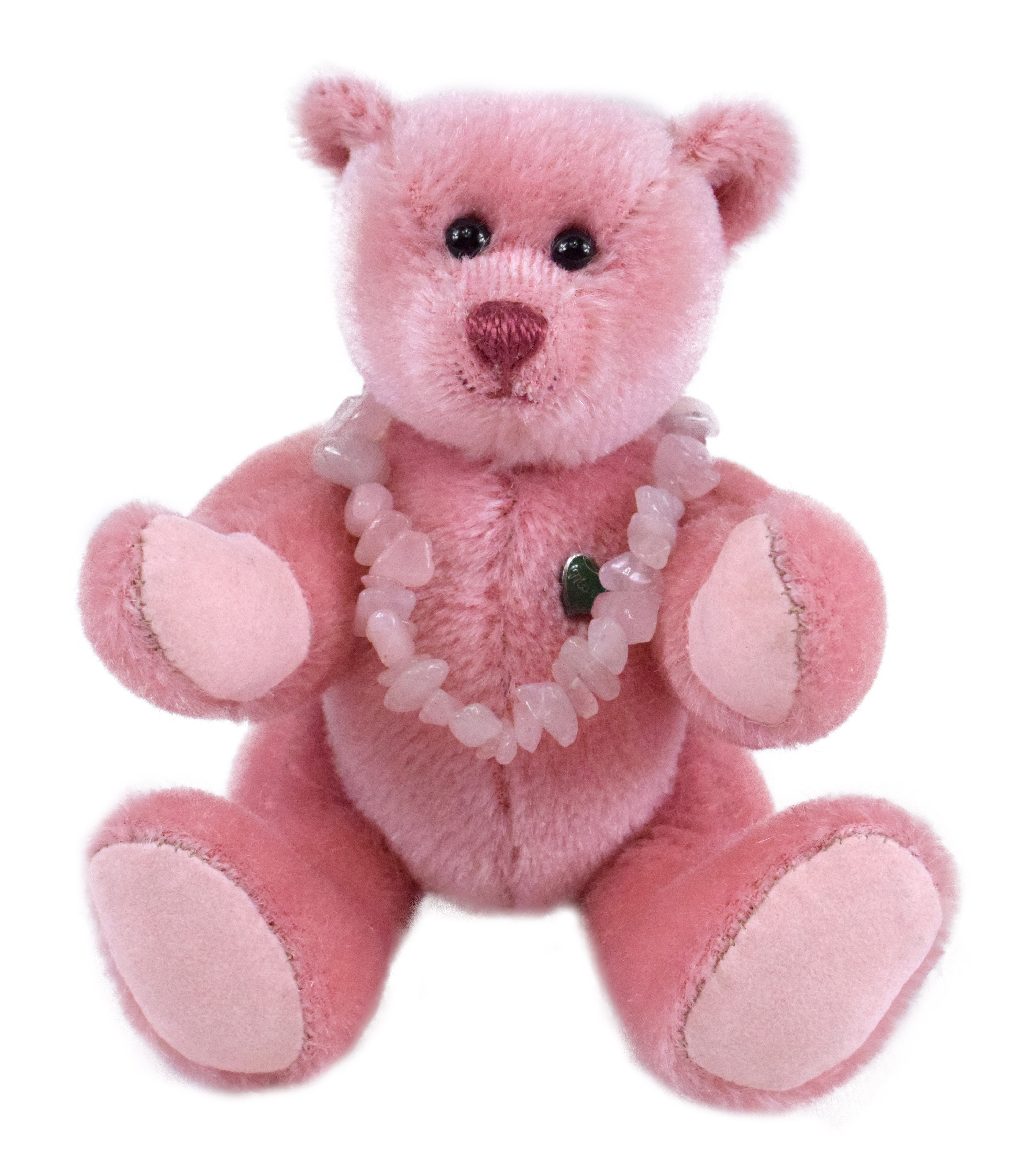 Der kleine Glücksbringer Rosenquarz ist eine 16cm großer, vliesgefüllter Mohairteddy mit echtem Rosenquarz - Armband. Das Armband ist abnehmbar und kann als Schmuck getragen werden.