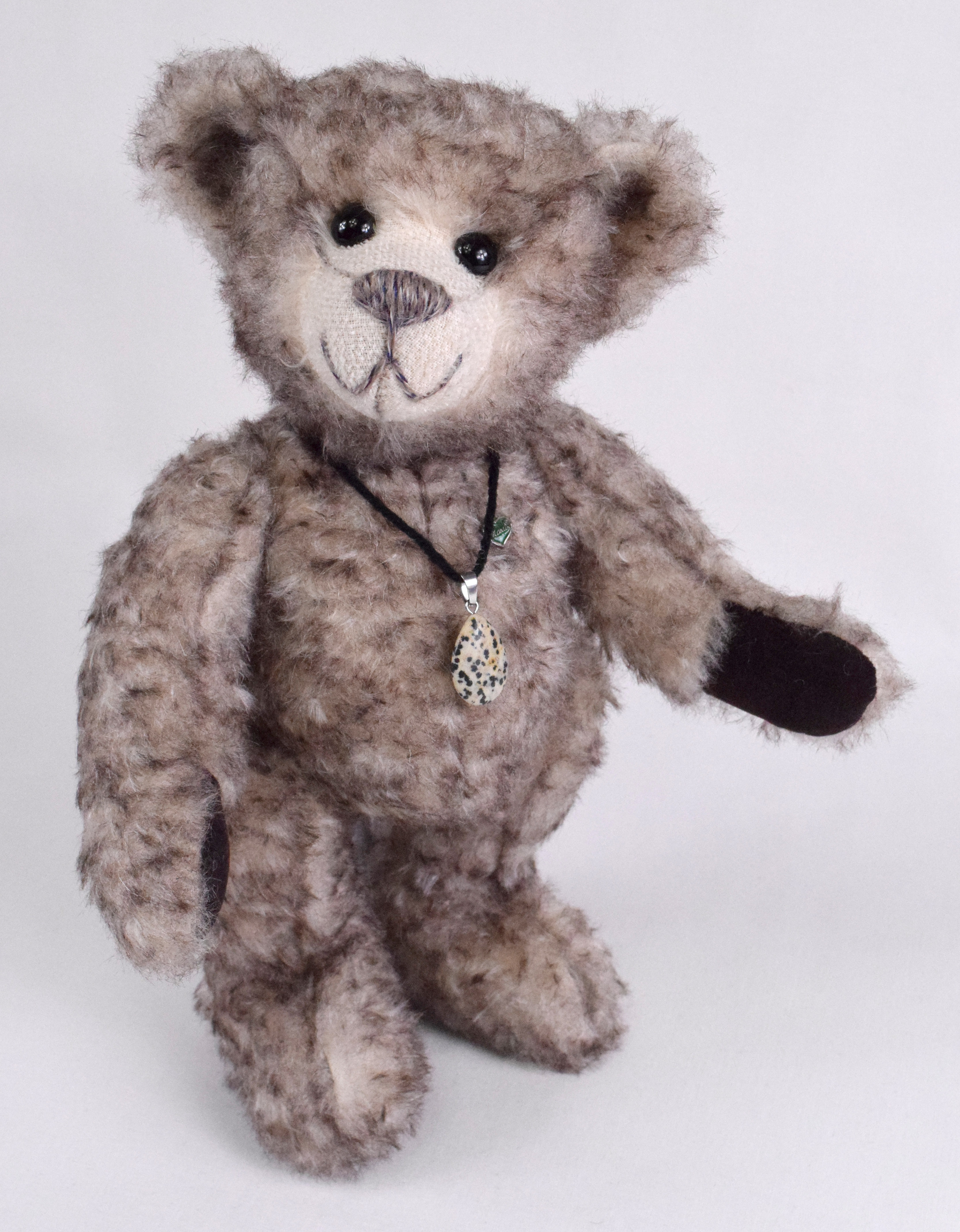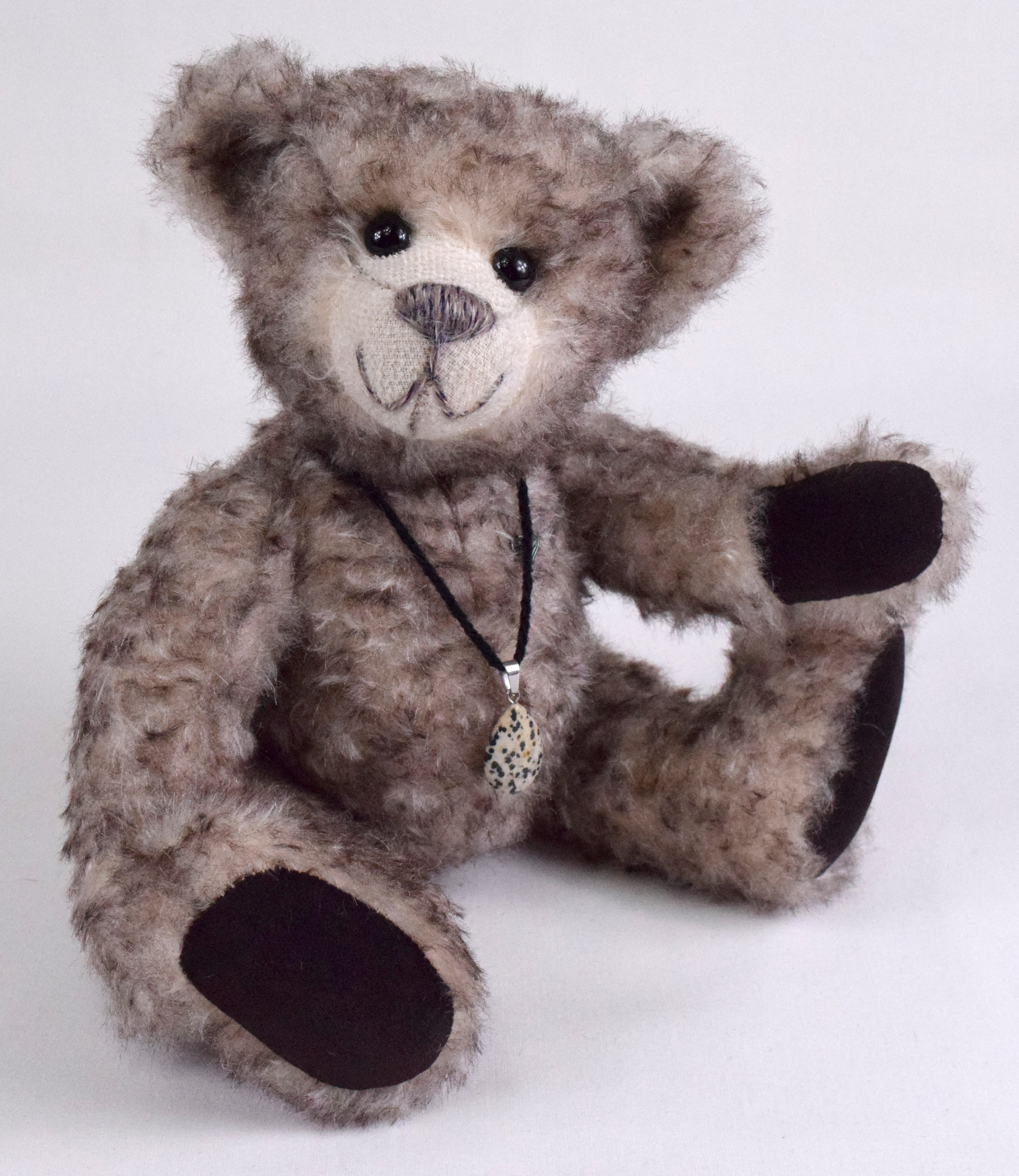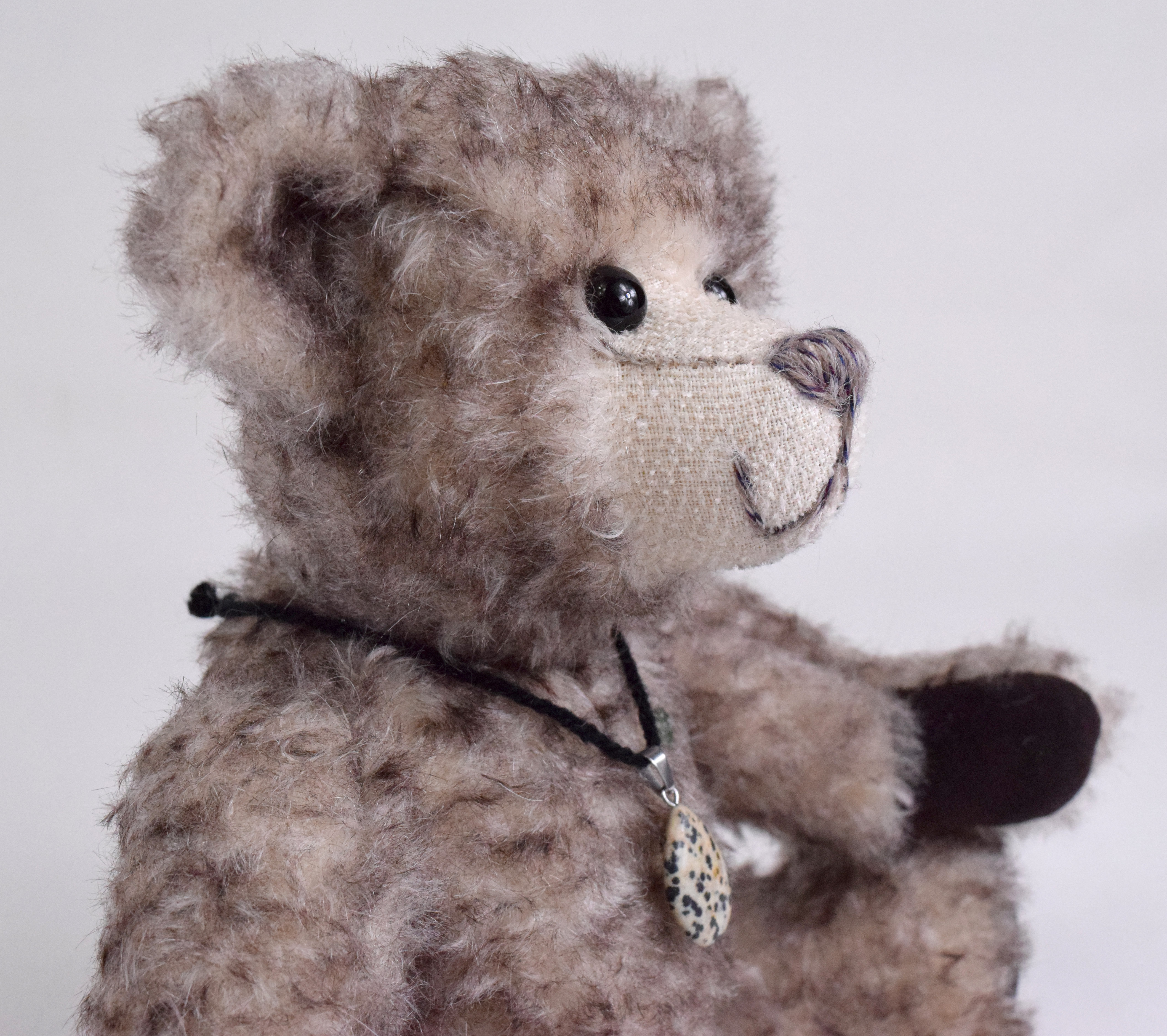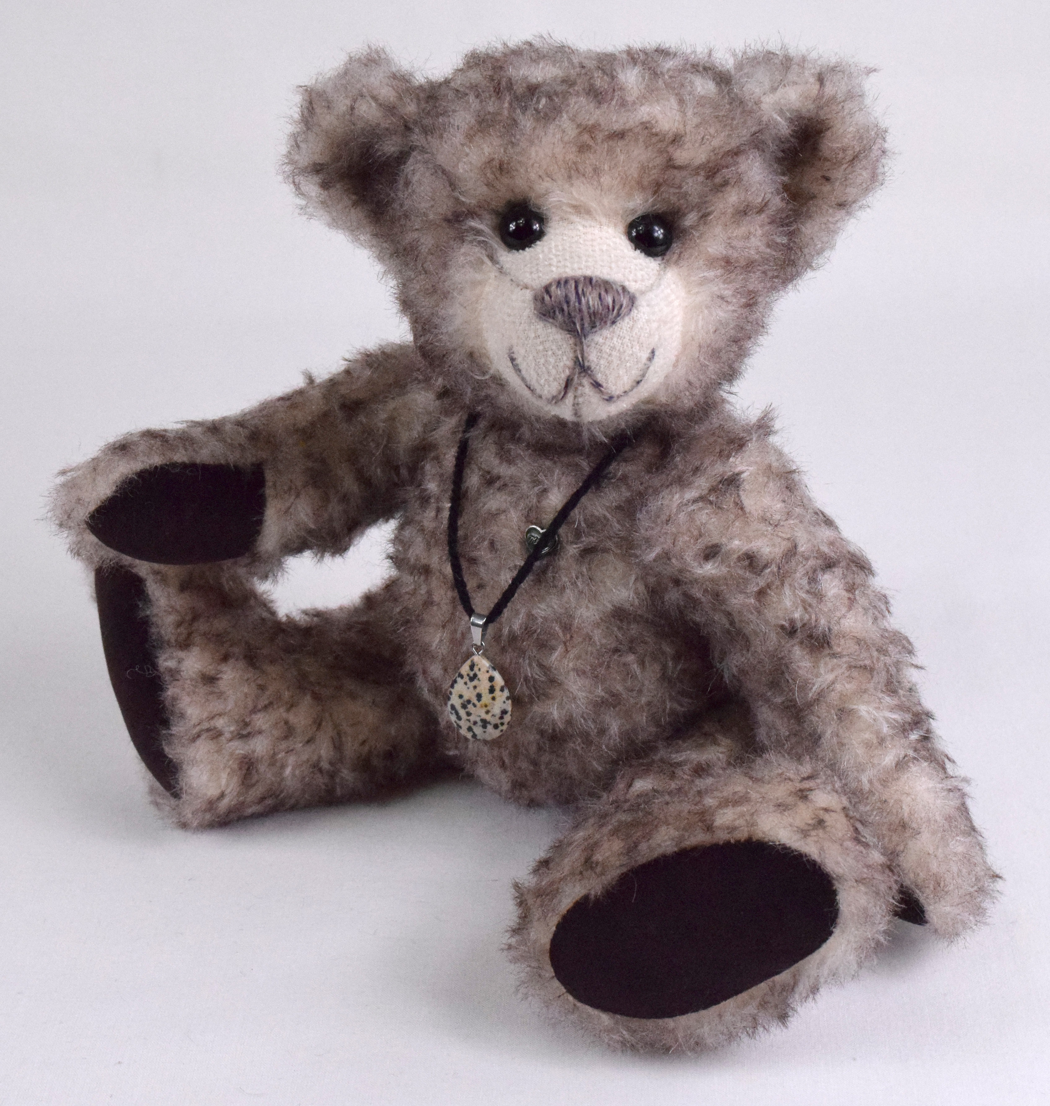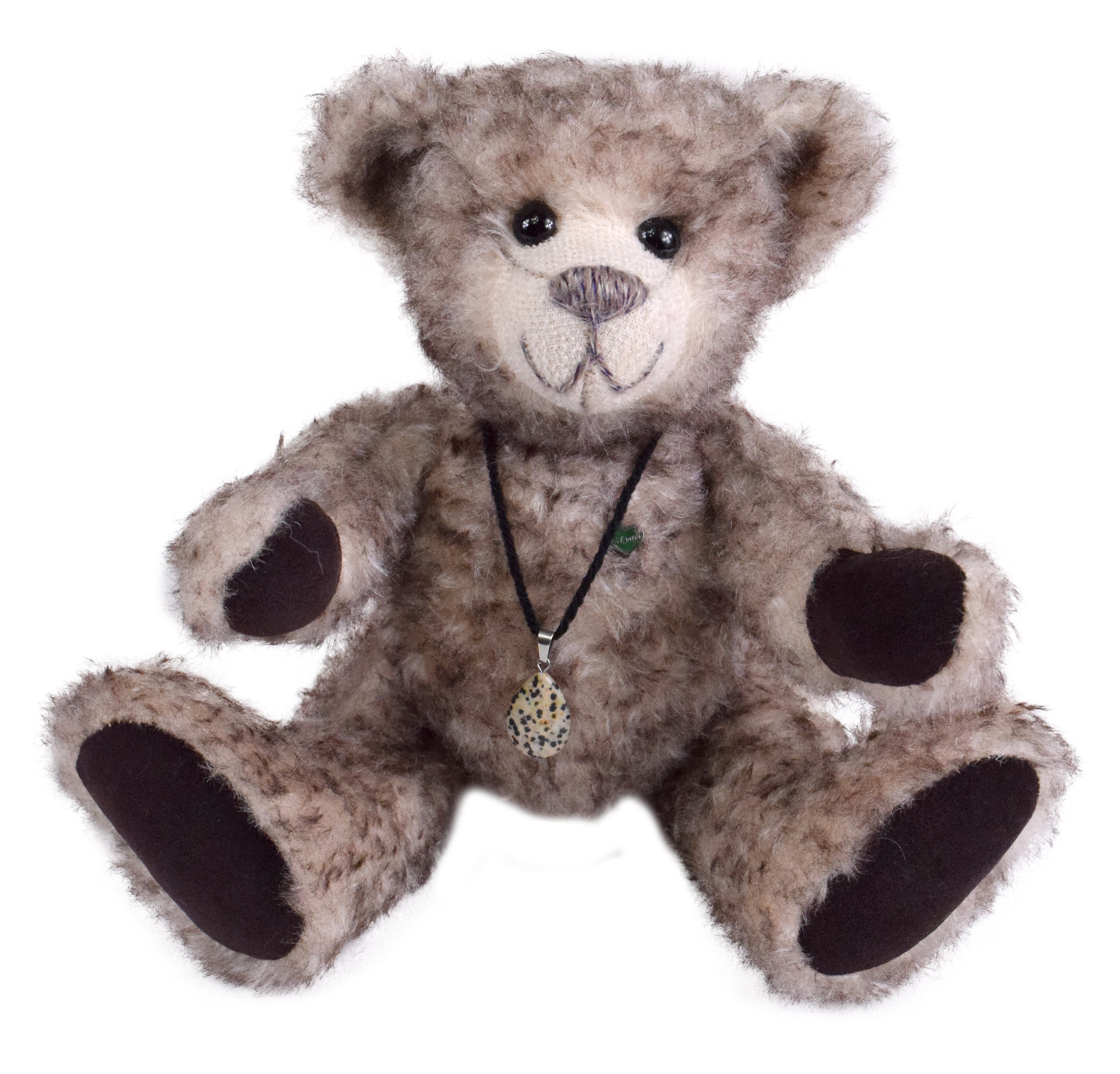 Ein vliesgefüllter Mohairteddy mit echtem Leopard-Jaspis als Glücksstein. Der Stein ist abnehmbar, so dass auch sie ihn tragen können und nicht unbedingt an dem Teddy lassen müssen.