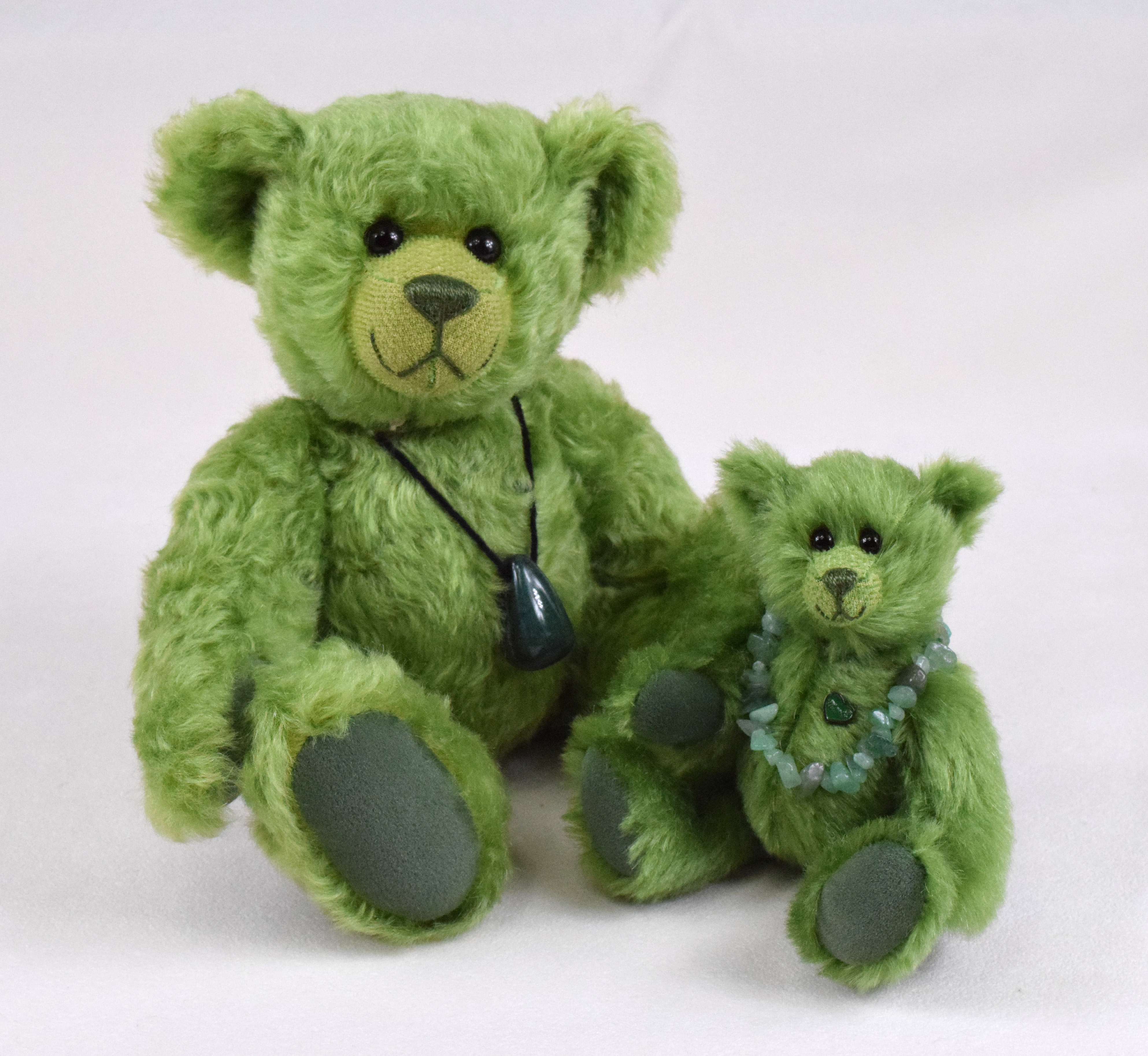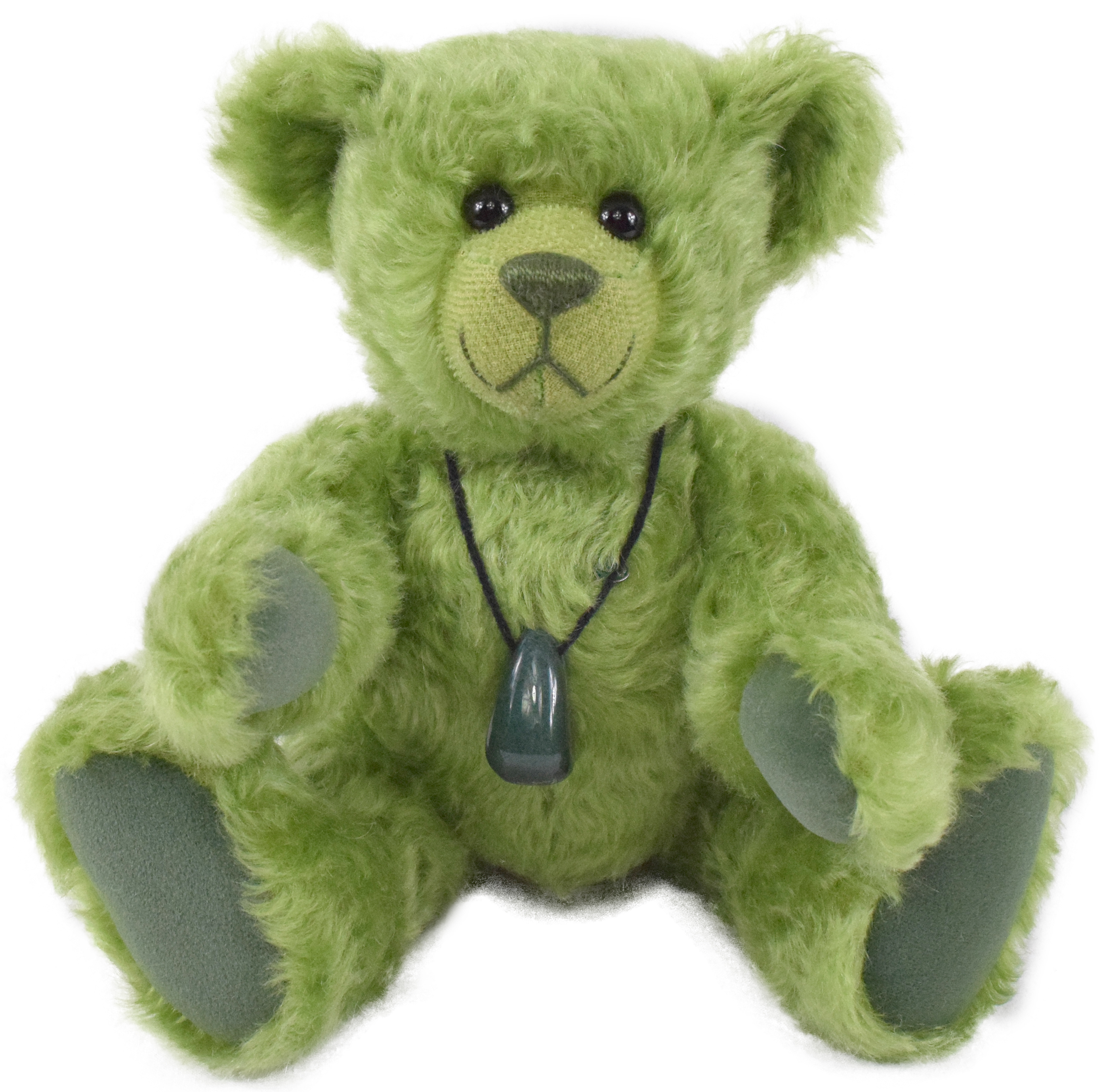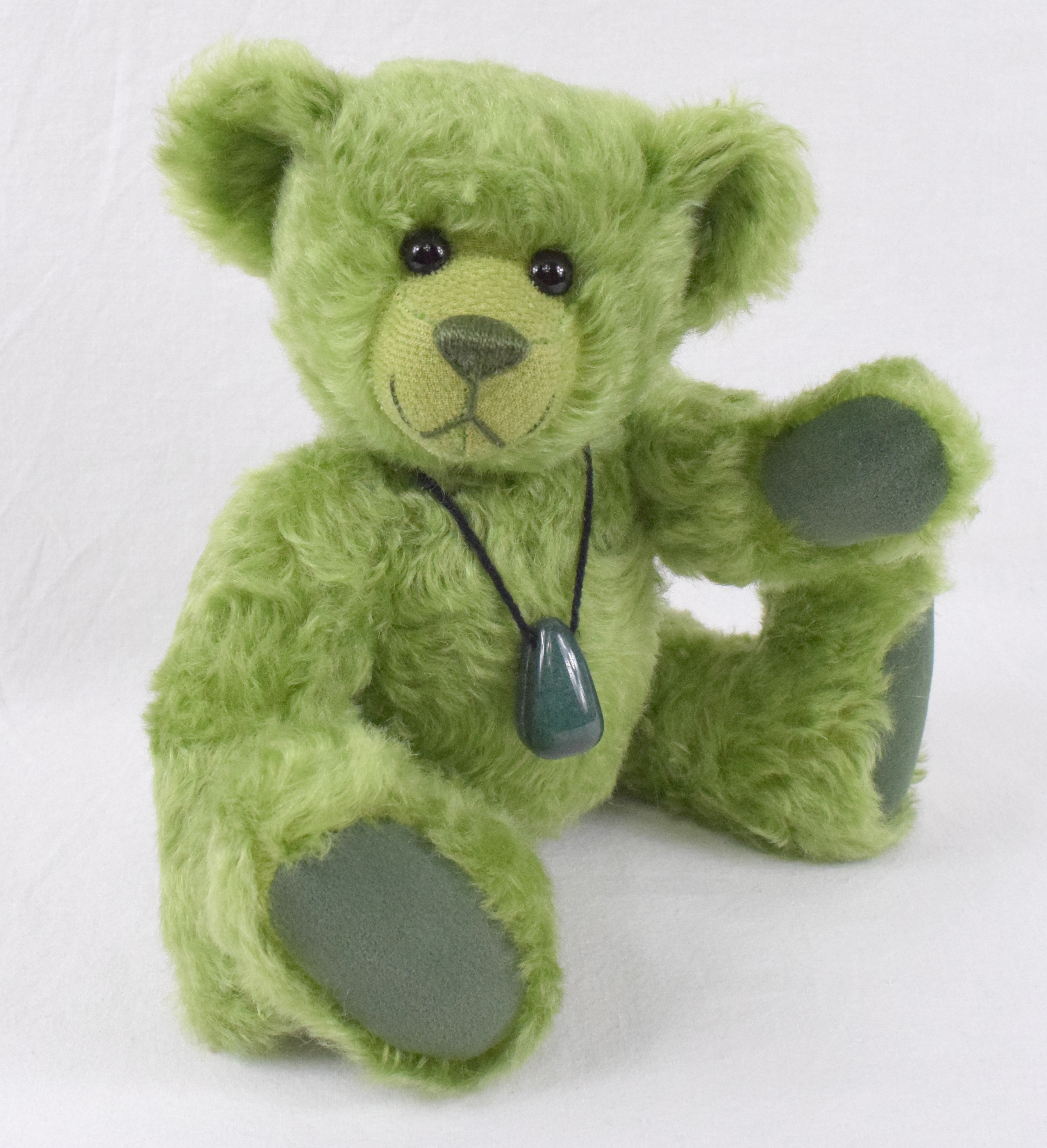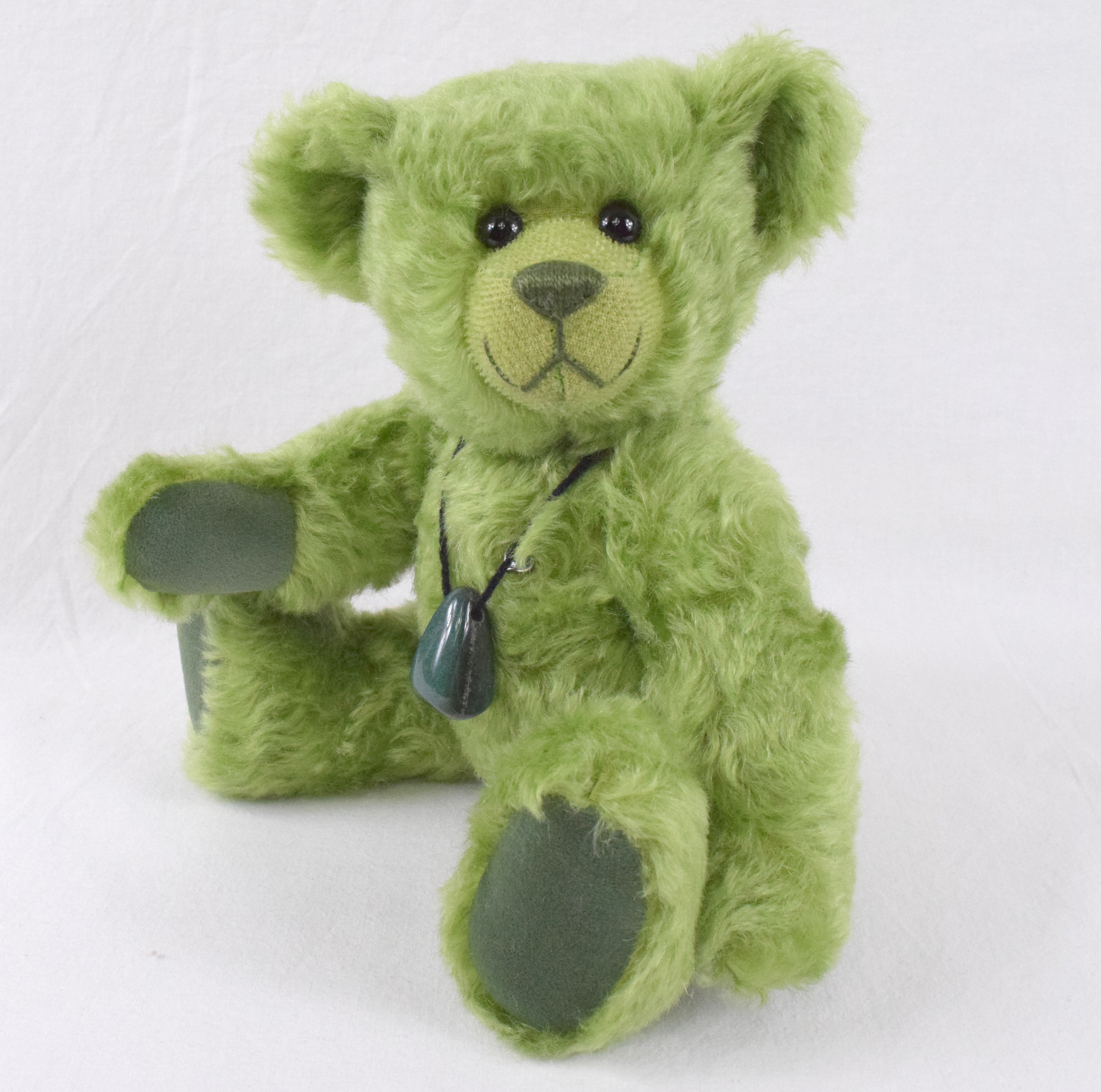 Ein 29cm großer, vliesgefüllter Mohairteddy mit echtem Aventurin als Glücksstein. Der Stein ist abnehmbar und kann als Anhänger mit eigenem Schmuck verwendet werden.
