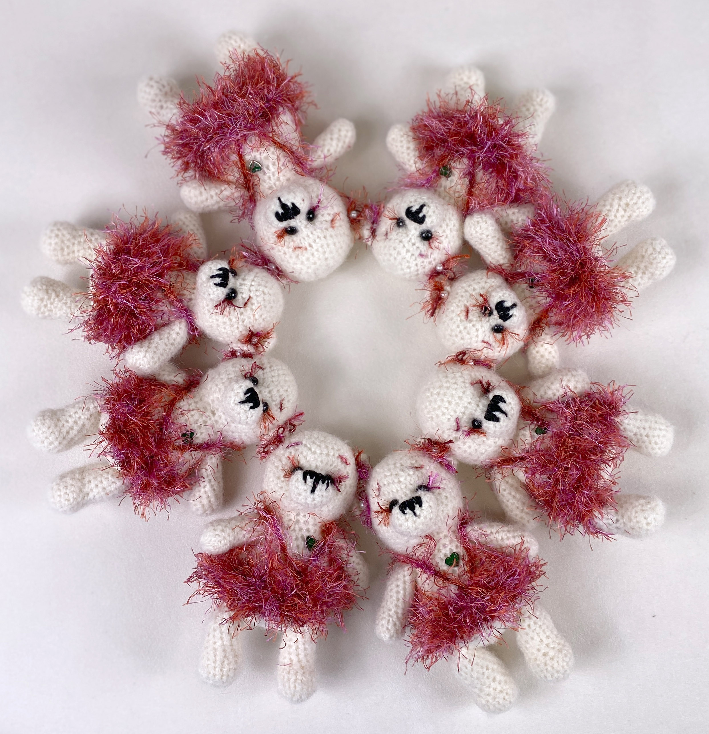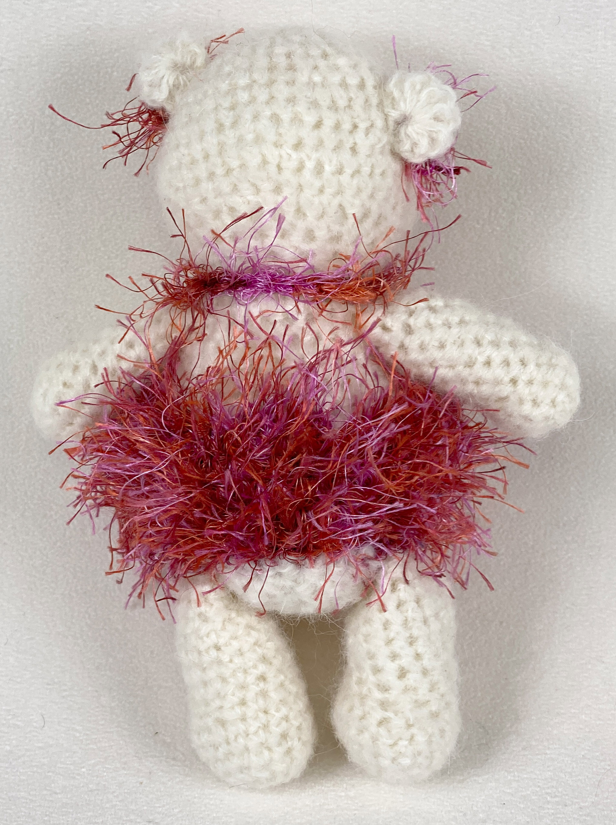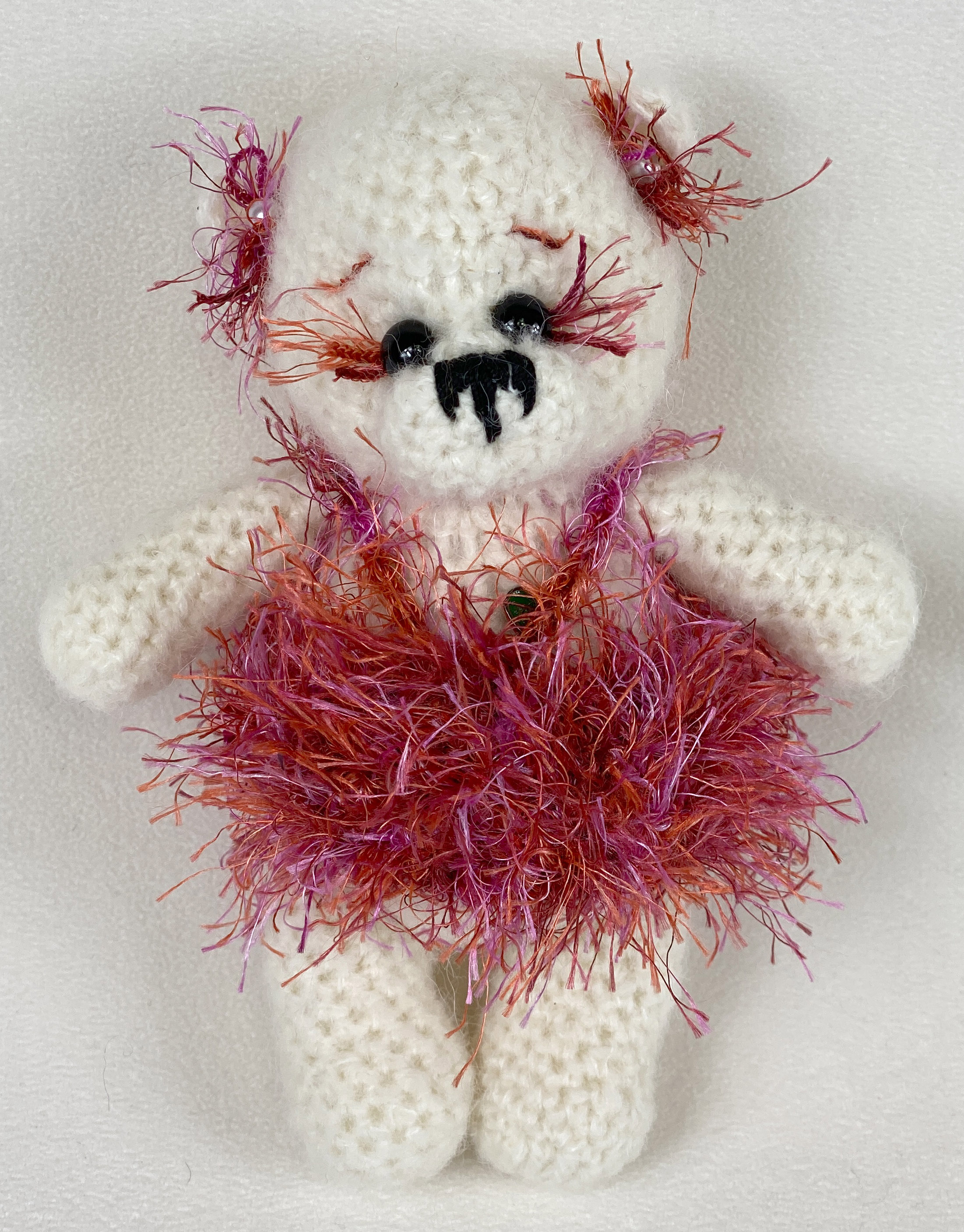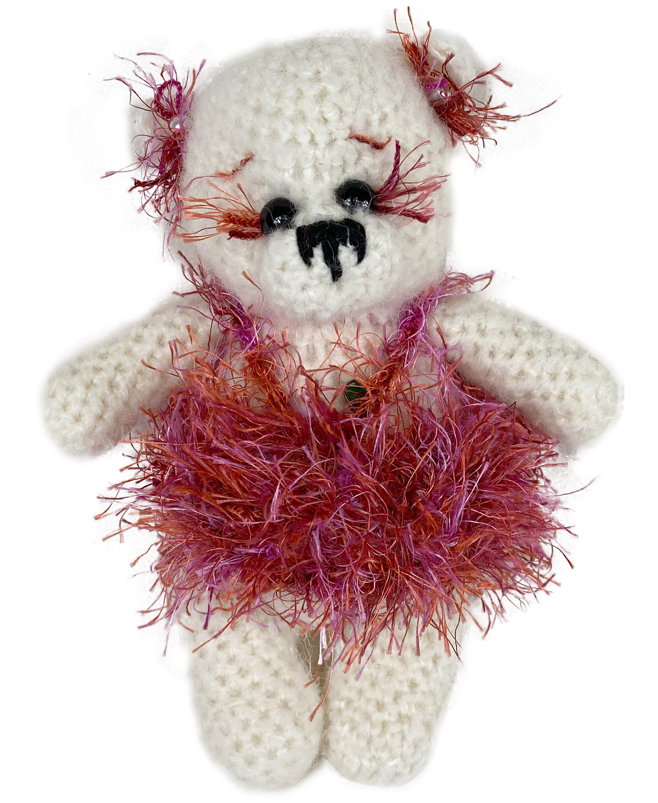 Dieser Häkelteddy ist aus weißer Wolle gehäkelt. Mit besonderer Wolle ist das angedeutete Tütü sowie die Kette und der Ohrschmuck abgesetzt. Markant bei diesem Teddybär sind seine zum Teddy-T gestickte Nase und die Augenbrauen, die ihn diesen niedlichen Blick verleihen.