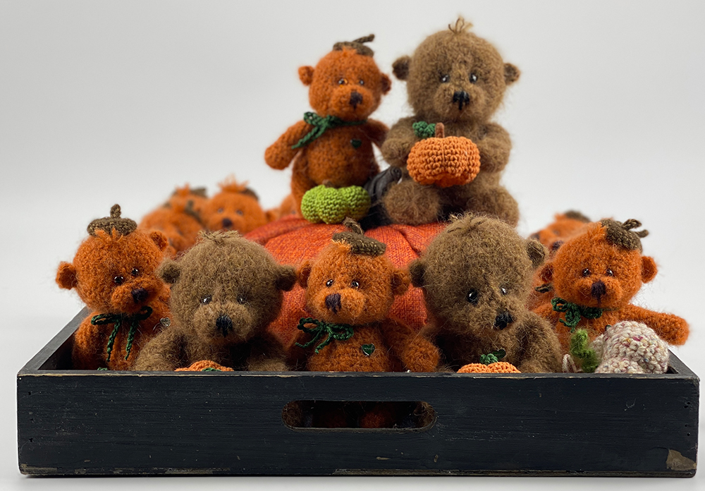 Häkel-Teddybärchen Kürbi ist aus Alpaca-Häkelwolle in kürbisoranger Farbe gehäkelt. Es ist 12cm groß, hat ein gesticktes Teddy-T-Näschen und braune Glasaugen sowie eine pfiffigen Frisur. Es trägt eine kleine, braune Mütze, die an einen Kürbisstrunk erinnert und eine gehäkelte, grüne Schleife.