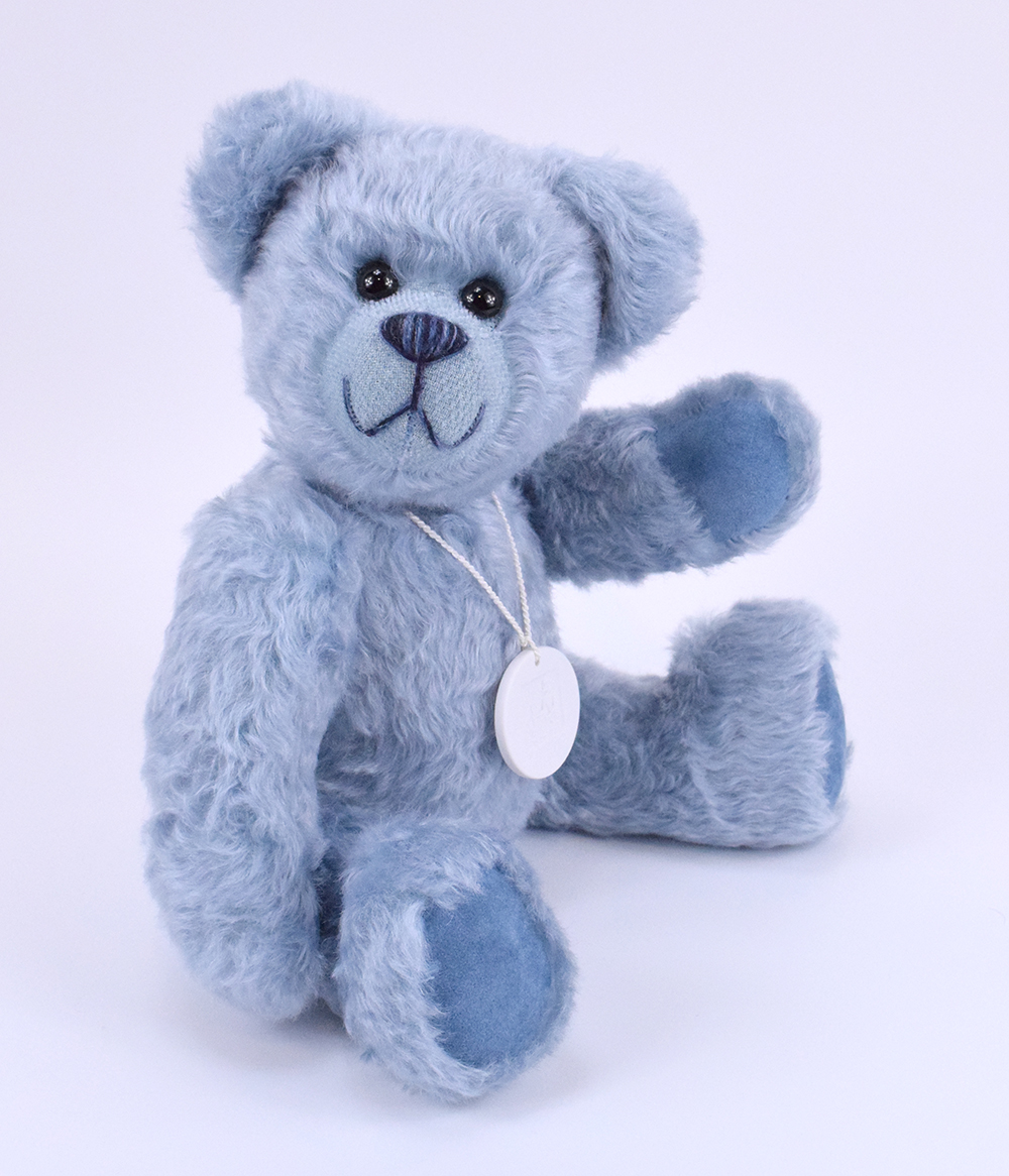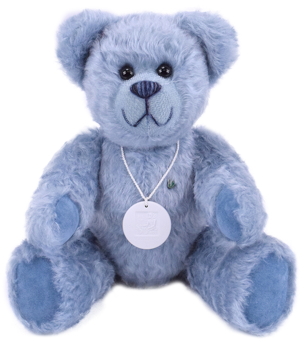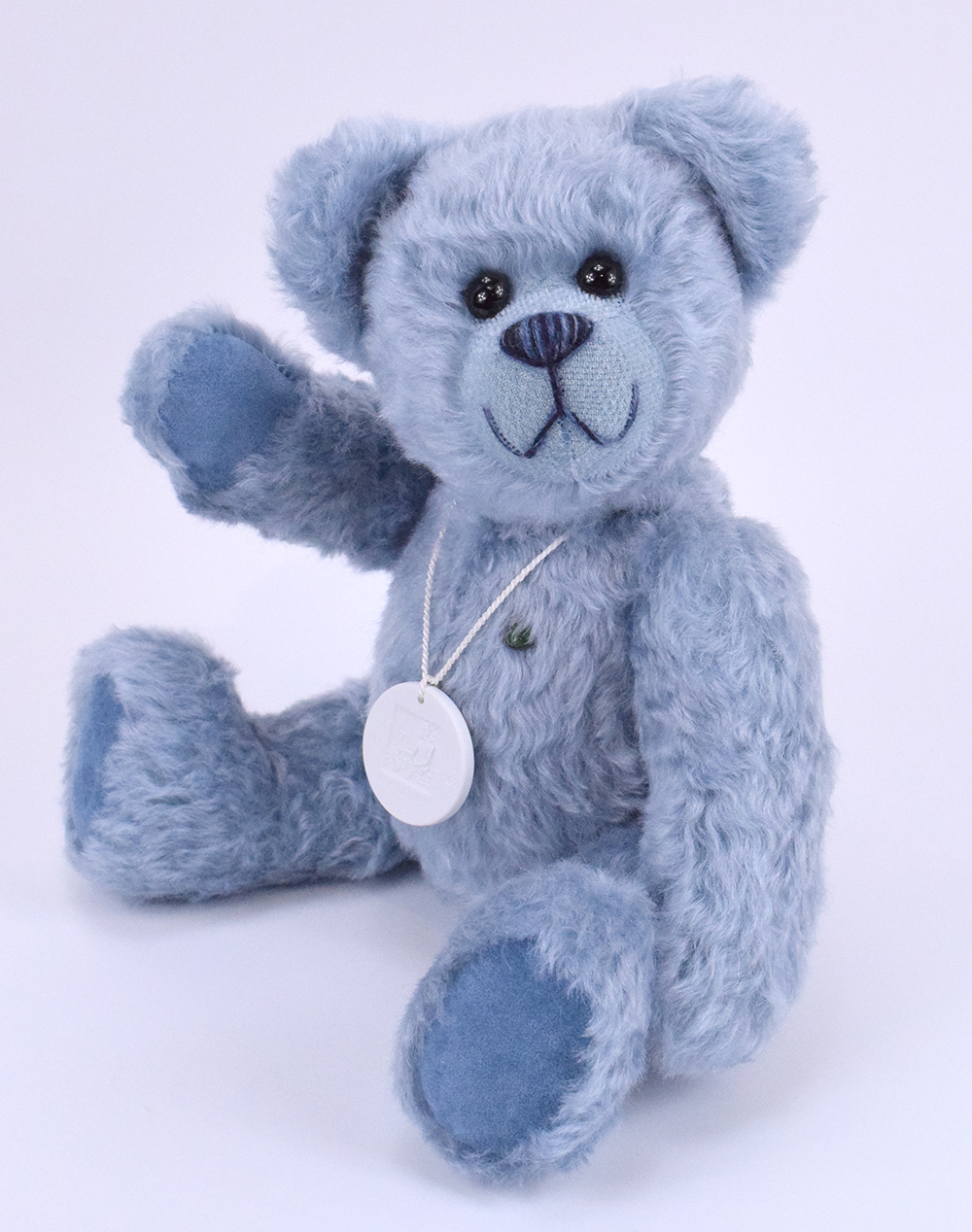 Der Teddybär hat blaues Mohairfell sowie eine Brummstimme. Das Schnäuzchen ist mit Garn in verschiedenen Blautönen gestickt. Der große Horoskopbär Wassermann ist weltweit auf 100 Stück limitiert.