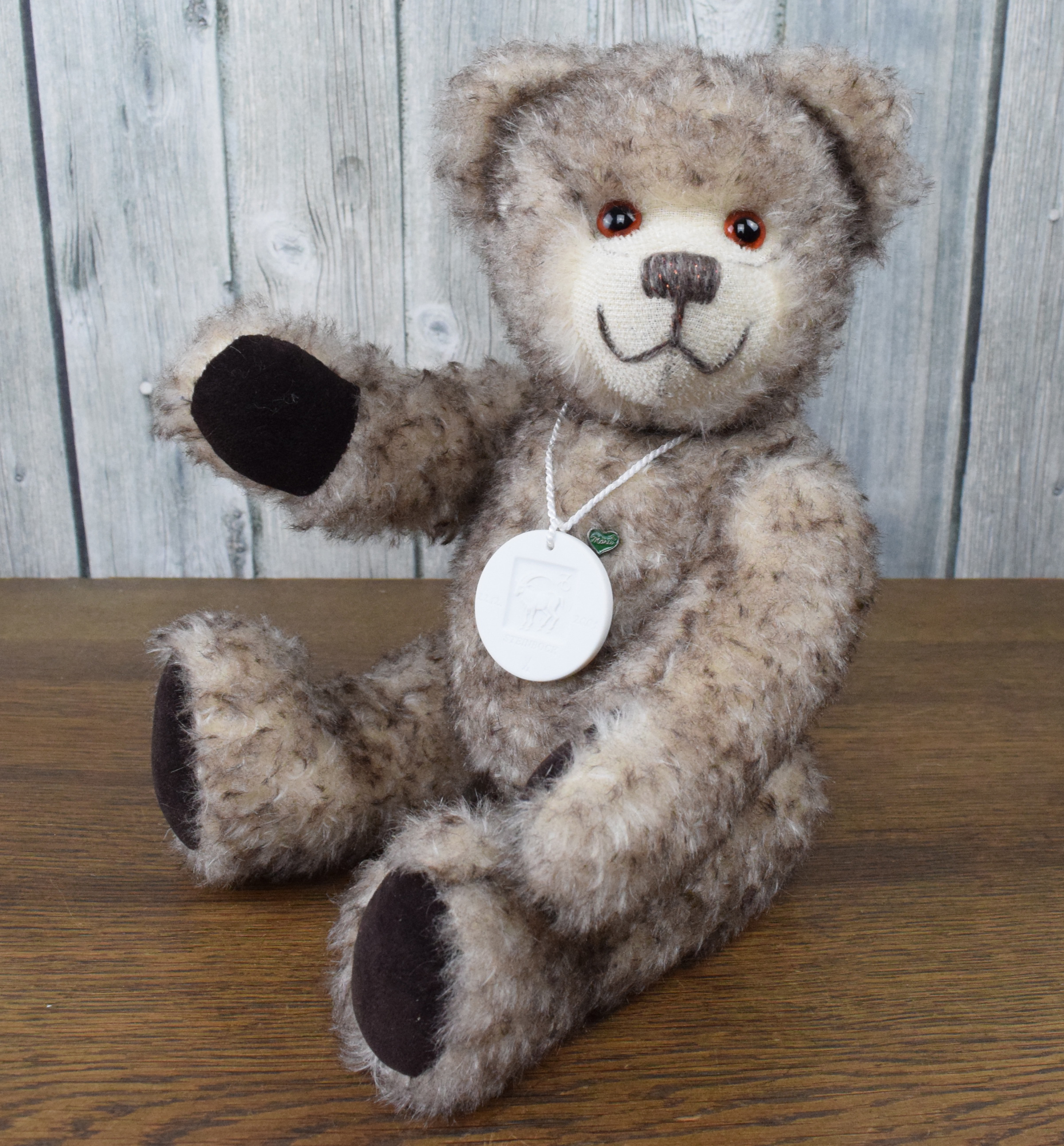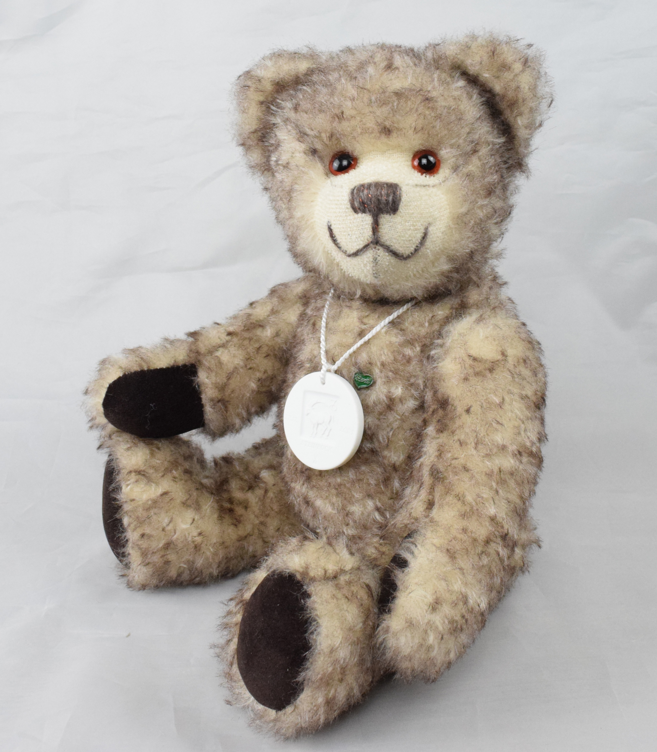 Der vliesgefüllte Teddybär trägt beige-braun gespitztes Mohairfell und dunkelbraune Pfoten und Sohlen. Durch das geschorene Schnäuzchen erkennt man besonders gut das liebe Lächeln und die braunen Augen. Der Teddybär ist weltweit auf 100 Stück limitiert.