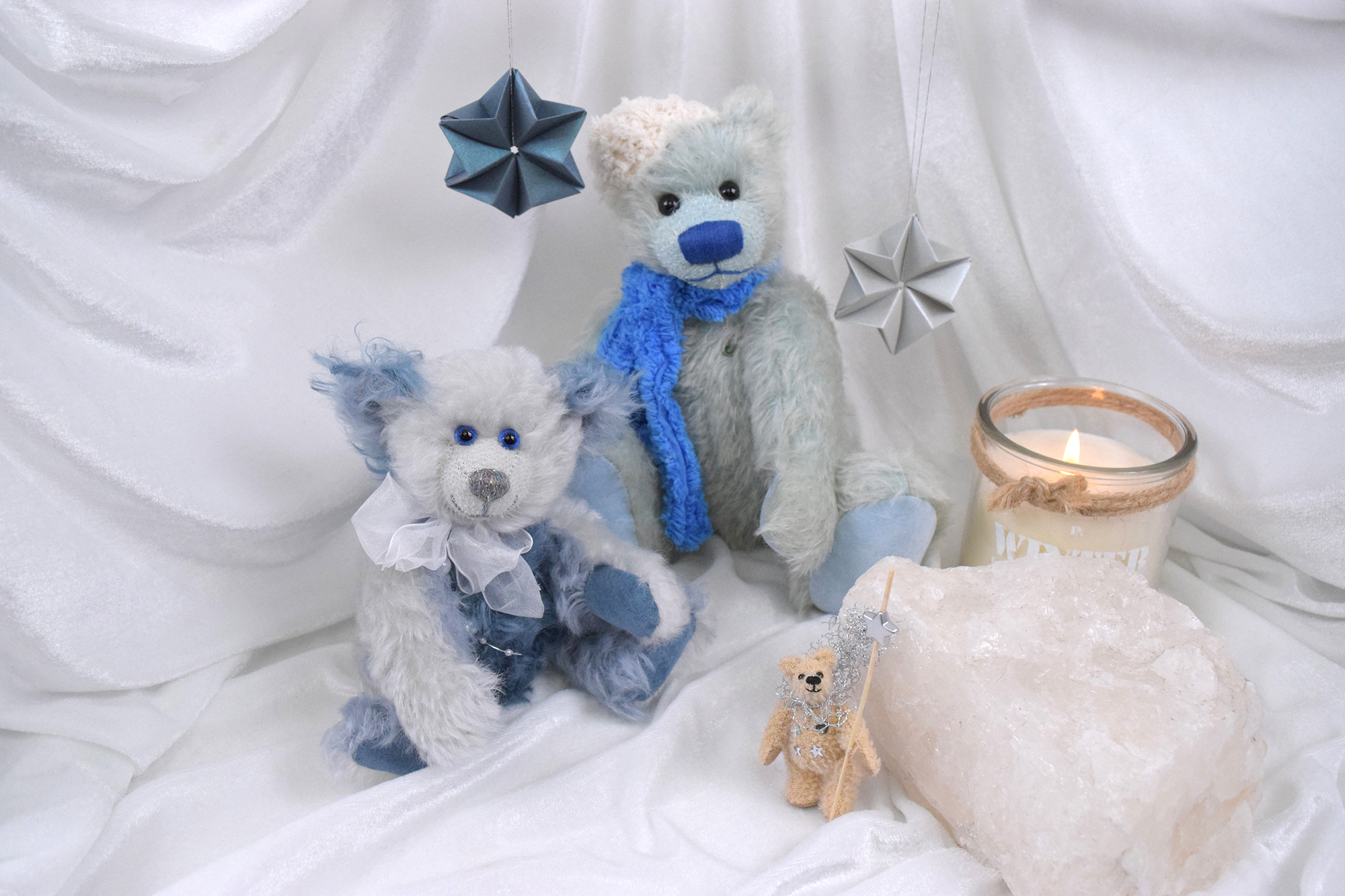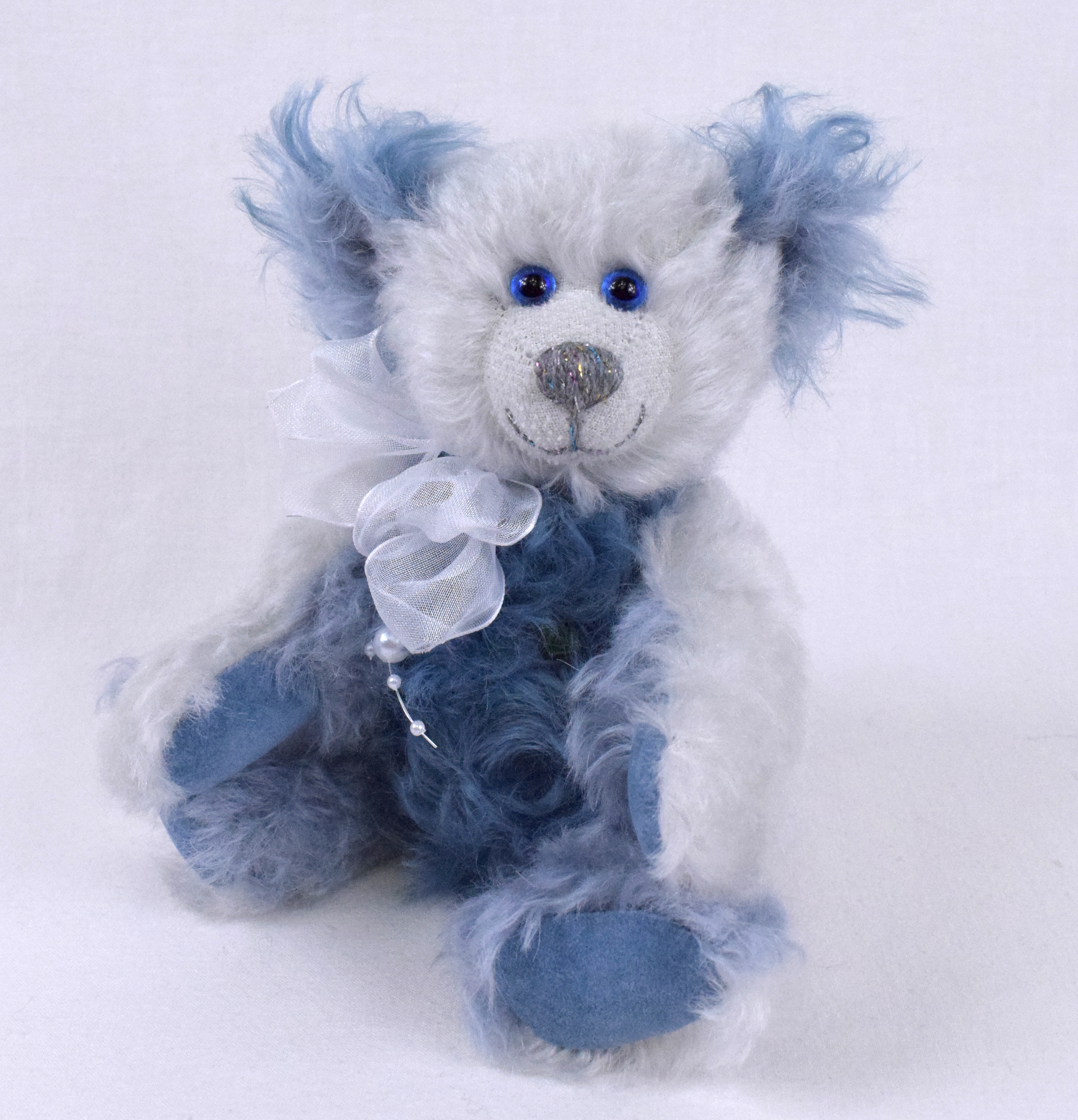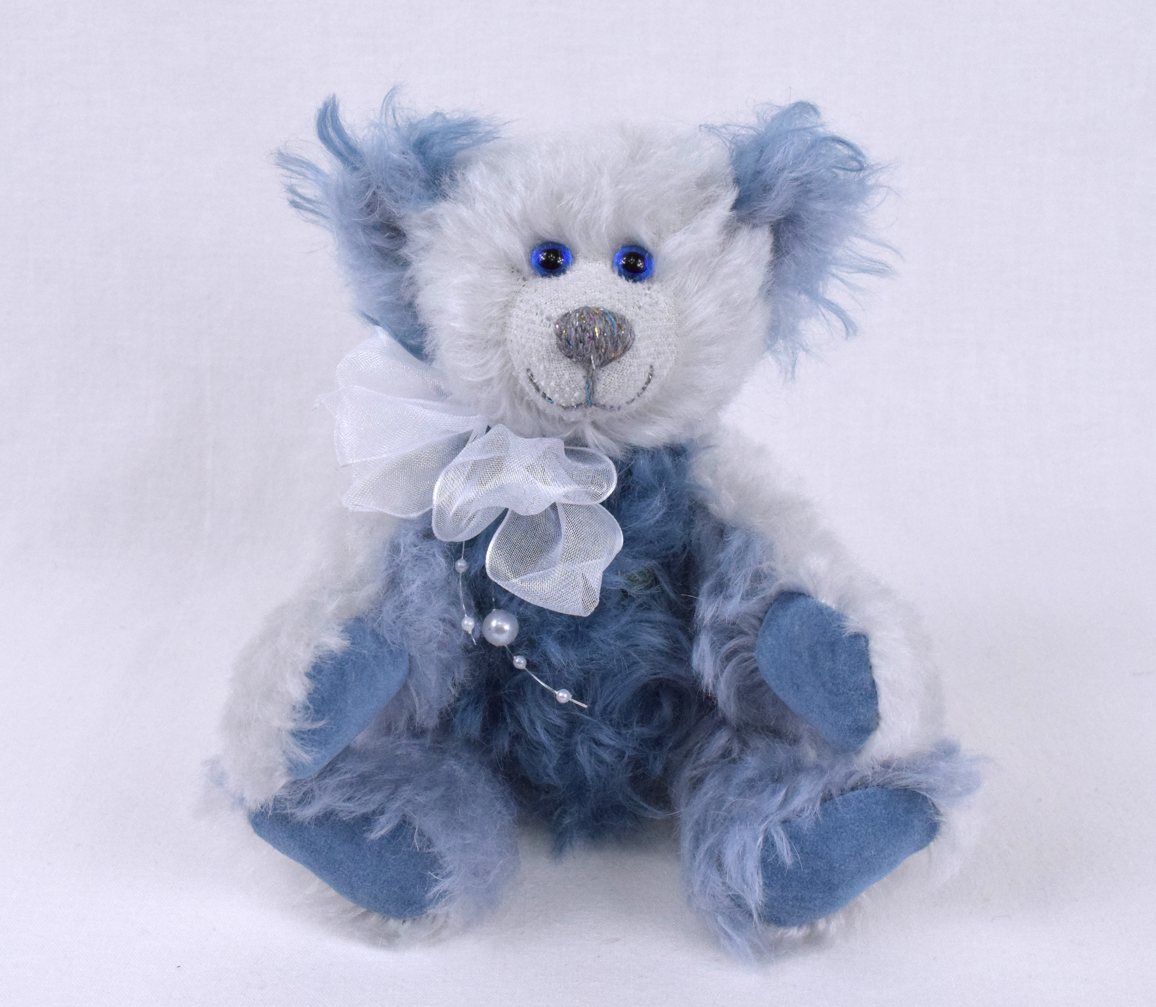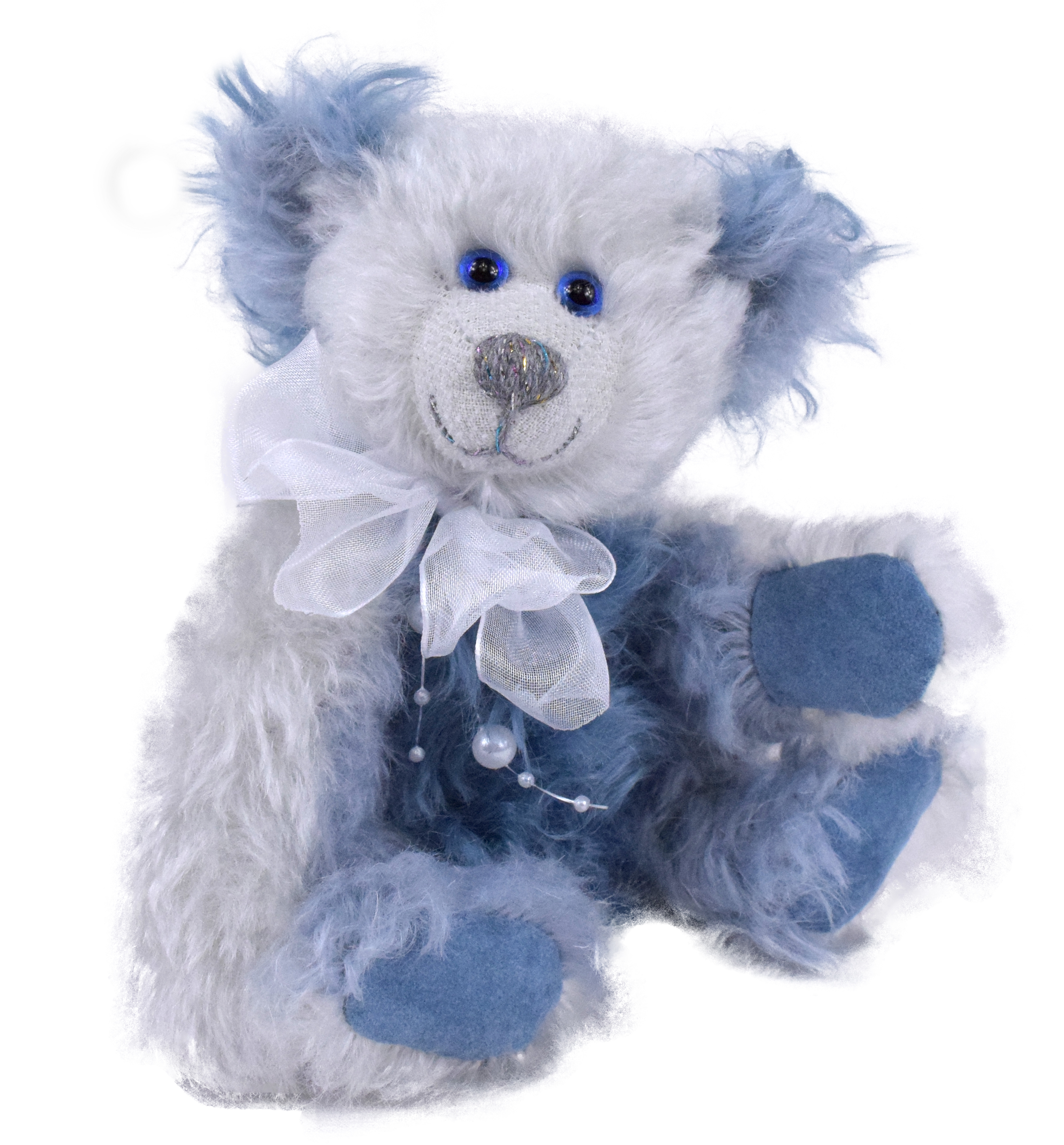 Snowy ist da! Das süße Bärchen ist in Blau- und Weißtönen gehalten. Das Wort "Snow" kommt aus dem Englischen und bedeutet Schnee. Das passt genau zu unserem Kuschelbärchen. Seine Nase glitzert wie Schnee und auch die Perlen an seiner Schleife erinnern daran. Snowy ist 23cm groß und durch sein flauschiges, gelocktes Mohairfell sowie der weichen Füllung wunderbar kuschelig. Der kleine Teddybär, der sehr gut in eine Hand passt, strahlt in den hübschen Farben Rauchblau, Hellblau und Weißgrau. Als modisches Accessoire trägt das Kuschelbärchen eine weiße Schleife.