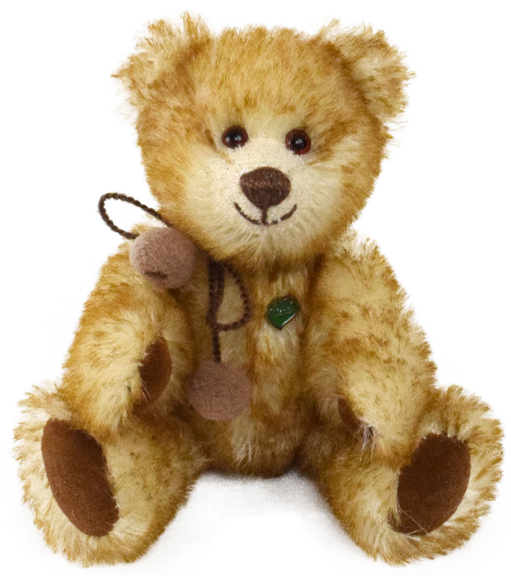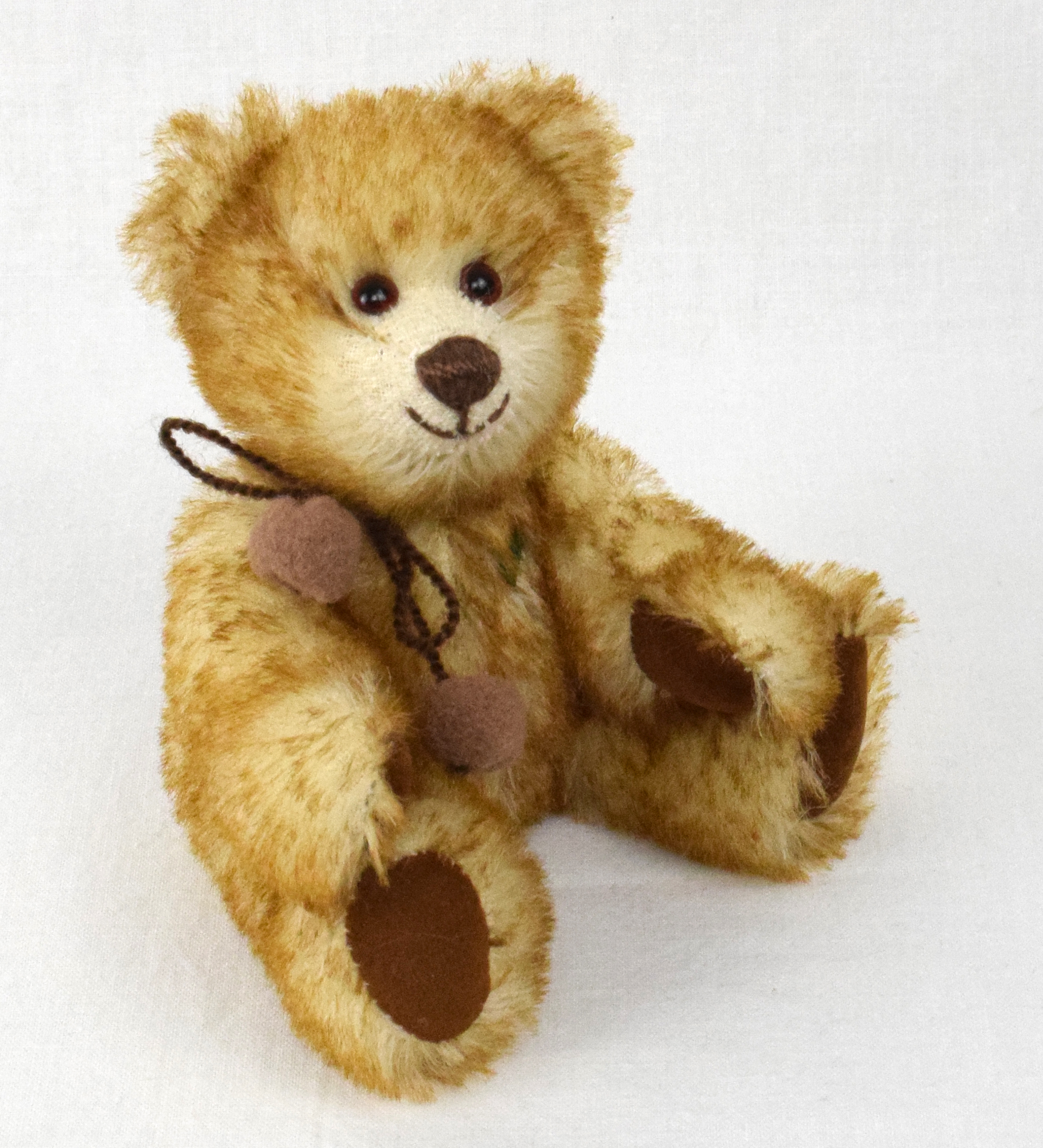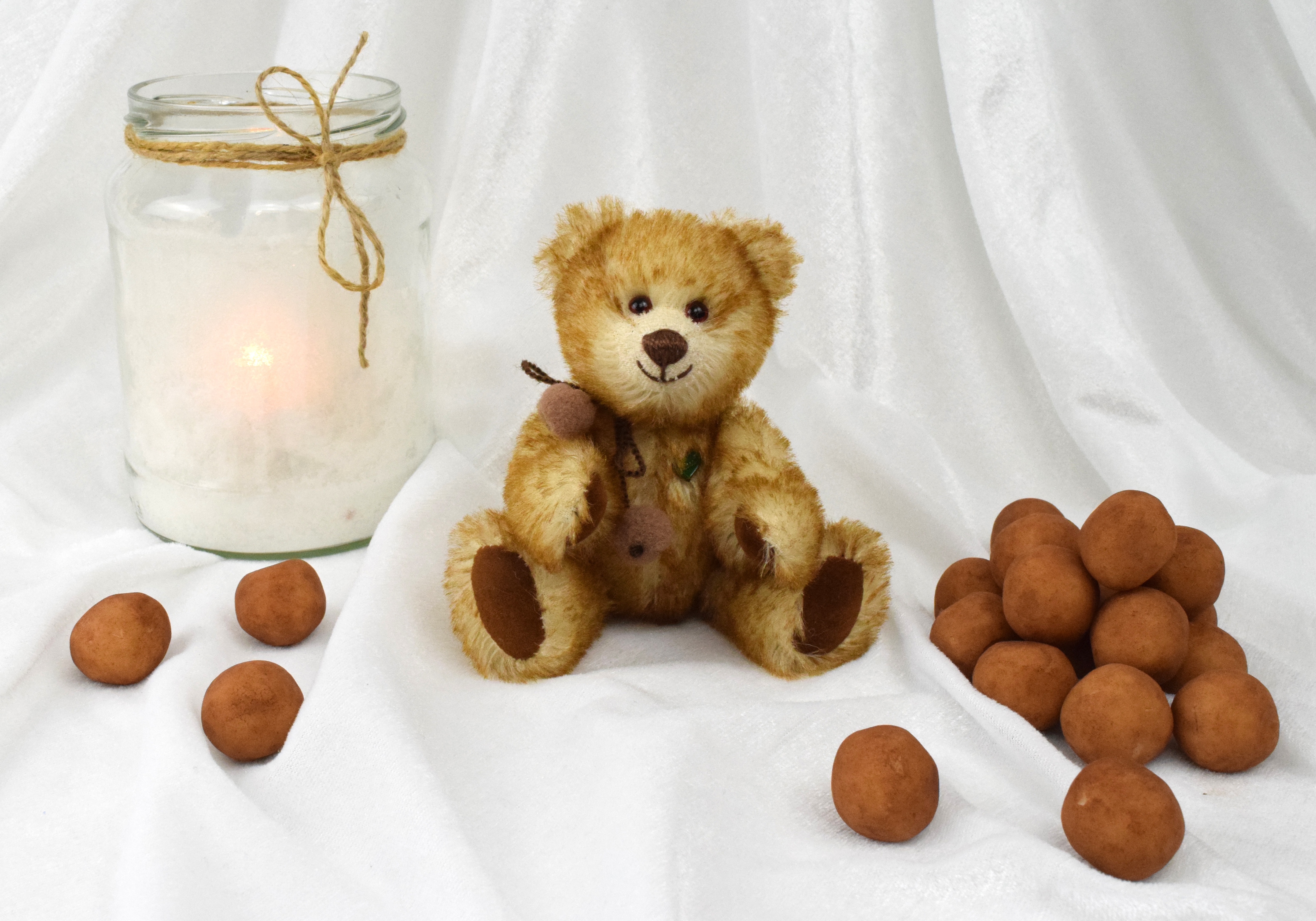 Eine leckere Marzipankartoffel ist eine typische (Weihnachts-) Süßigkeit und darf in unserer Teddybären-Süßigkeiten-Serie nicht fehlen. Der kleine Kerl ist 15cm groß und aus hellem Mohair mit Marzipanfarbenen Spitzen gemacht. Er trägt kleine Marzipan-Stoff-Kartöffelchen um den Hals.