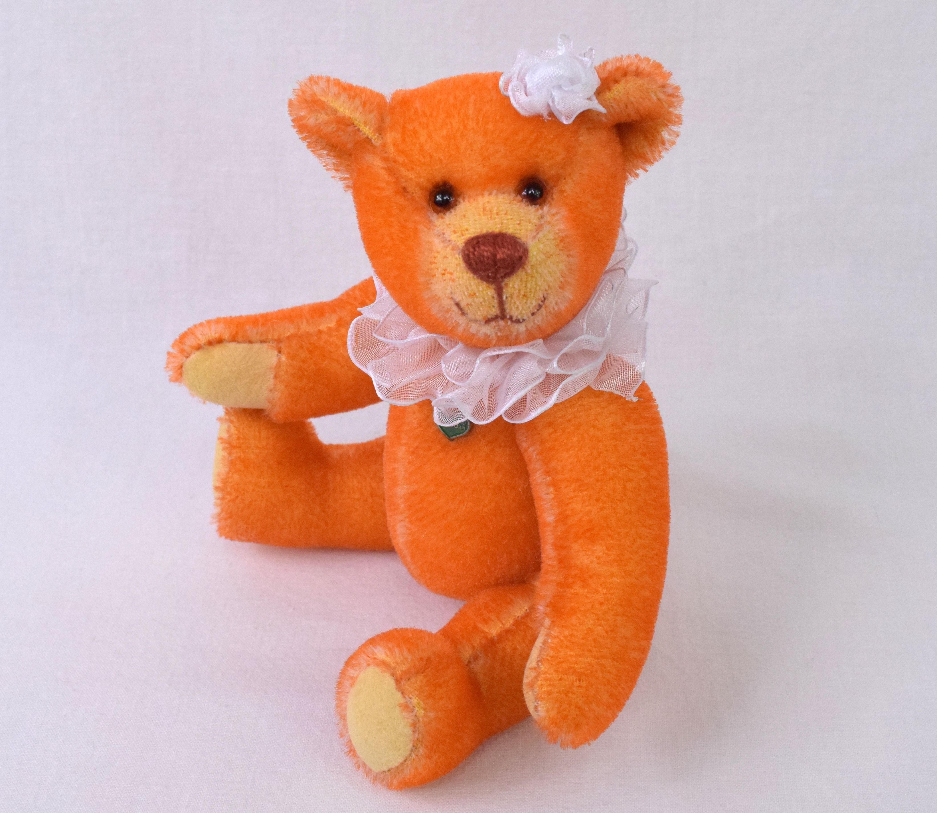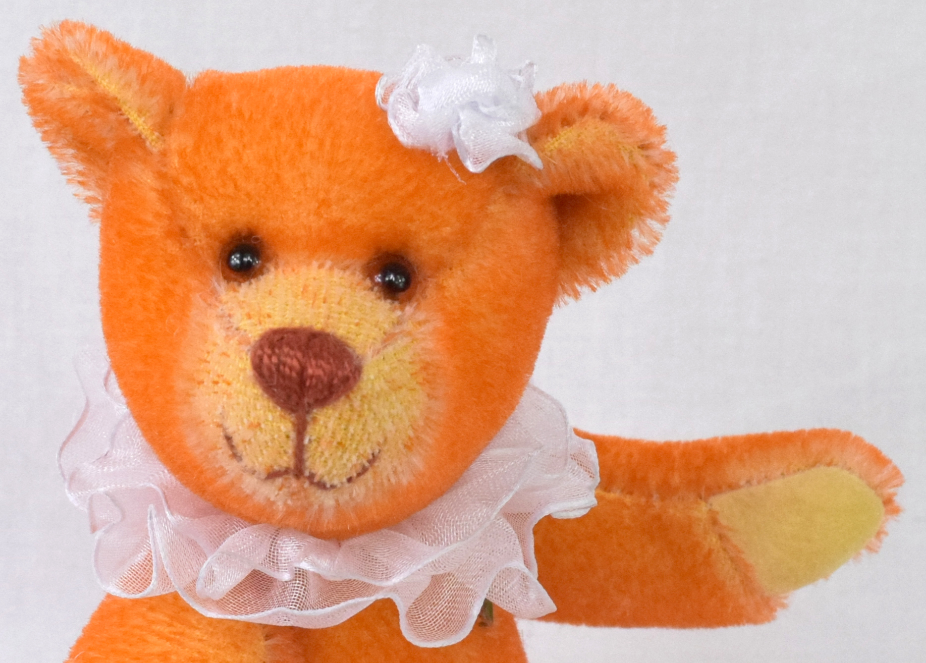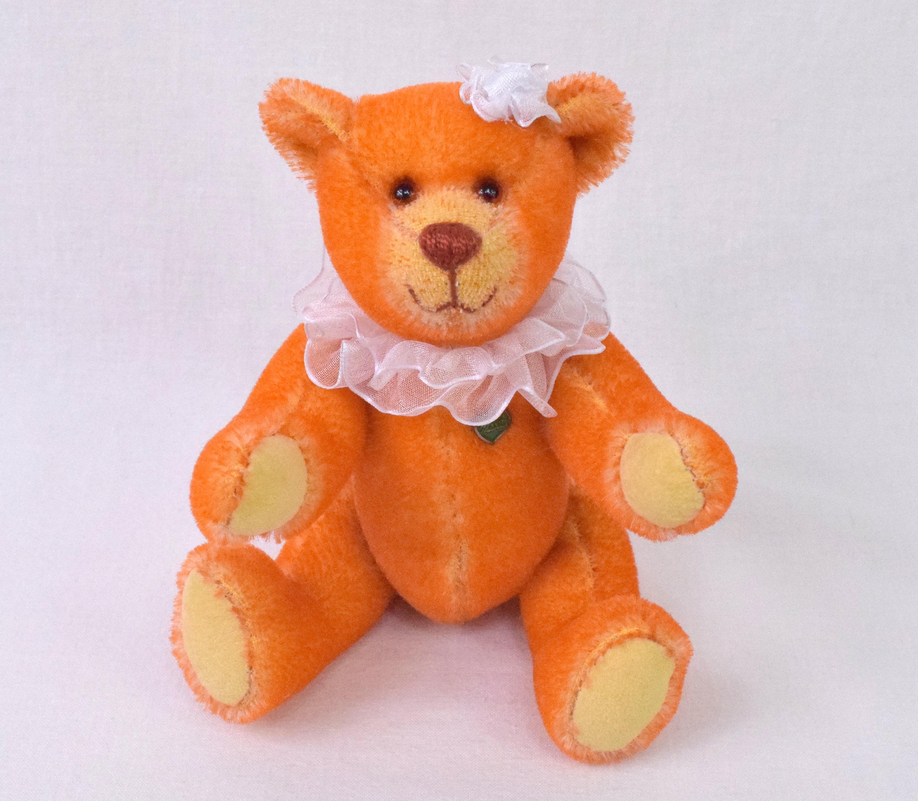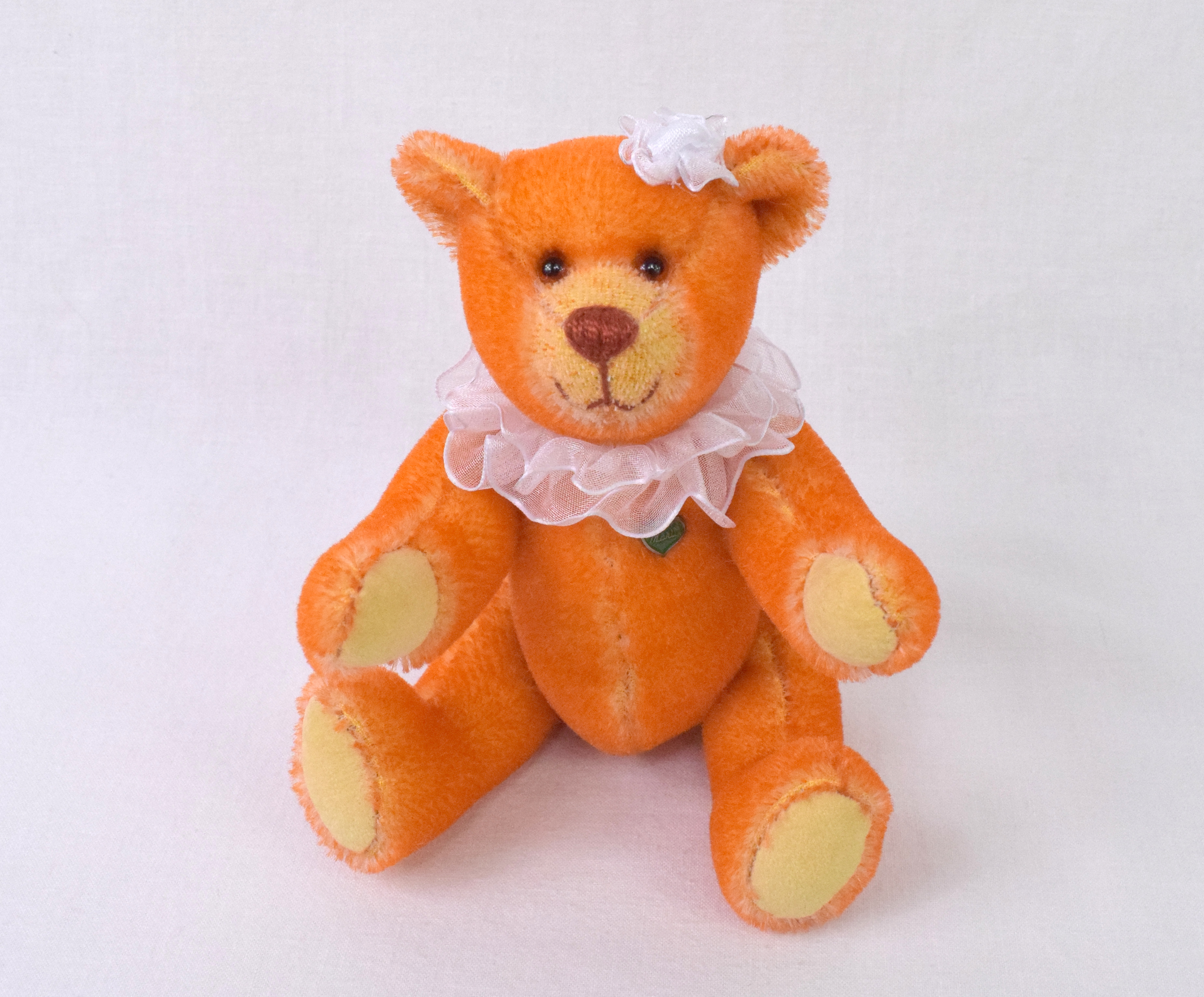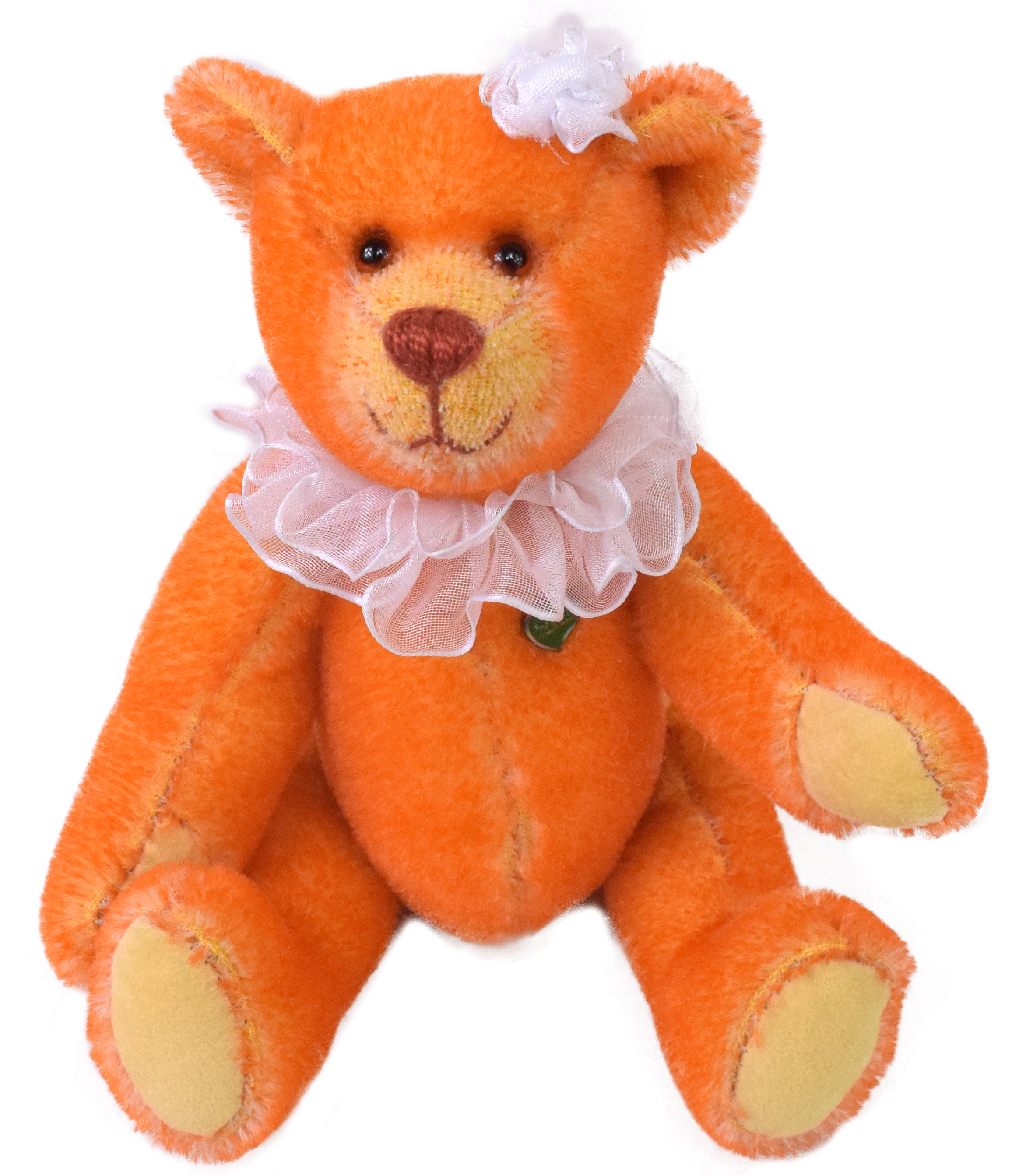Mhhh, das Aprikosenschnittchen ist 19cm groß und strahlt im kräfigem Orange! Das süße Bärchen trägt eine weiße Krause und ein Sahnehäubchen auf dem Kopf.