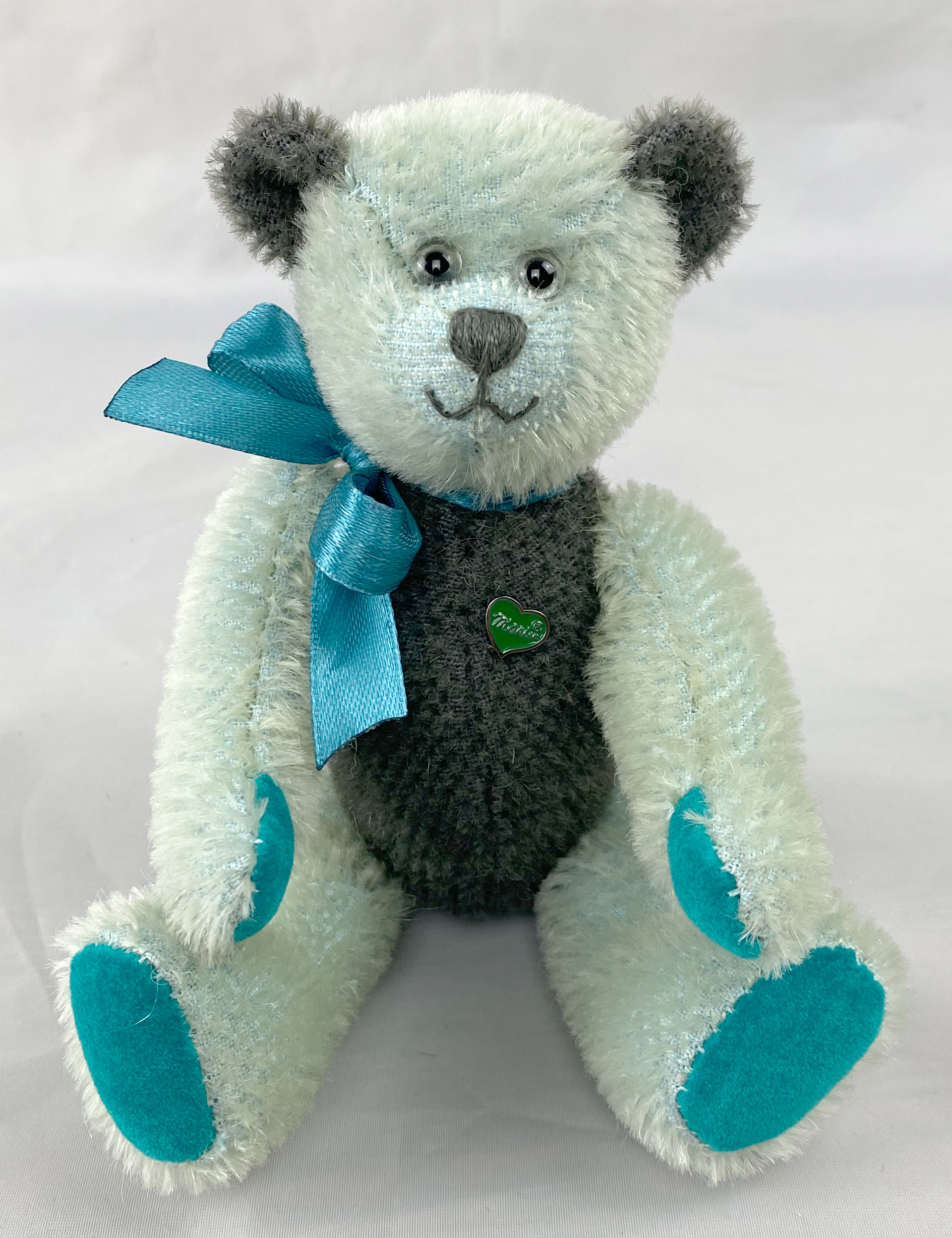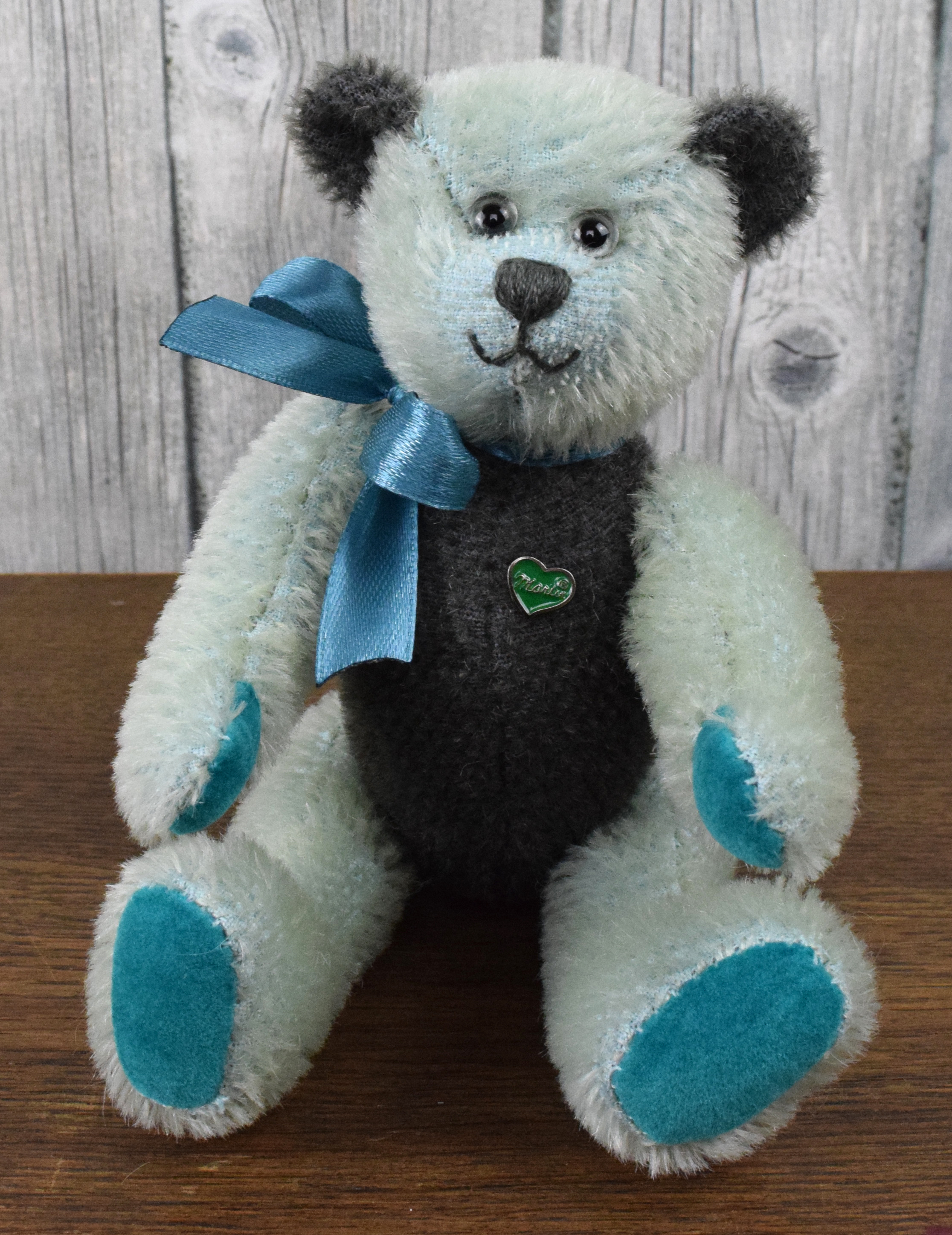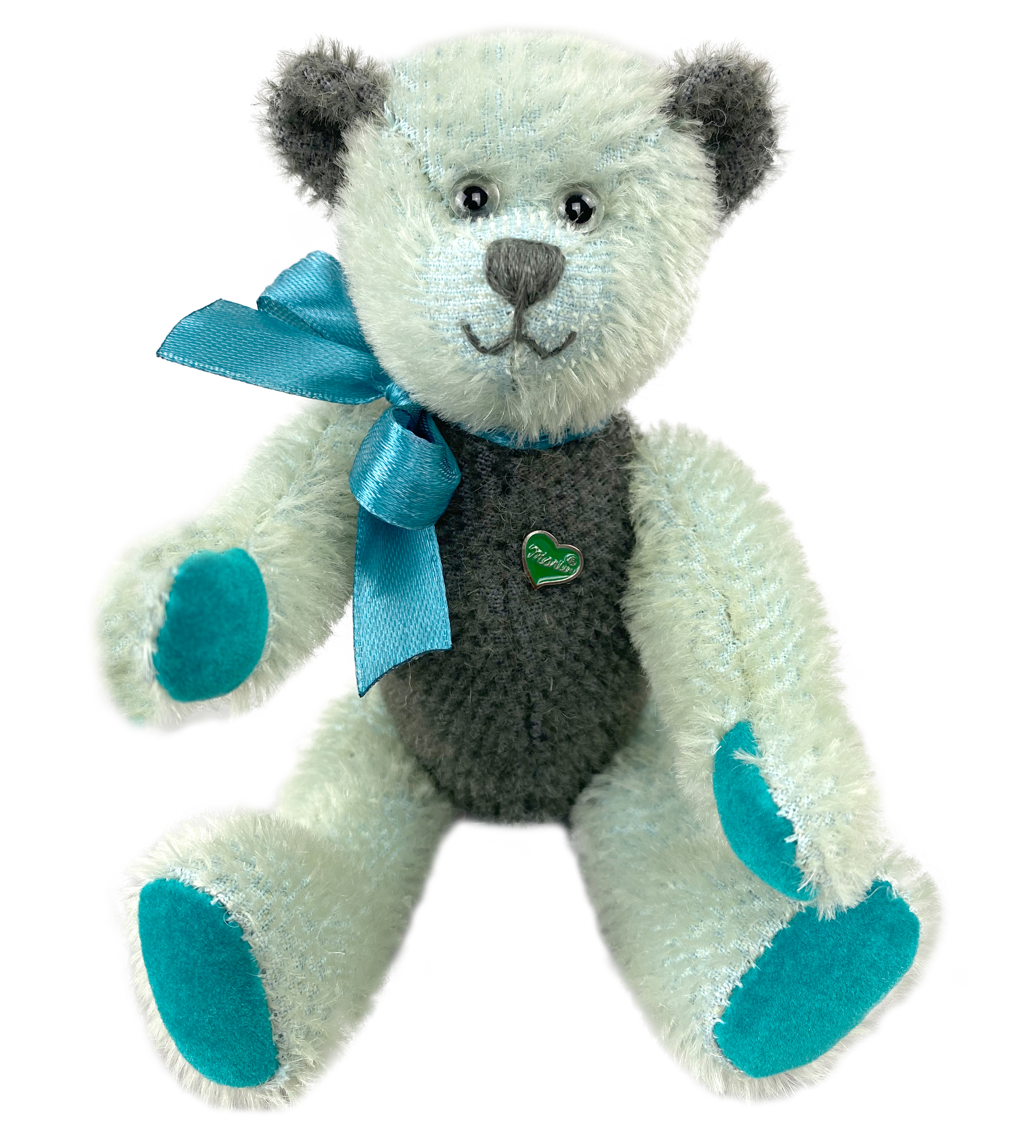 Dieser liebe Bär hat kurzes Mohairfell in zwei verschiedenen Farben (mint und dunkelgrau). Die hellen Glasaugen heben sich gut ab und passen gut zum grau bestickten Schnäuzchen. Der Teddy hat graue Ohren und einen dunklen Körper. Die waschledernen Sohlen sind in einem kräftigen Petrolton gestaltet. Eine blaugrüne Schleife dient als hübsches Accessoire. Der Teddy ist 17 cm groß und mit Vlies gefüllt. Der bärige Freund hat eine rasierte Nase und ein süßes Lächeln.