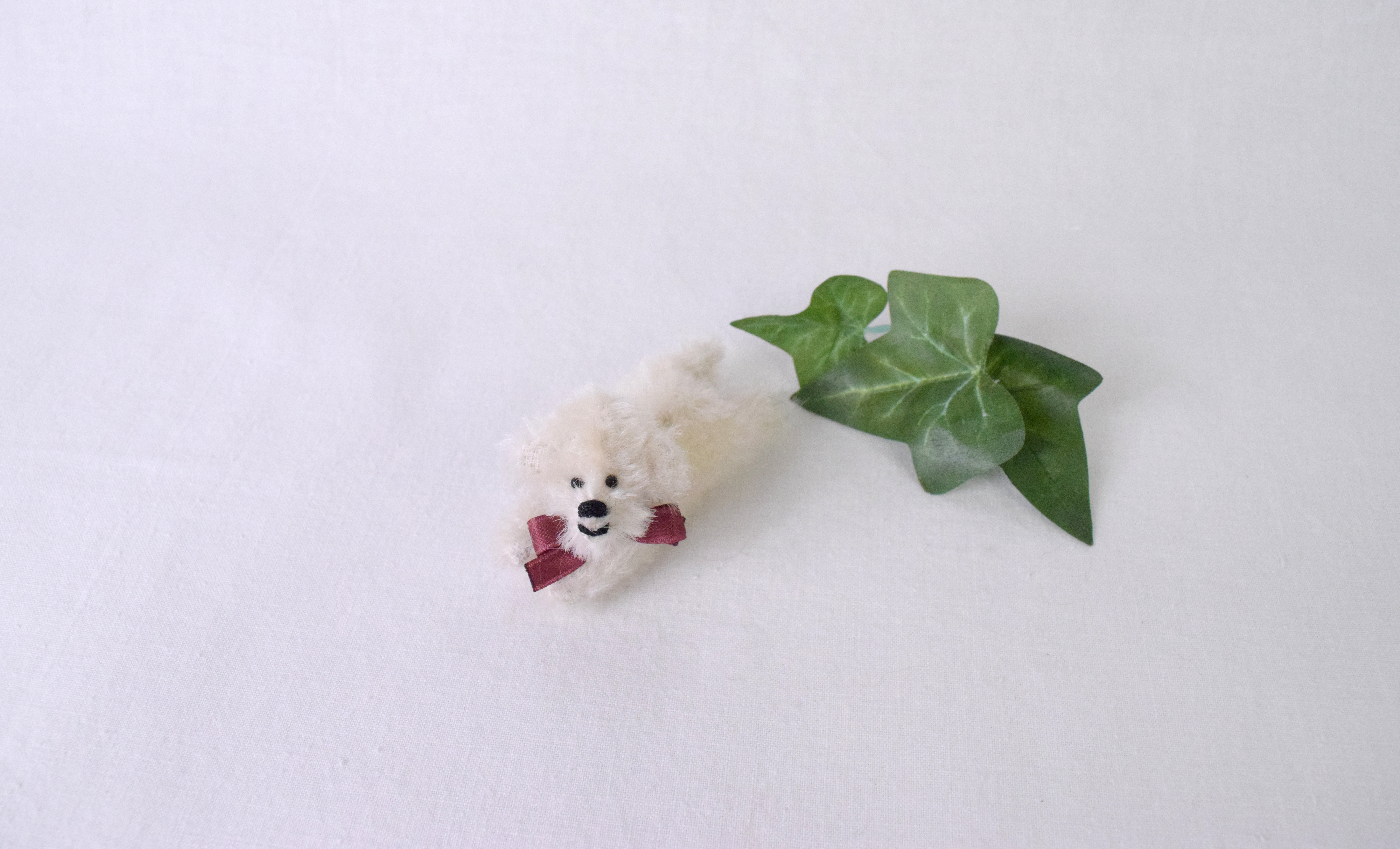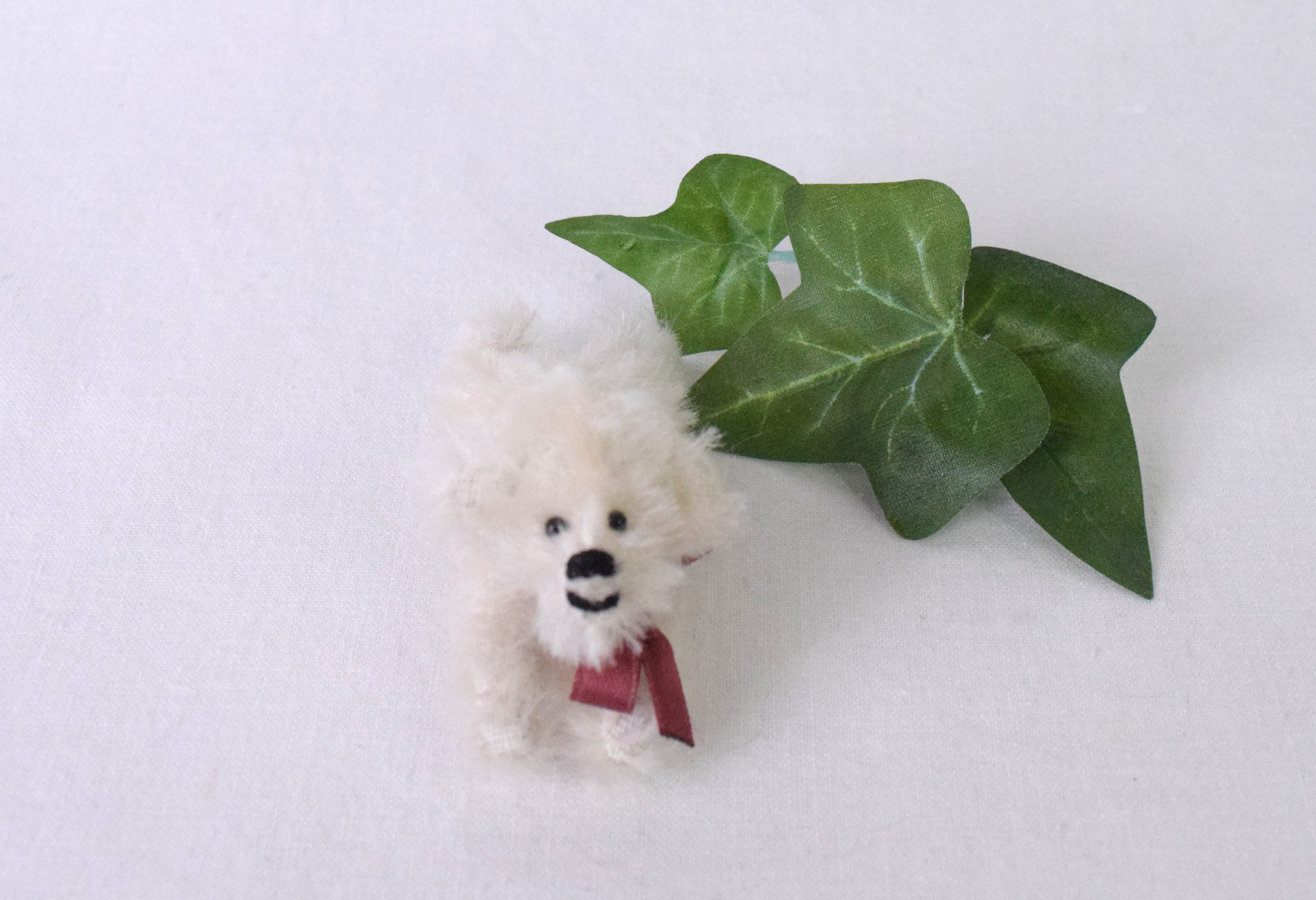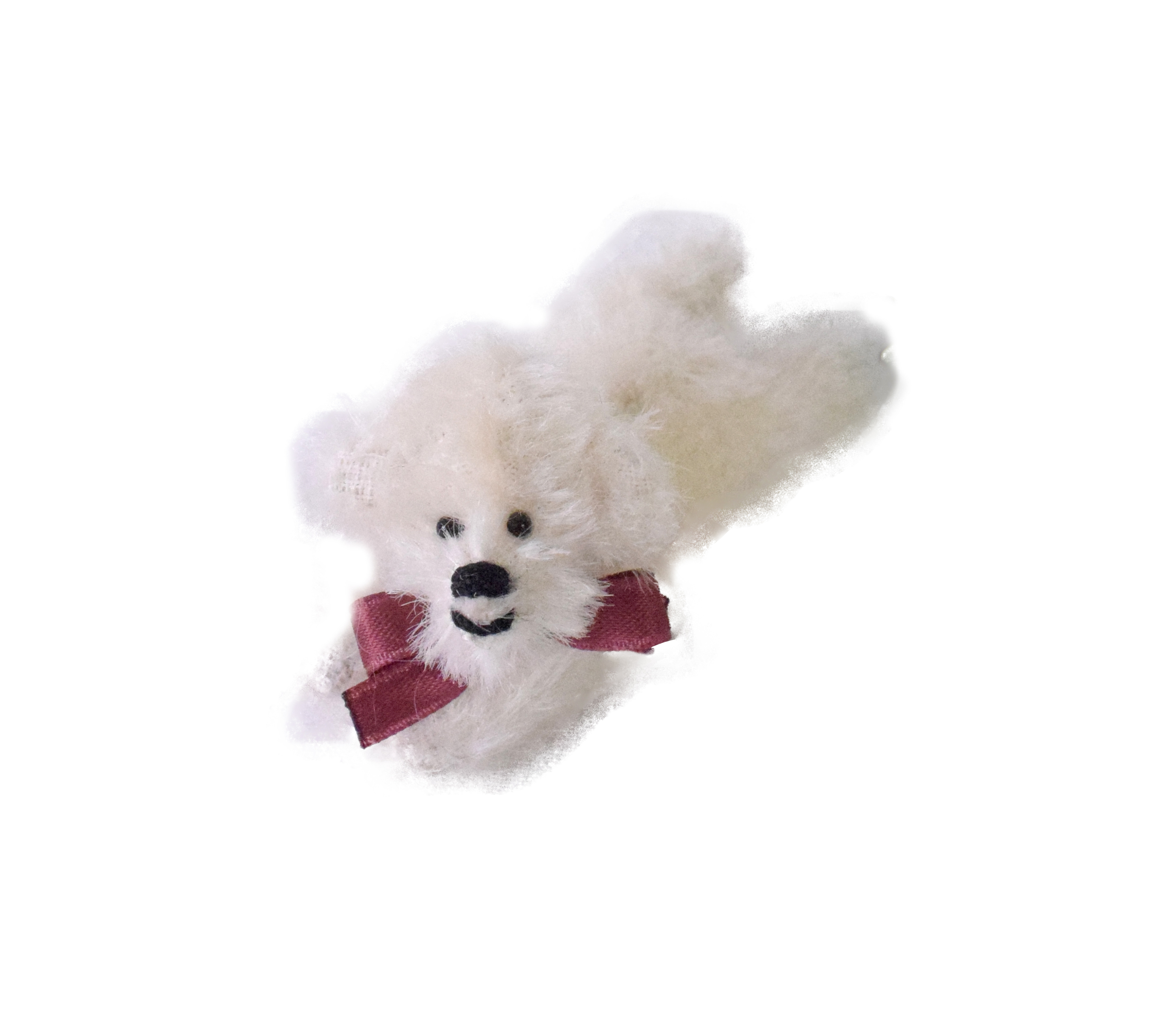 Mini Mohair Hündchen Fiffi liegt auf dem Bach, streckt alle Viere von sich und lässt es sich gut gehen. Liegend ist Fiffi 6cm lang. Das bewegliche Köpfen schaut sich neugierig um. Fiffi ist aus weißem Mohair gefertigt, mit Holzwolle gefüllt und trägt eine bordeauxrote Schleife.