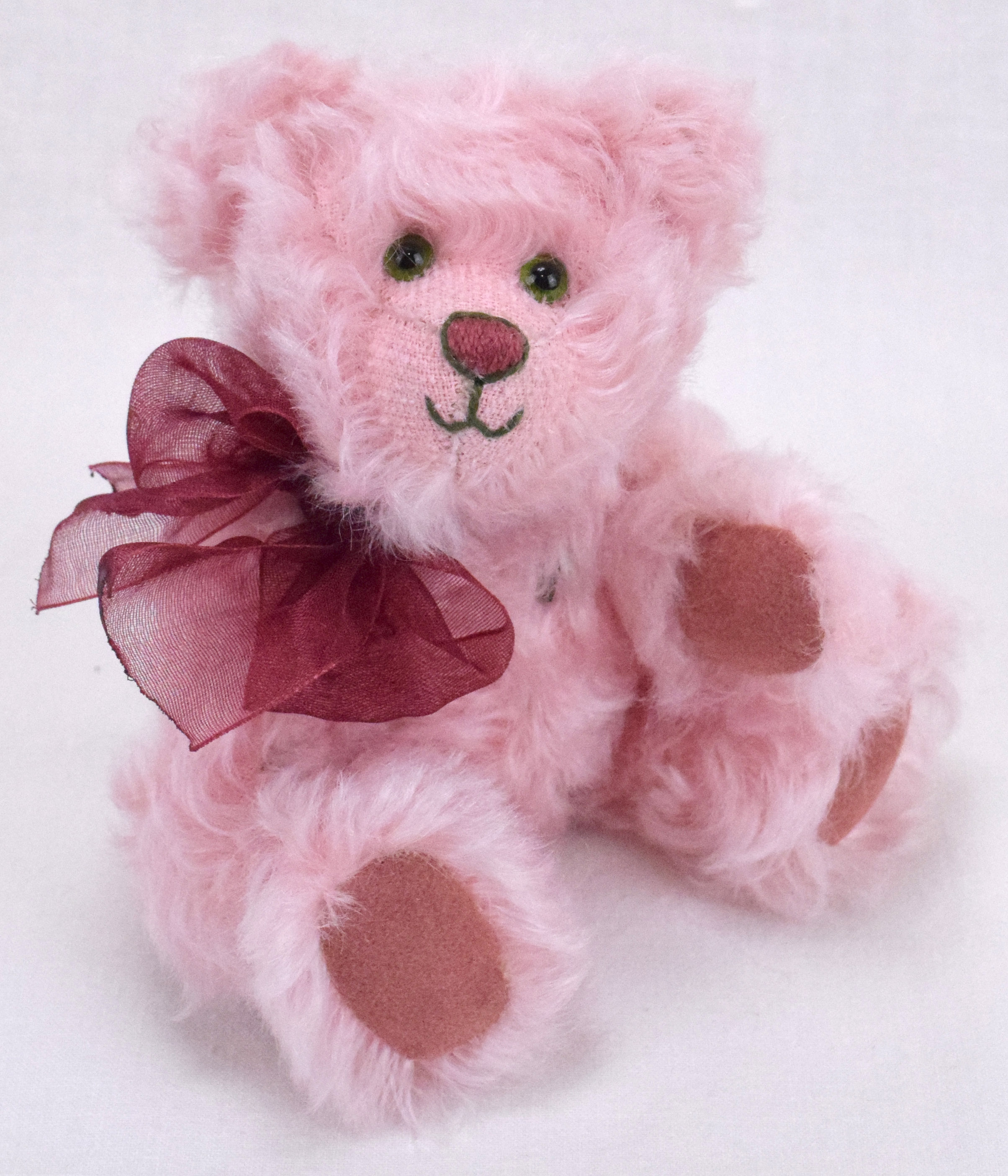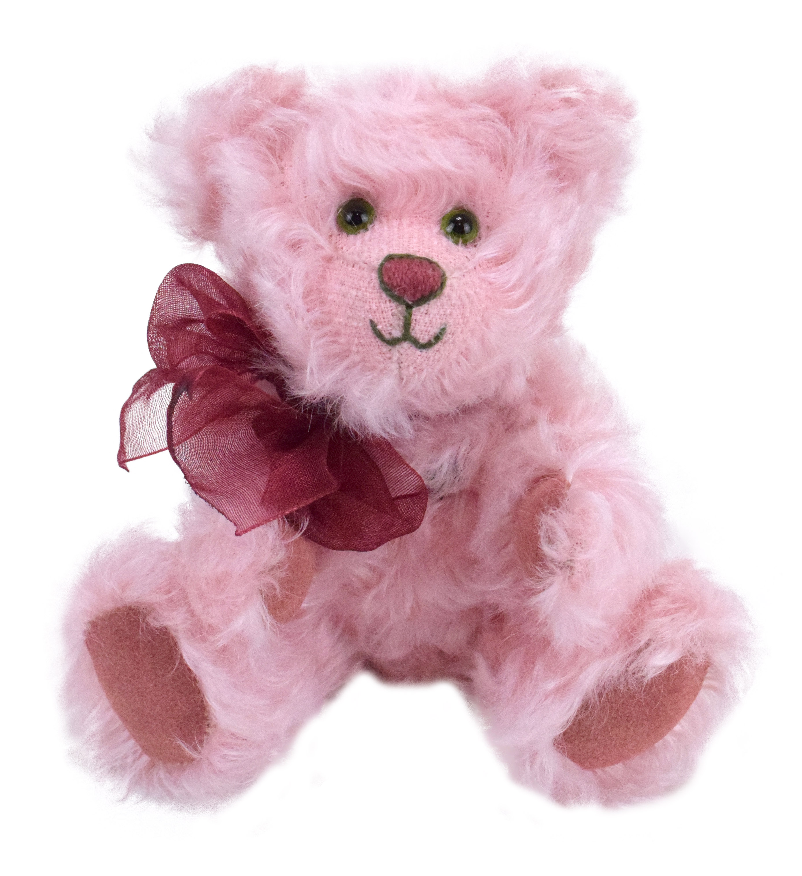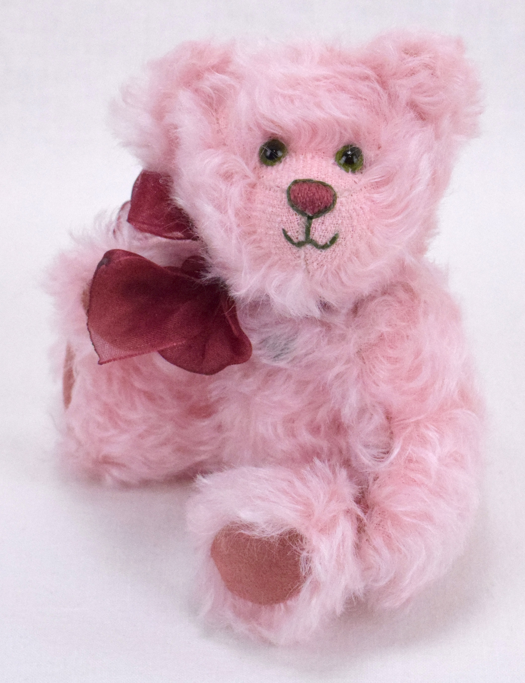 Inspiriert von den wunderschönen rosafarbenen Pfingstrosen, haben wir dieses dufte Bärchen entworfen. Das hübsche Bärchen mit den großartigen grünen Augen trägt rosafarbenes, gelocktes Mohairfell. Auch Pfoten und Sohlen sind aus rosa Waschleder eingesetzt. Das rasierte Schnäuzchen ist mit rosa und grünem Garn farblich passend bestickt. Eine hübsche weinrote Schleife ziert den Hals des Teddys.