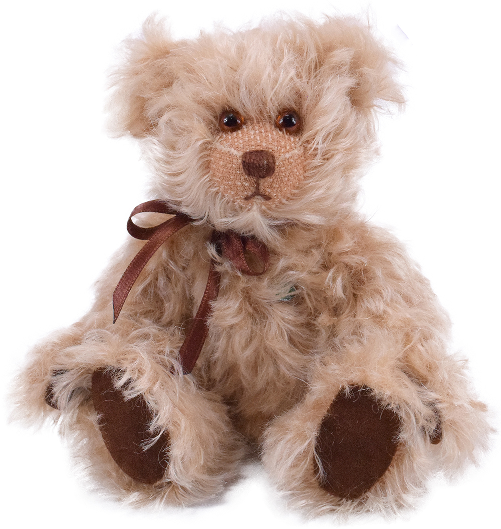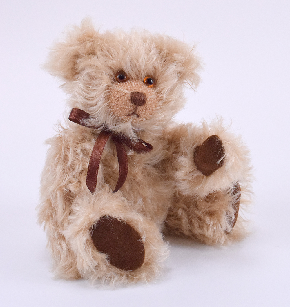 Teddybär Ole hat braune Glasaugen, die ihm einen süßen Blick verleihen. Seine Sohlen und Pfoten sind aus dunkelbraunem Waschleder eingesetzt. Um den Hals trägt Ole eine passende, braune Schleife.