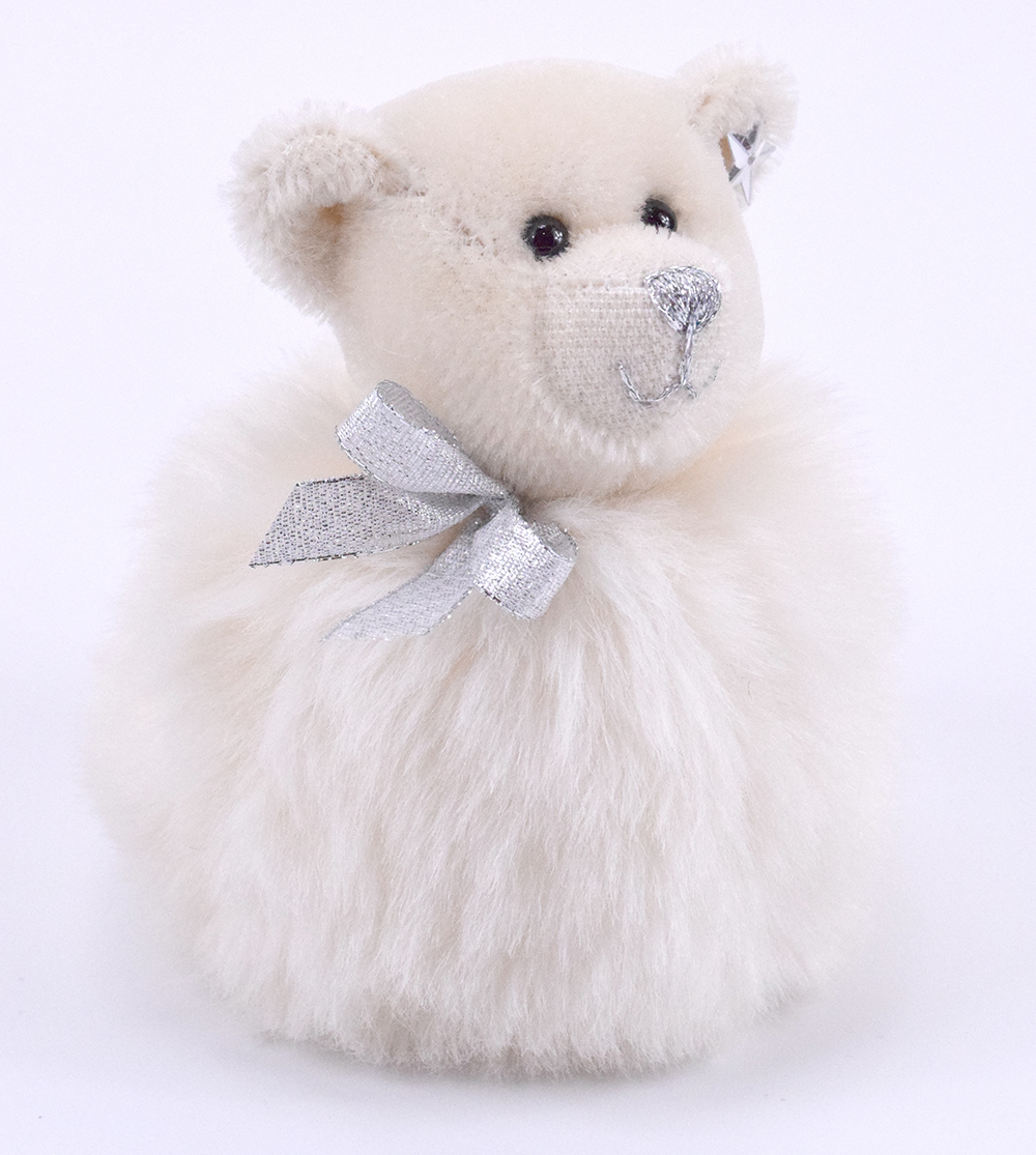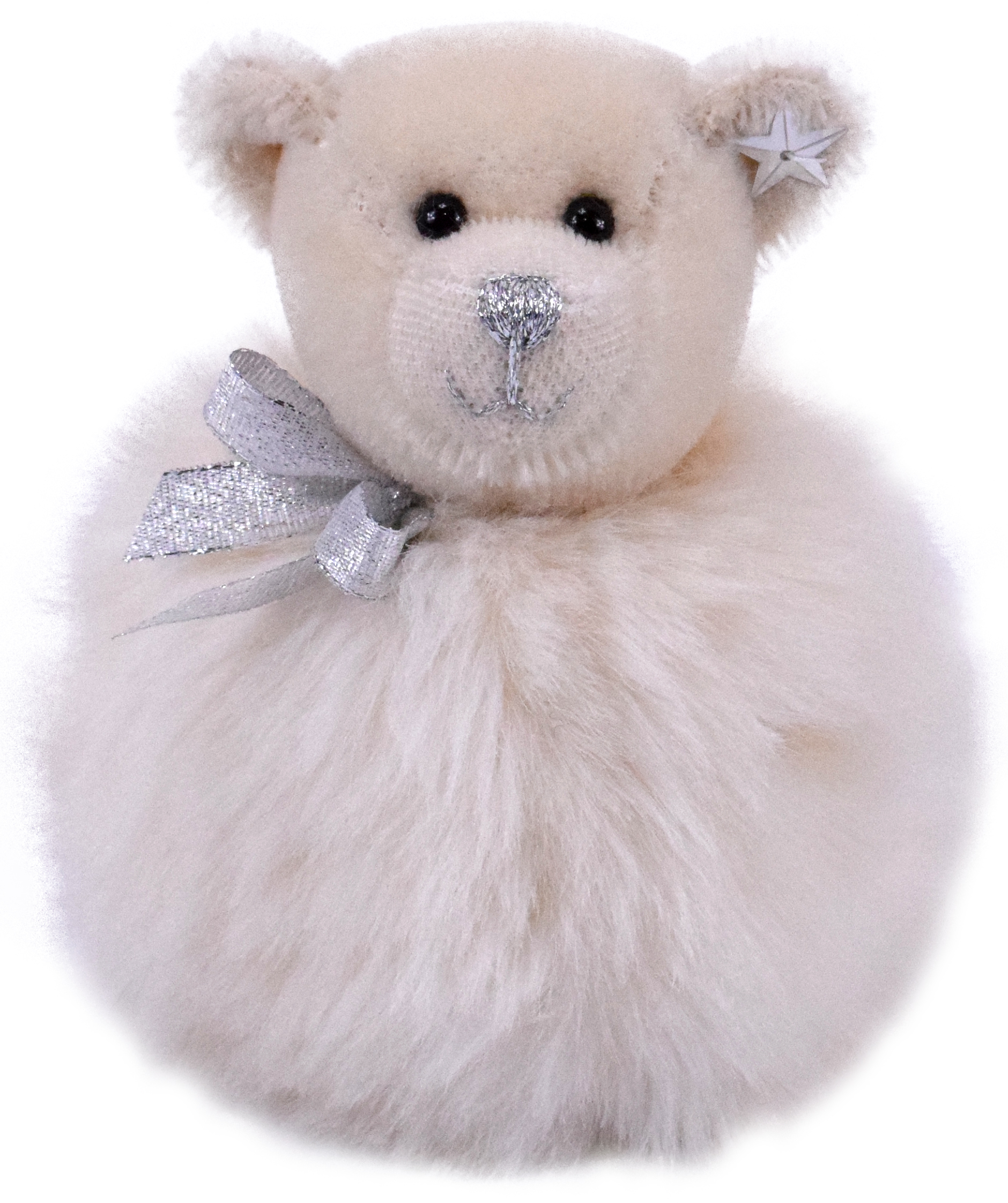 Das Schneebällchen hat einen ganz weichen, weißen und sehr wuscheligen Körper, der rund ist wie ein Schneeball. Oben auf ist ein Teddykopf mit Glasaugen und handgesticktem Gesicht. Verziert ist das 15cm große Schneebällchen mit einem (Schnee-) Stern am Ohr und einer silberfarbenen Schleife. Schneebällchen ist mit weicher Vlieswatte und Granulat gefüllt, sodass es alleine stehen kann.