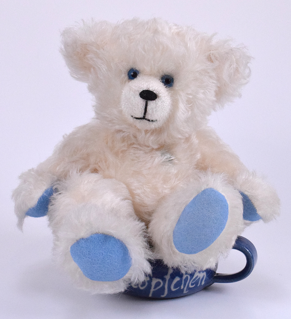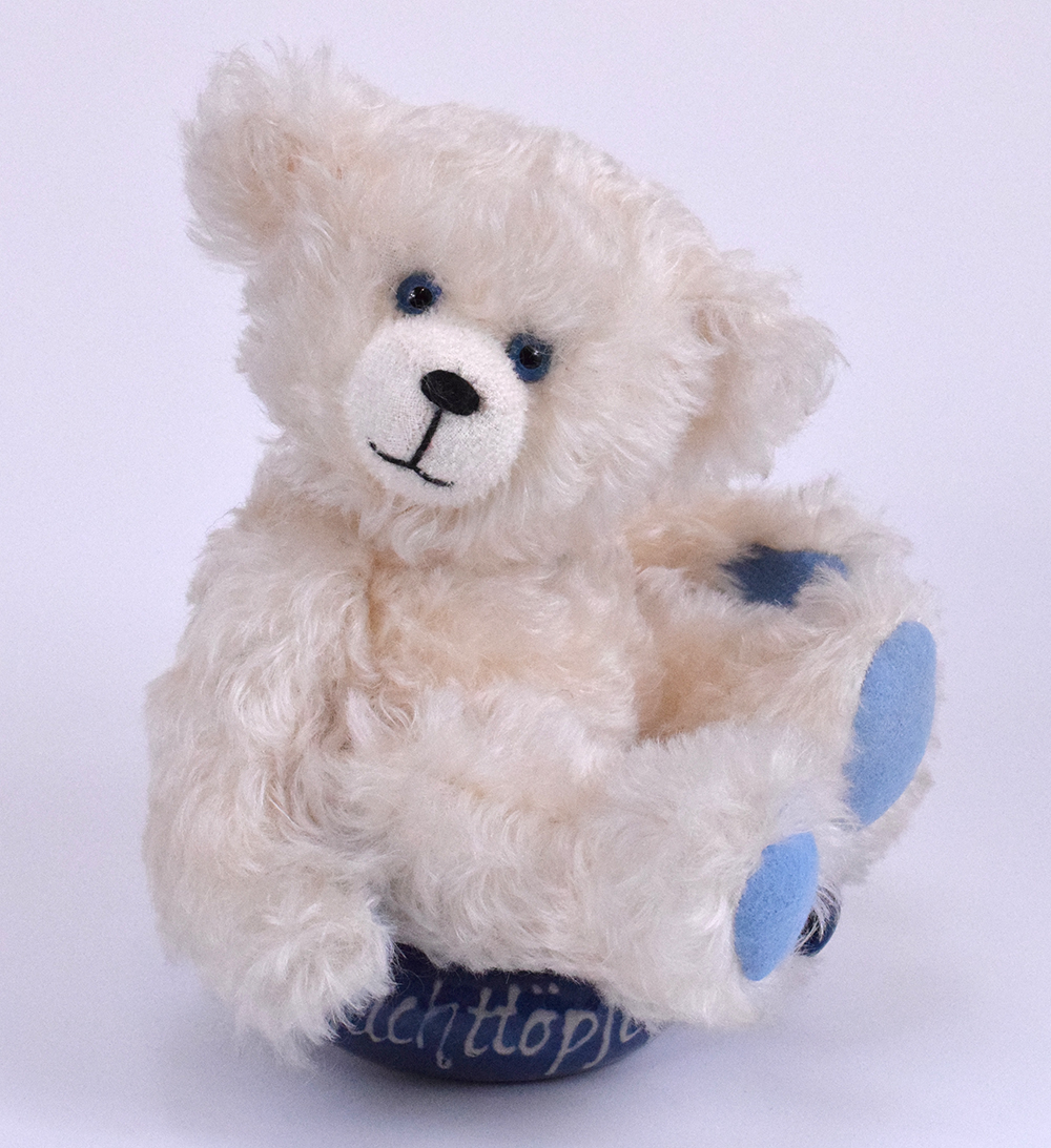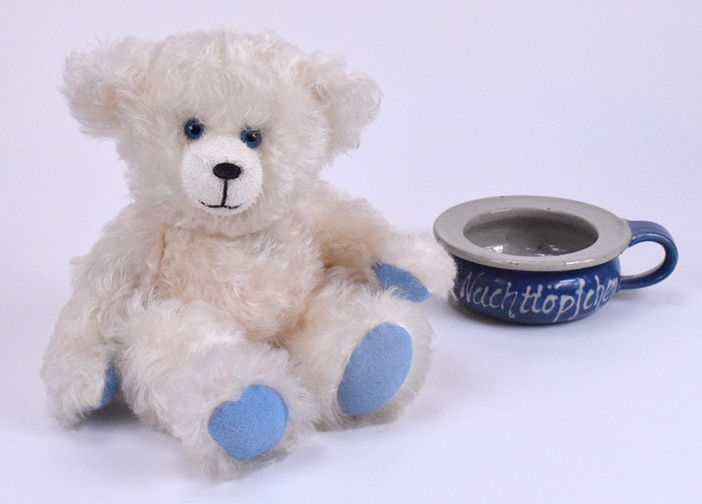 [Neu-Wert: 129,-€] Kevin ist ein kleiner niedlicher Baby-Bär aus weißem Mohairfell mit Wackelköpfchen. Am liebten möchte er schmusen und kuscheln. Dabei hat Kevin seinen Nachttopf, auf dem auch kunstvoll "Nachttöpfchen" geschrieben steht. Teddybär ist 28cm groß, sein Nachttopf hat einen Durchmesser von 11,5cm, ideal um Kevin daraufzusetzen.